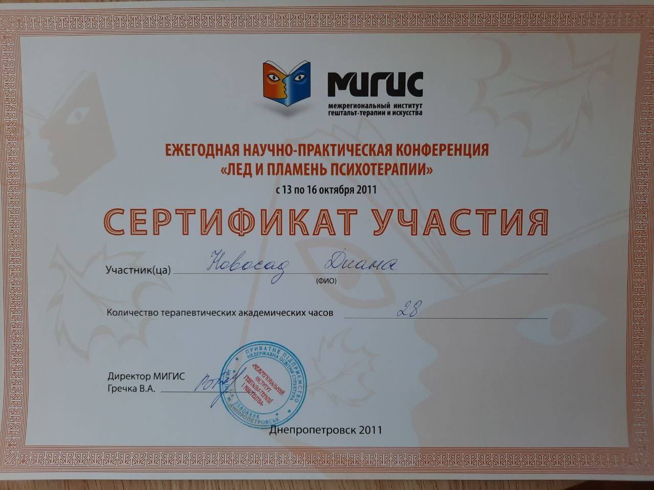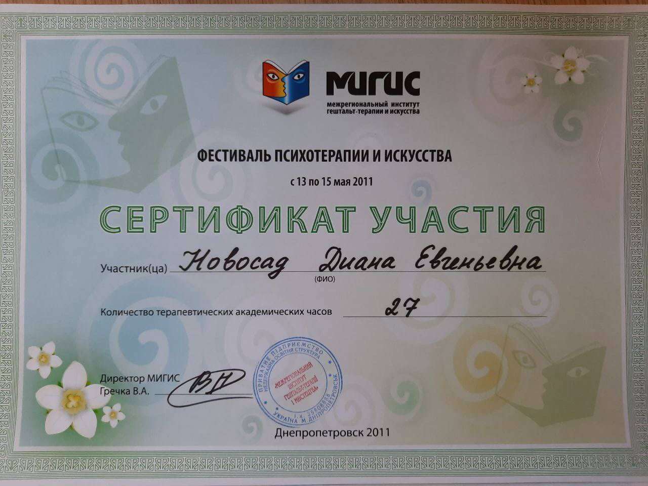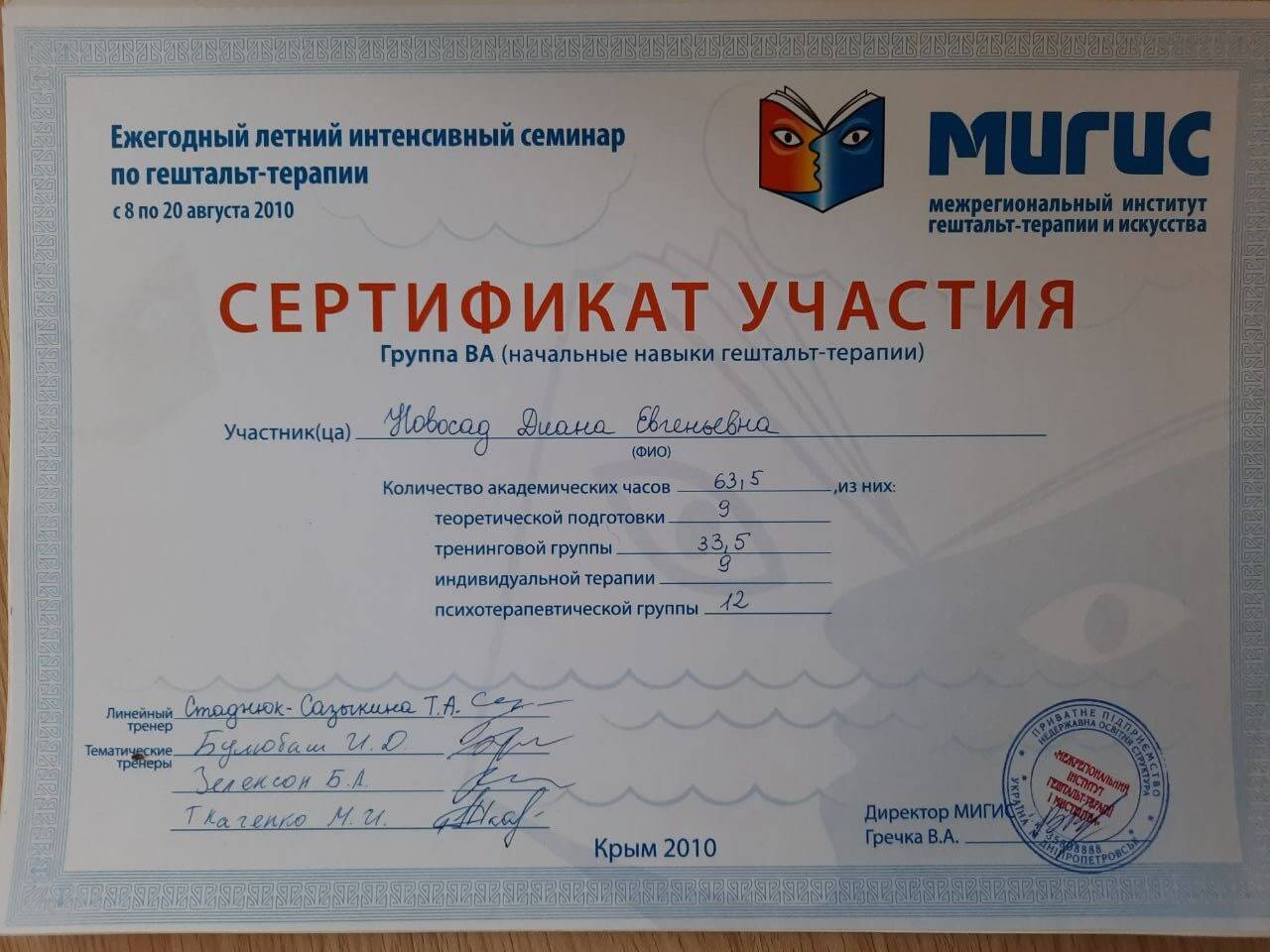 - МИГИС "Гештальт-подход в терапии психосоматических расстройств" (долговременная программа профессионального тренинга 126 час.)
