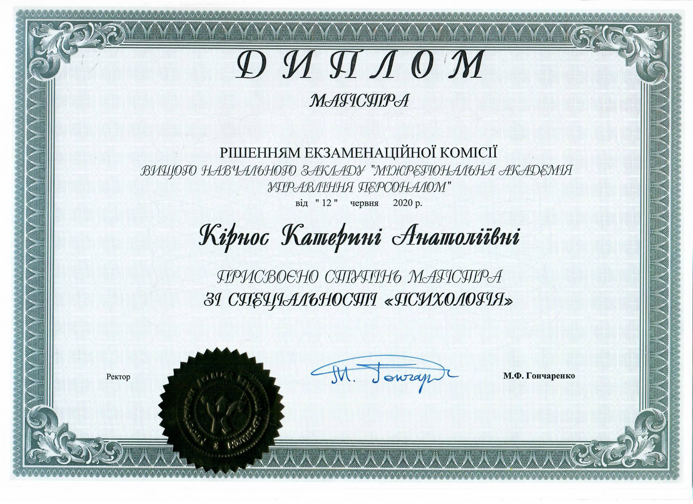 Міжрегіональний інститут гештальт-терапії та мистецтва (МІГТІМ), «Теорія і практика гештальт-терапії» I, II ступінь.