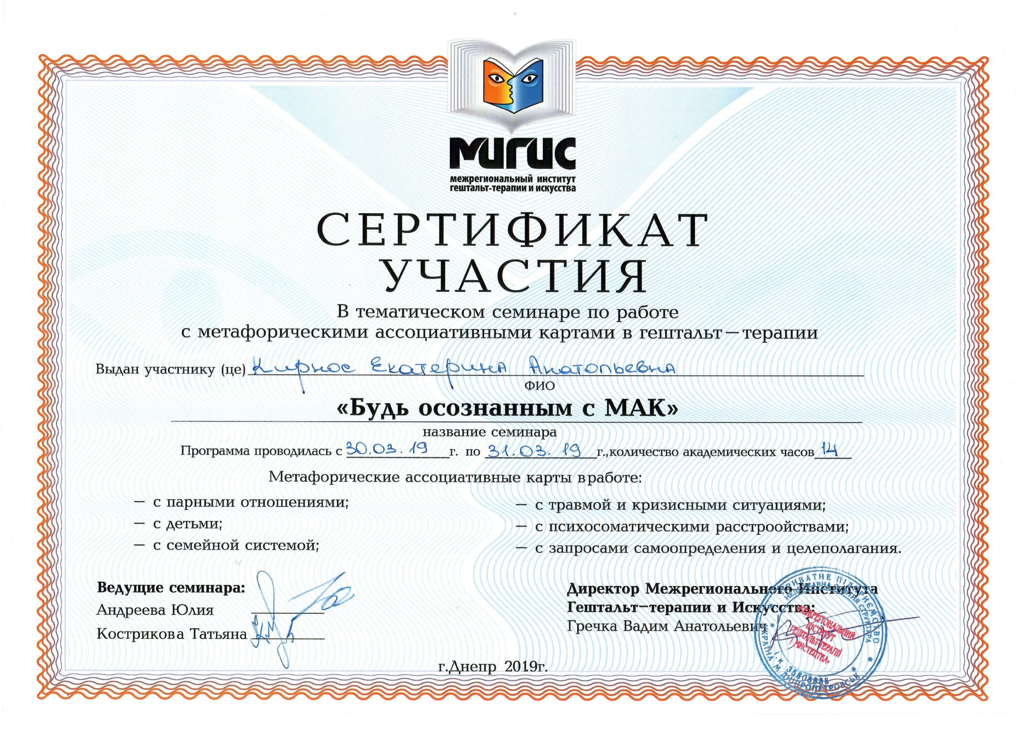 - Міжрегіональний інститут гештальт-терапії та мистецтва (МІГТІМ), тематичний семінар по роботі з метафоричними асоціативними картами в гештальт-терапії «Будь розумним з МАК».