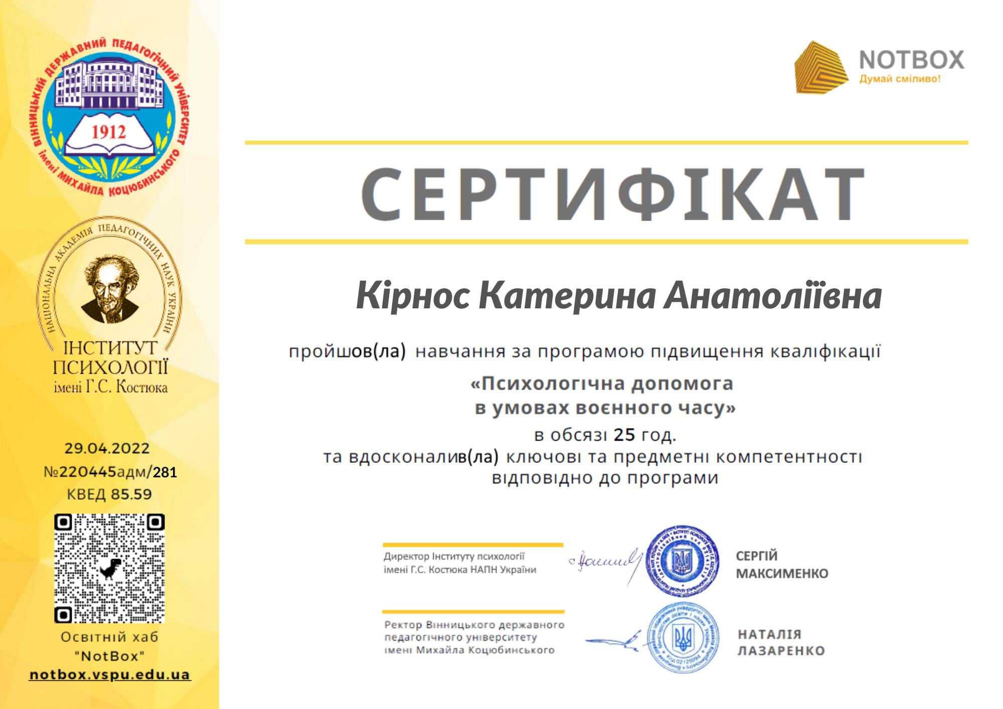- Національній Педагогічний Університет ім. М.П. Драгоманова, Університет класичної та сучасної психології, психотерапії та коучингу, спеціалізована програма «Основи сексології та сексопатології»