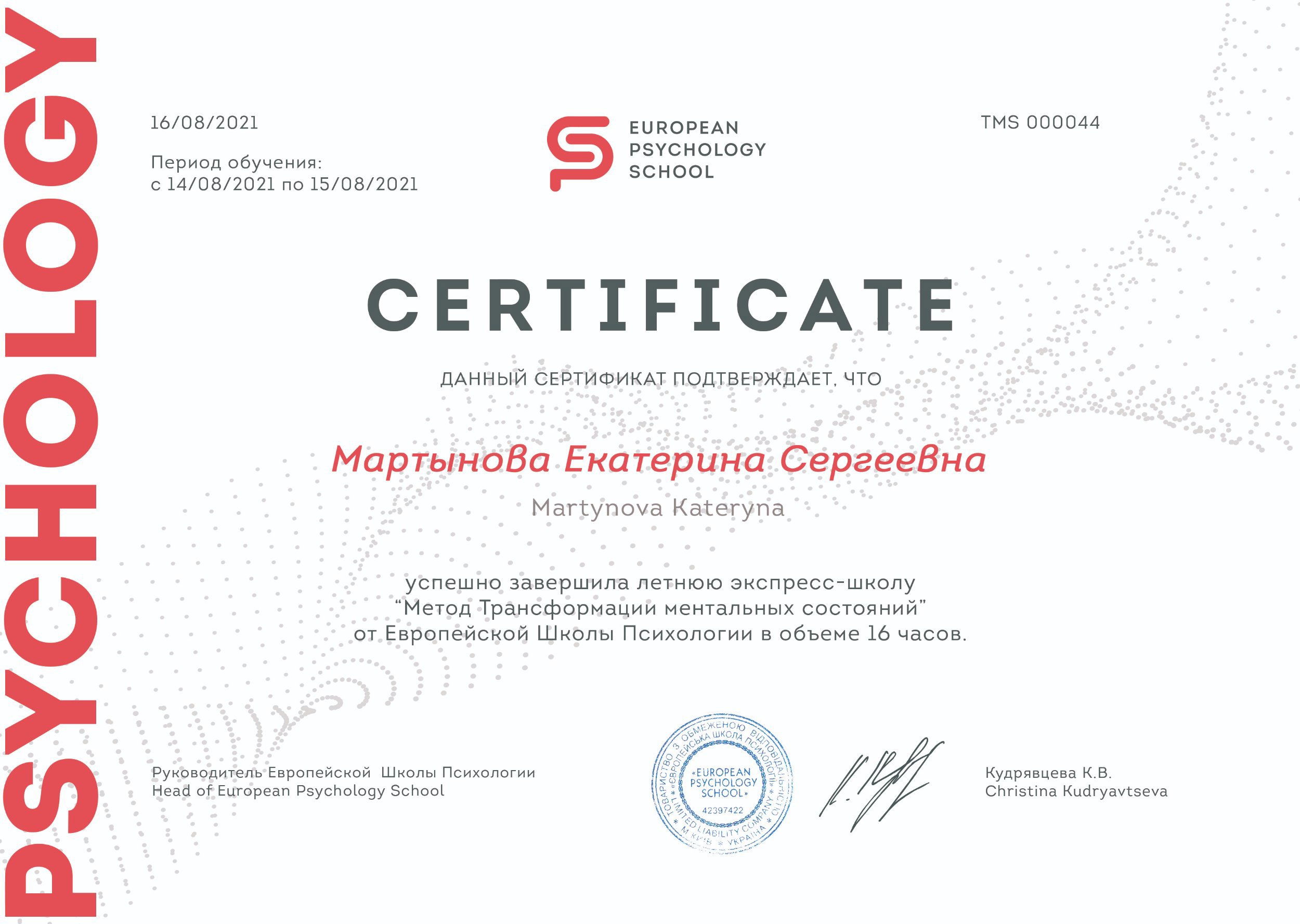 – Эксперсс-школа «Метод трансформации ментальных состояний», ЭШП (2021)