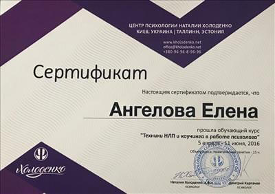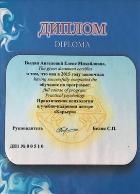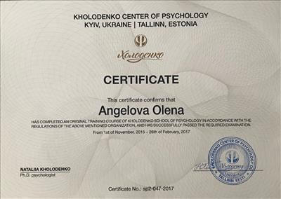 МАУП, практический психолог; МИГИС, гештальт-терапевт; специализация по работе с психосоматическими расстройствами; специализация по работе с детьми и семьями; специализация по работе с пострадавшими от домашнего насилия; Школа психологии Наталии Холоденко.