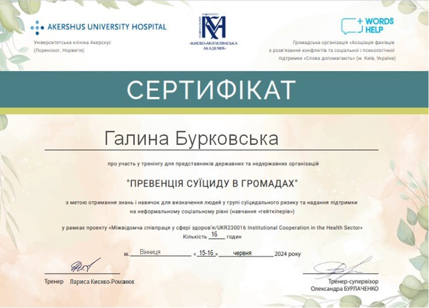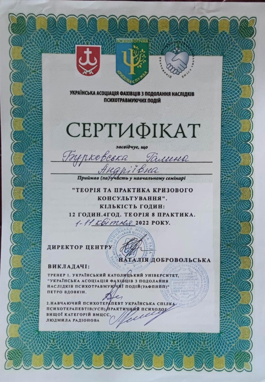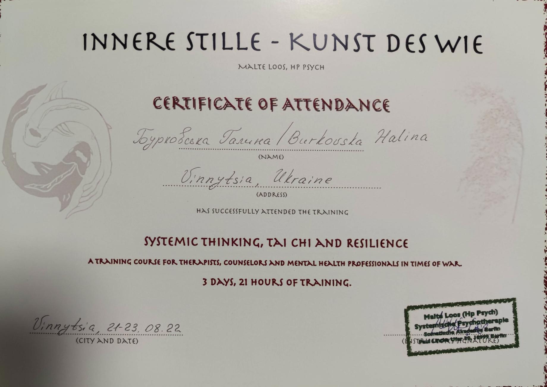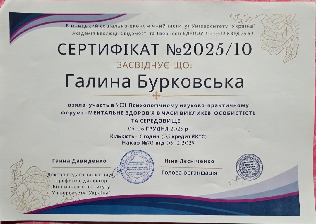 Член союза психотерапевтов УСП и Всеукраинской Арт-терапевтической ассоциации, ГС «Национальная психологическая ассоциация».