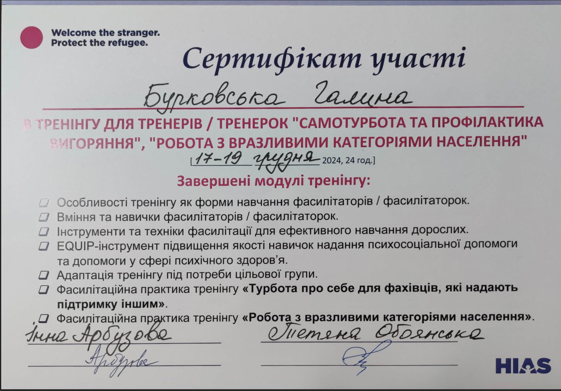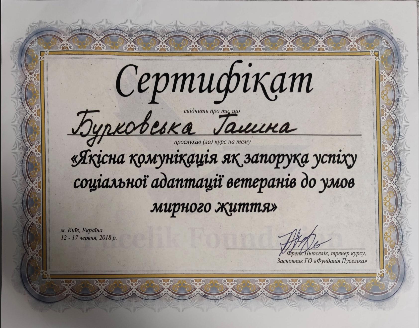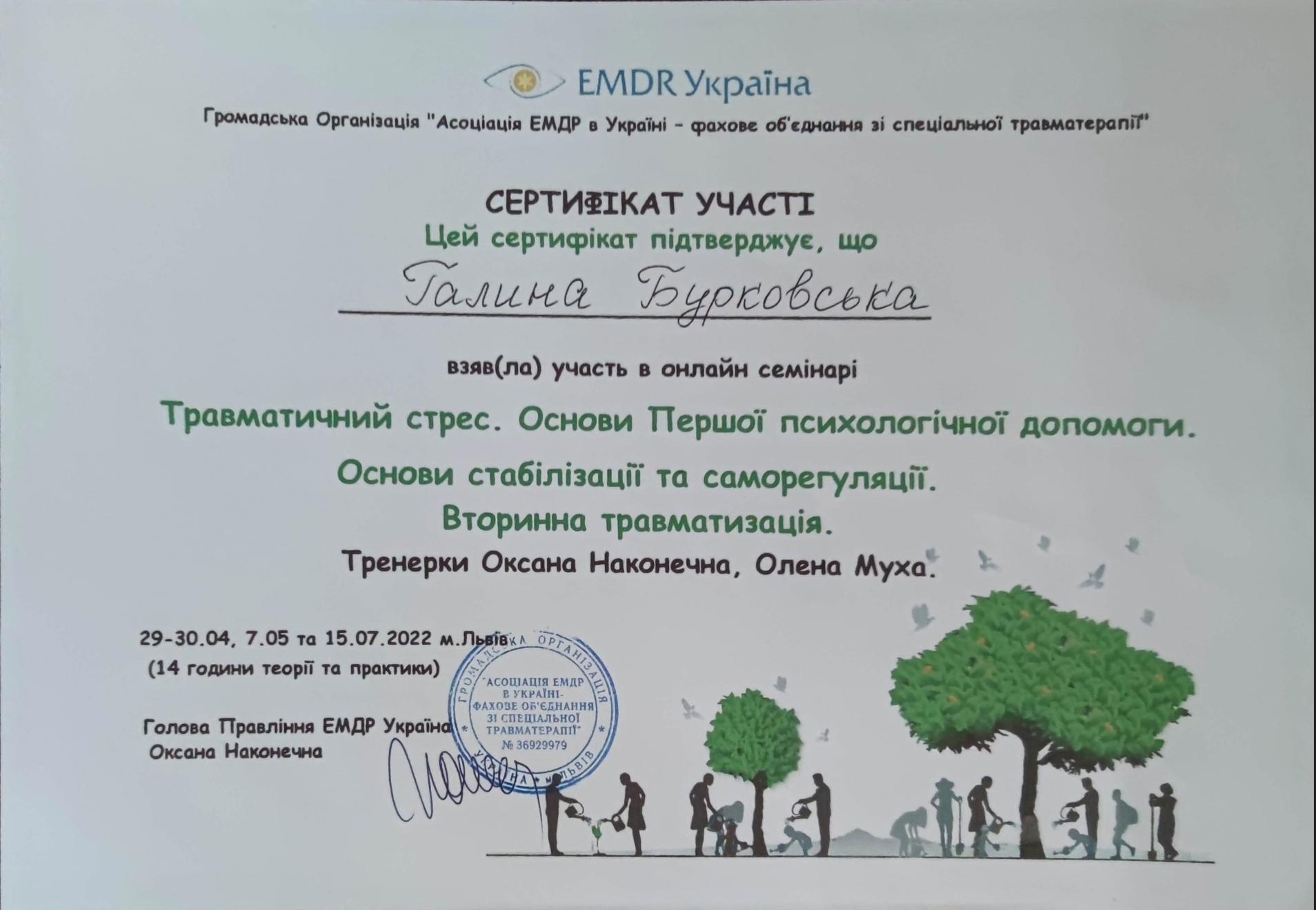 Член союза психотерапевтов УСП и Всеукраинской Арт-терапевтической ассоциации, ГС «Национальная психологическая ассоциация».