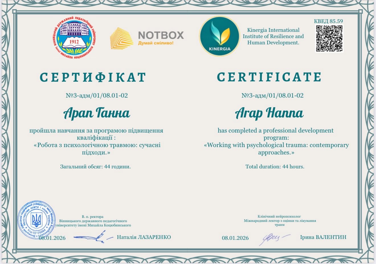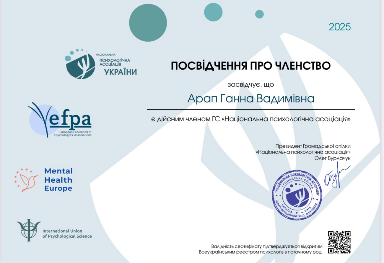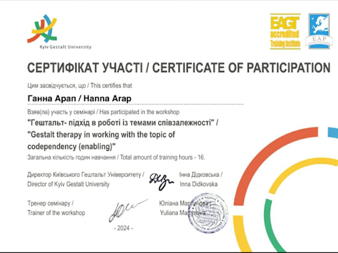 У меня высшее психологическое образование и сейчас учусь в Киевском гештальт университете на гештальт-терапевта.