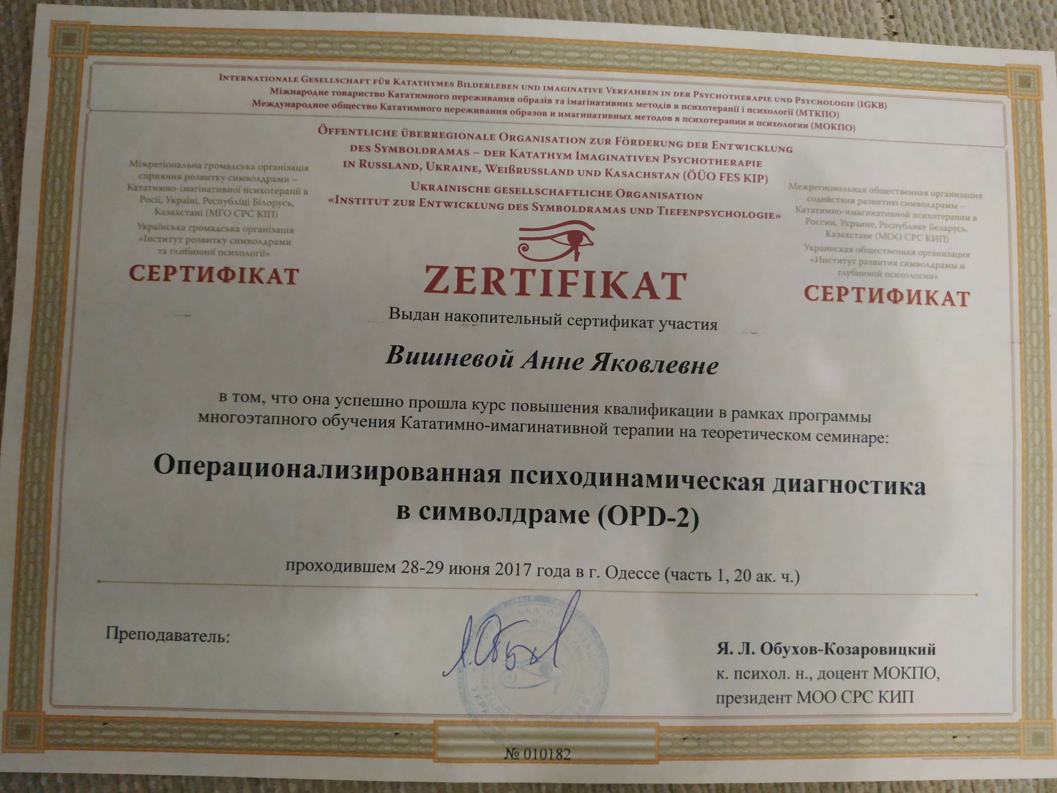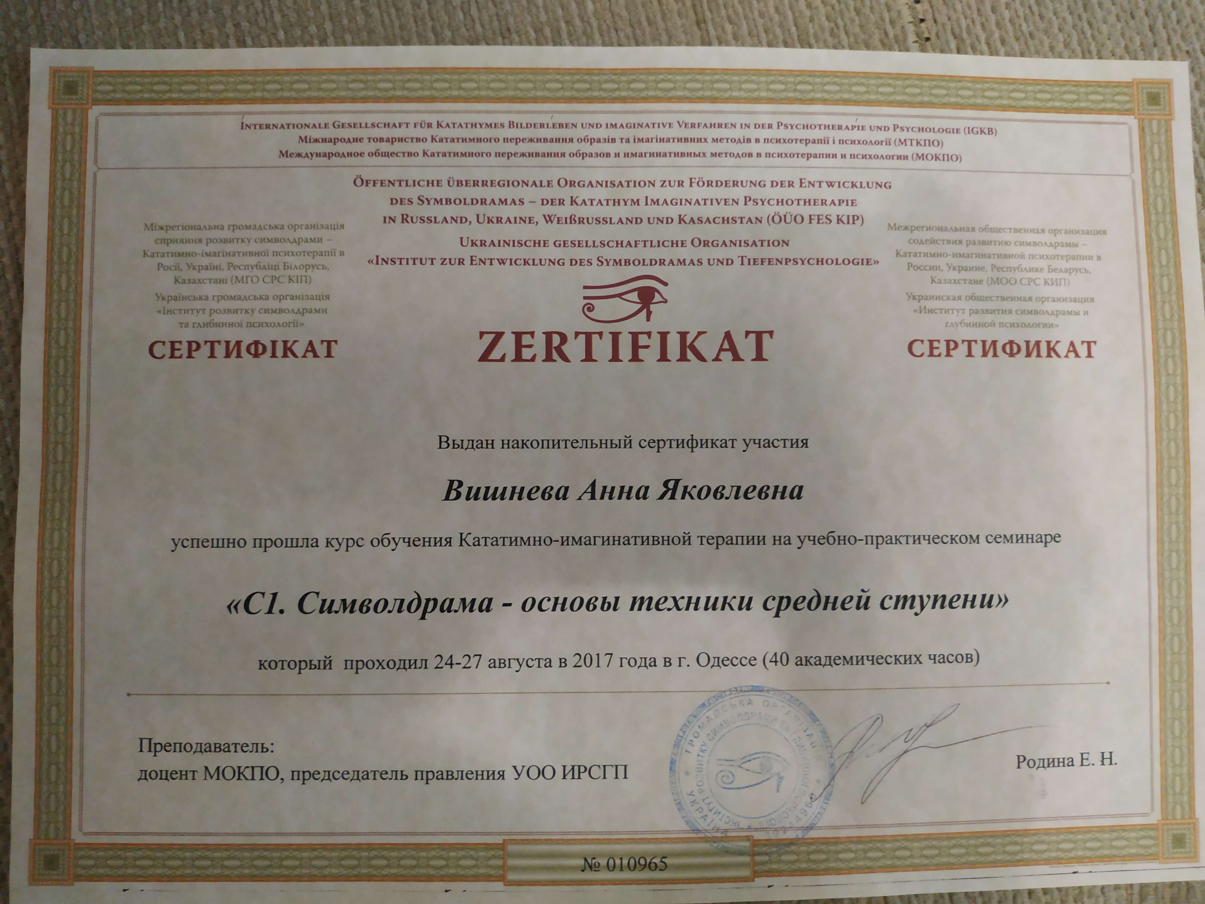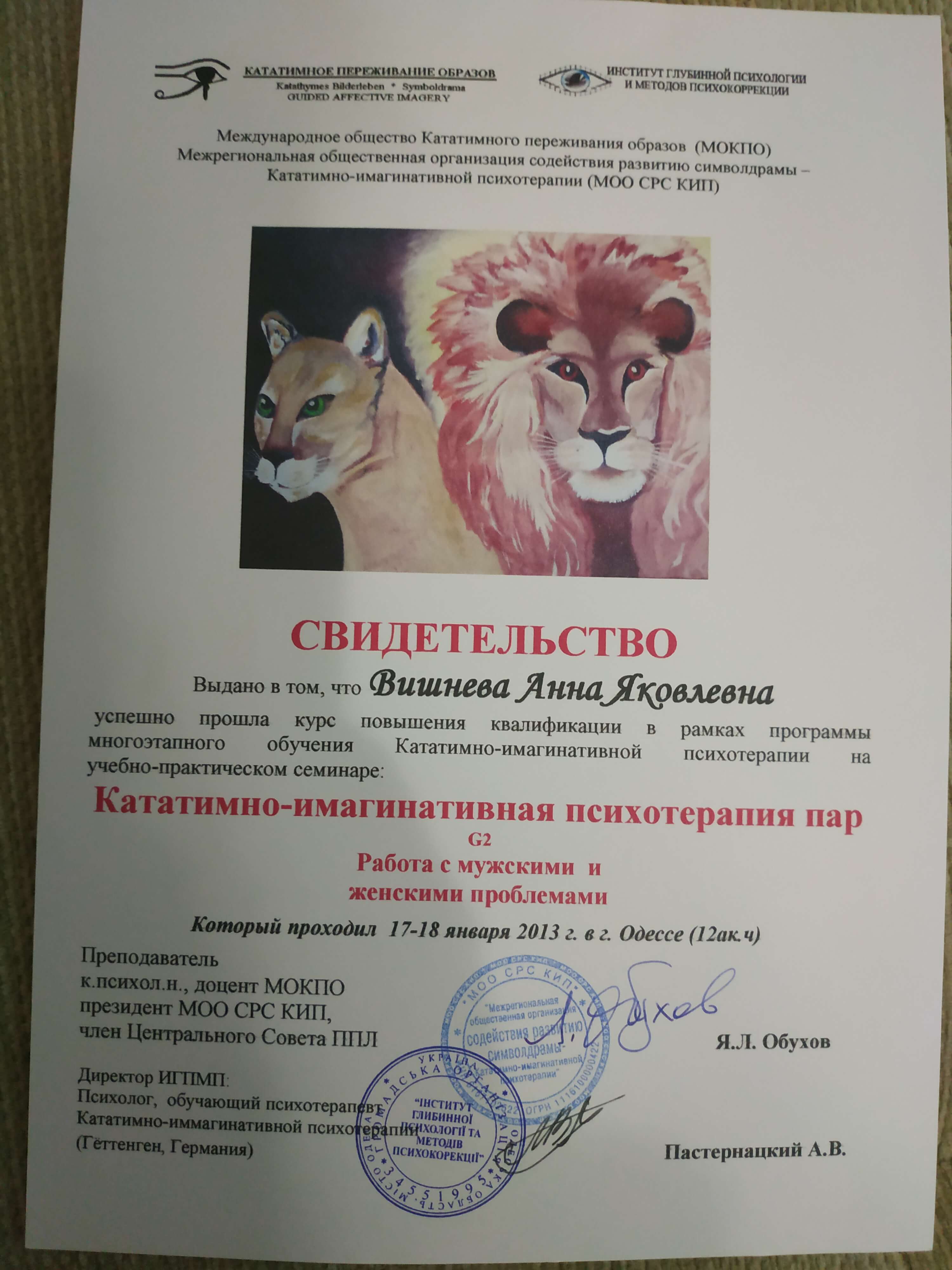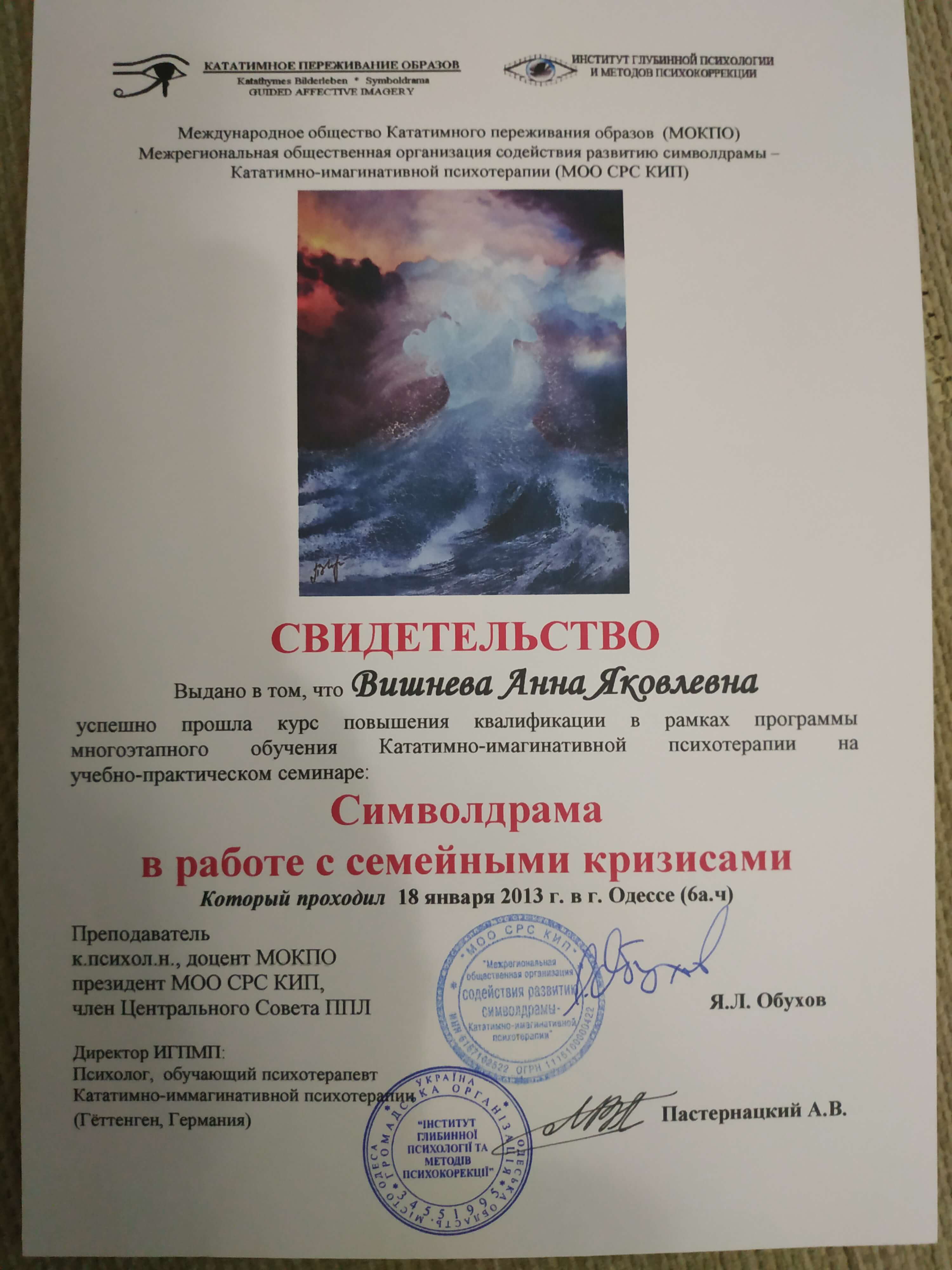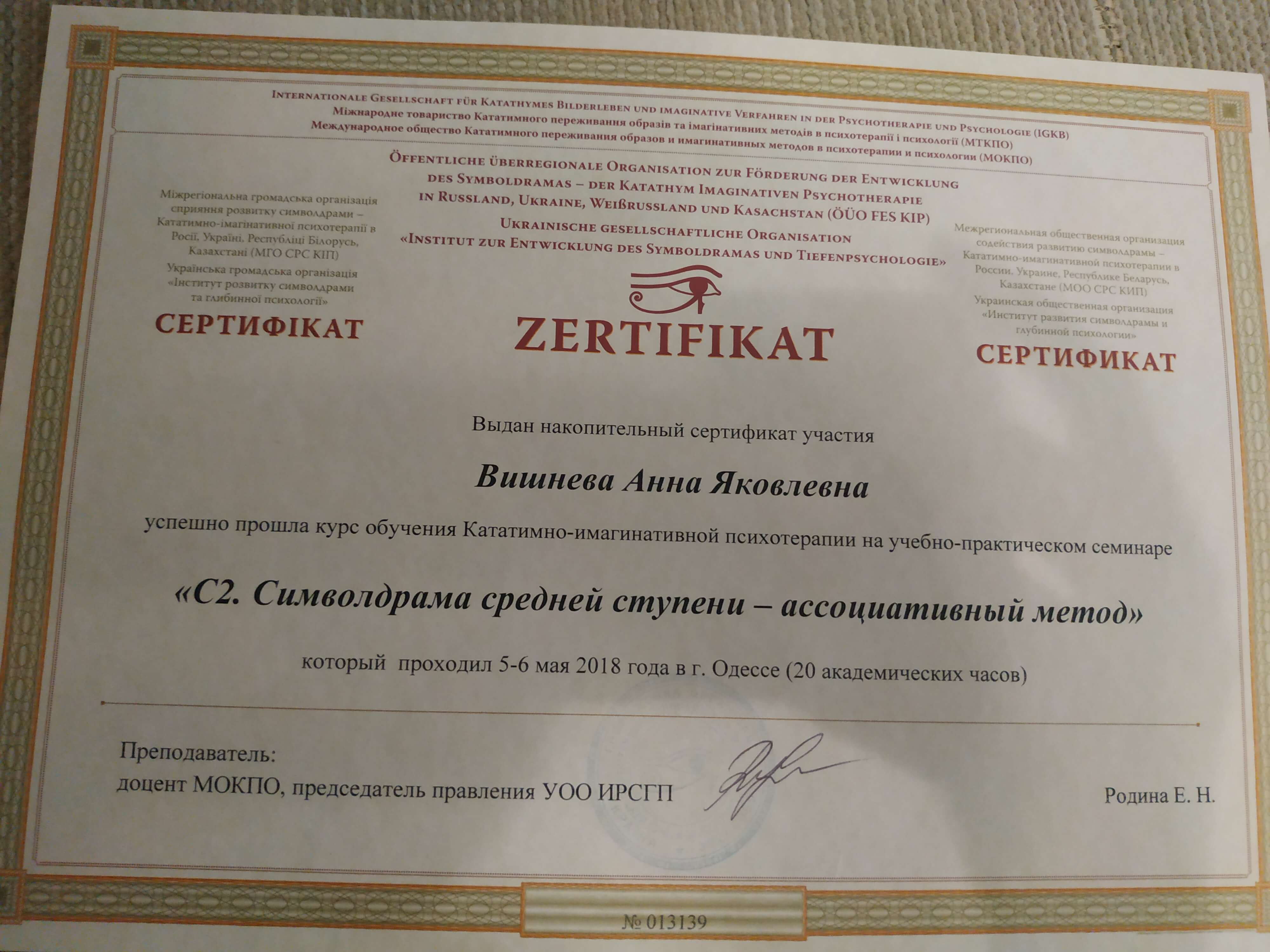 Выдан: Ассоциация детских, семейных, перинатальных психологов, медиков и педагогов "Психея" Украины