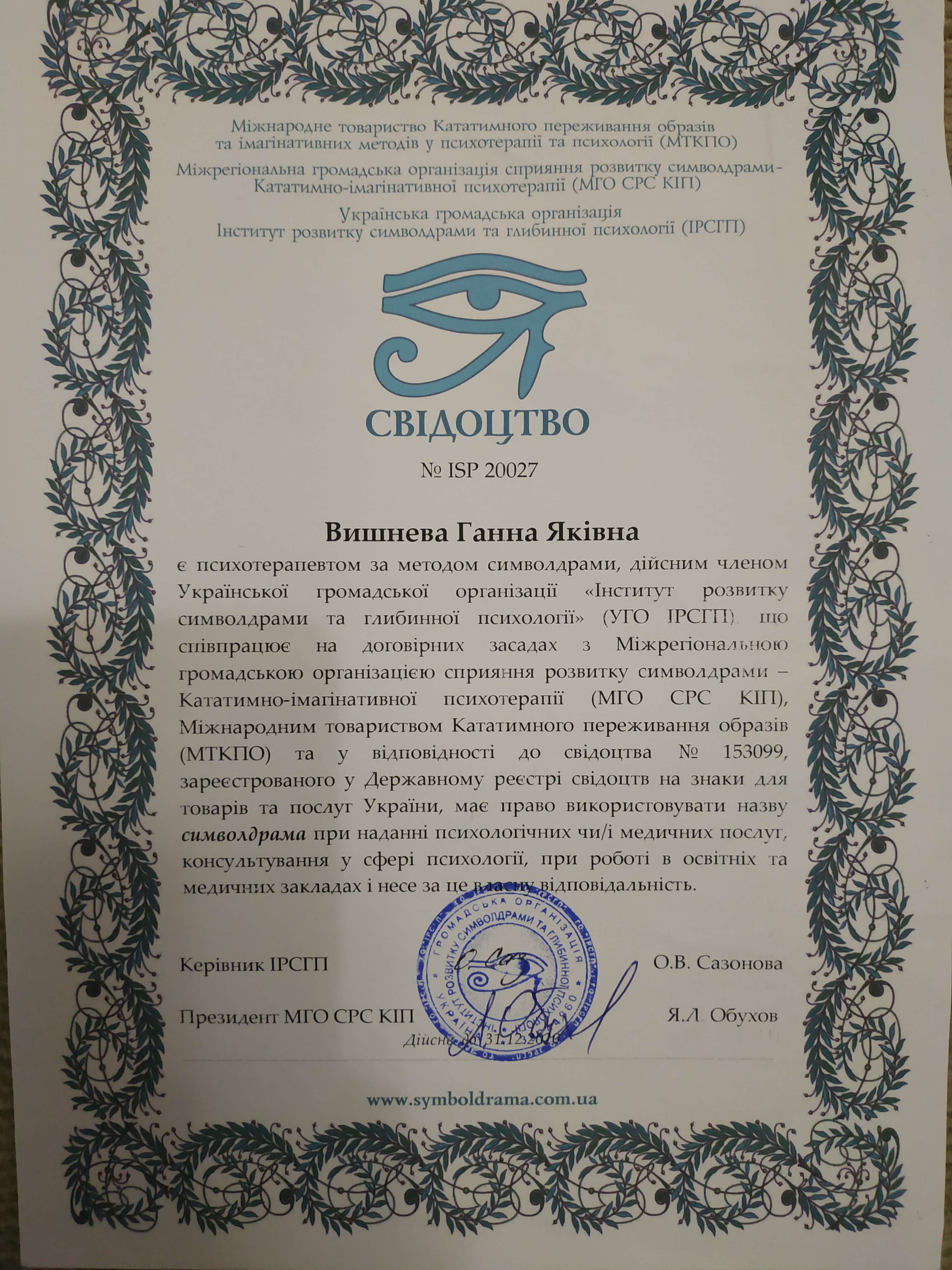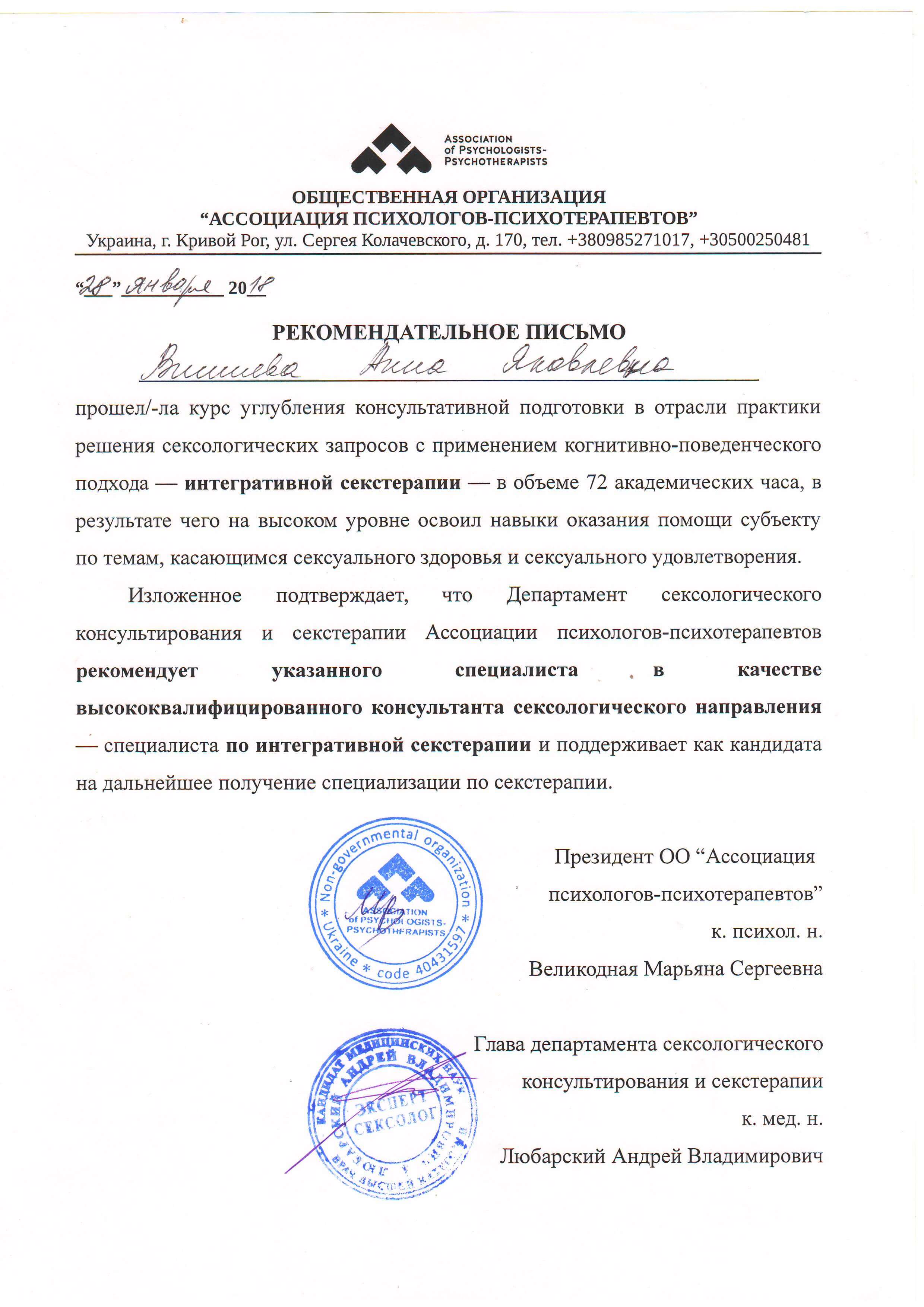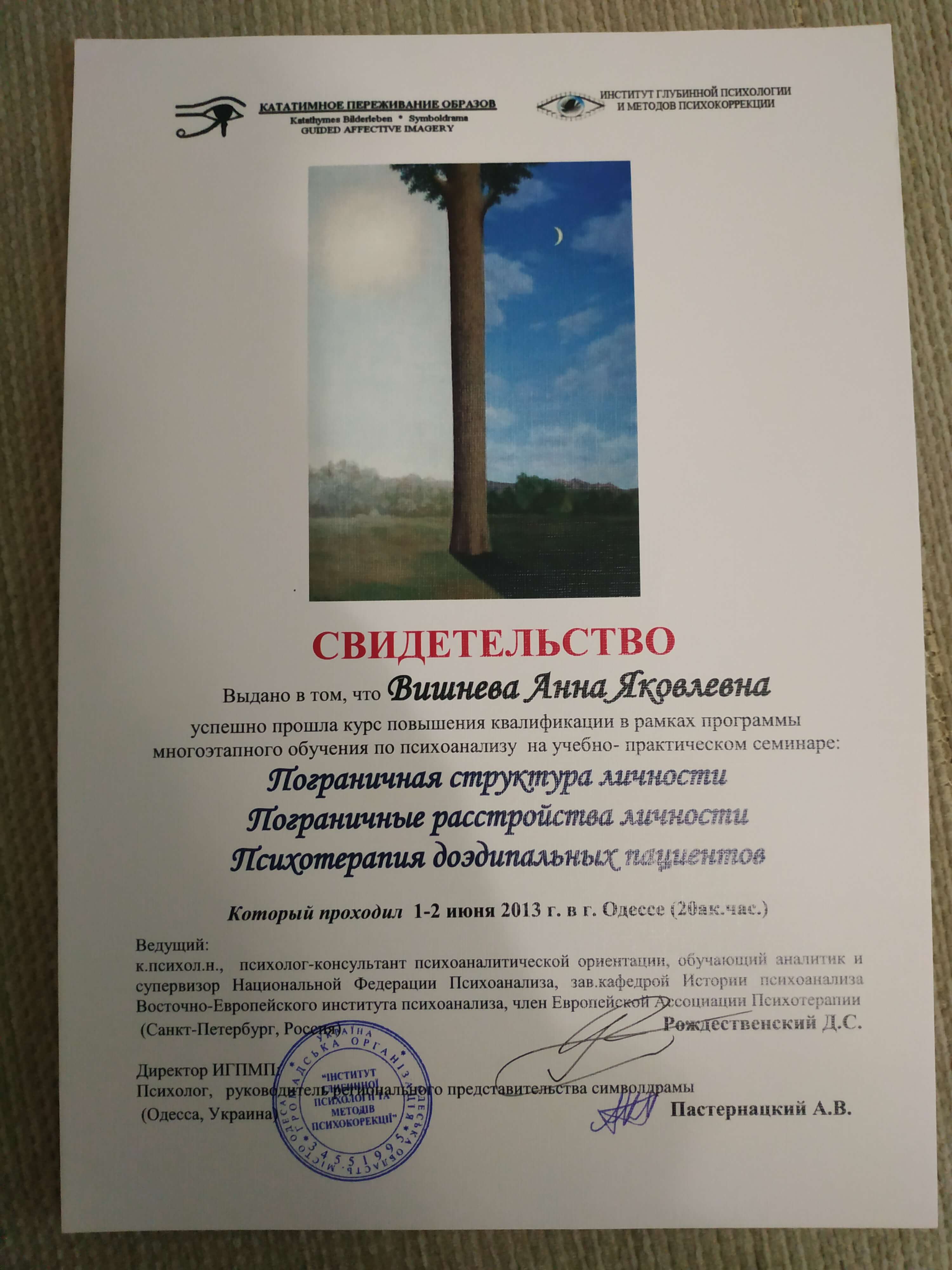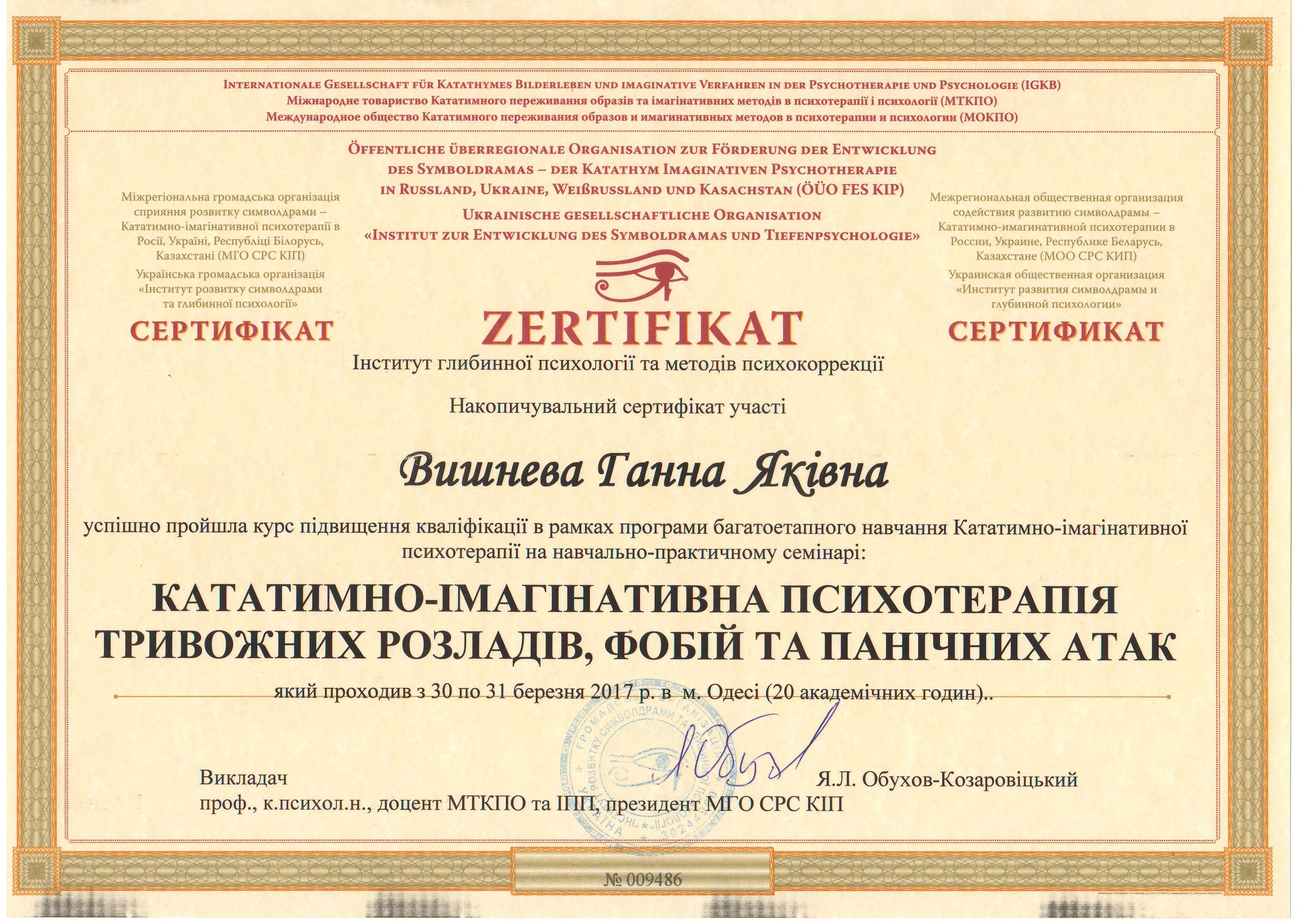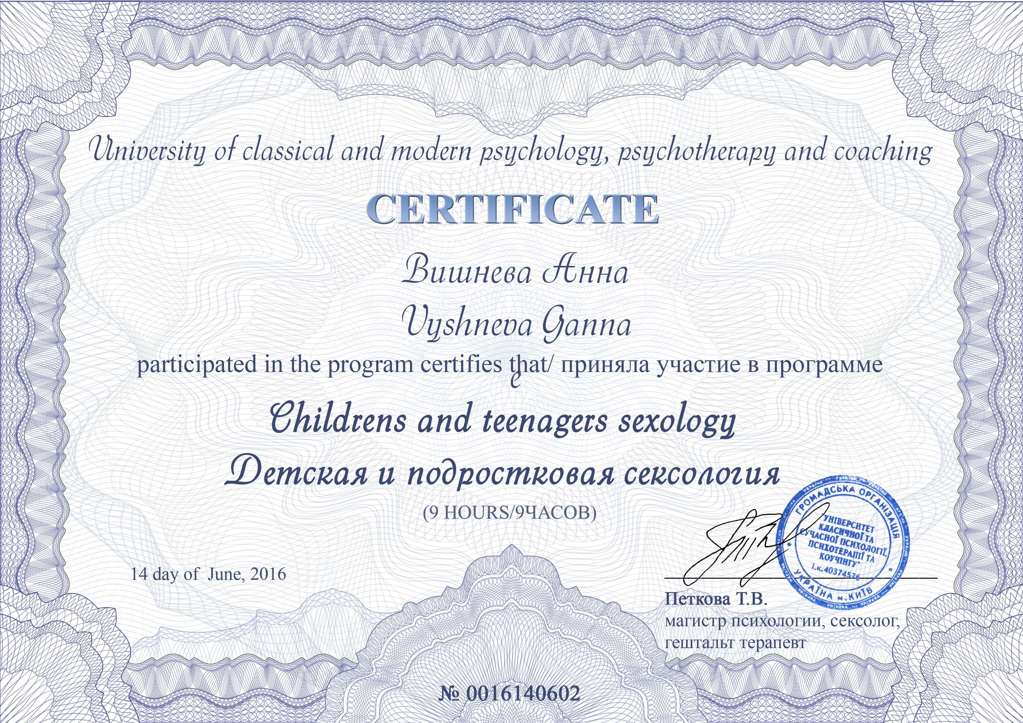 Выдан: Ассоциация детских, семейных, перинатальных психологов, медиков и педагогов "Психея" Украины