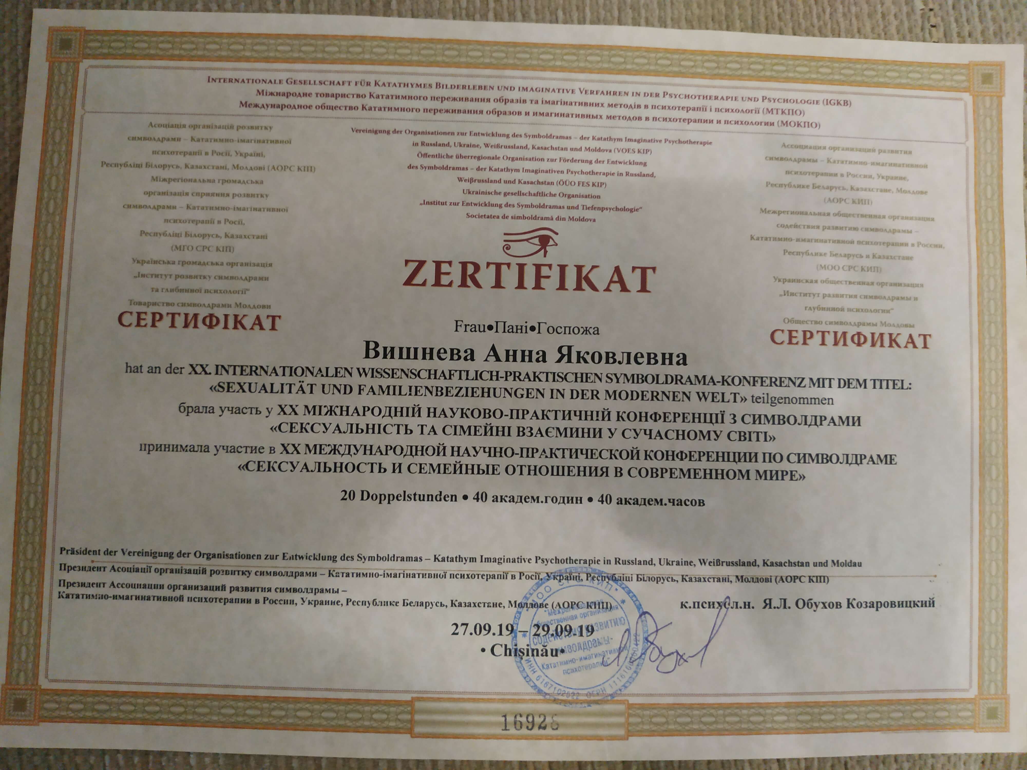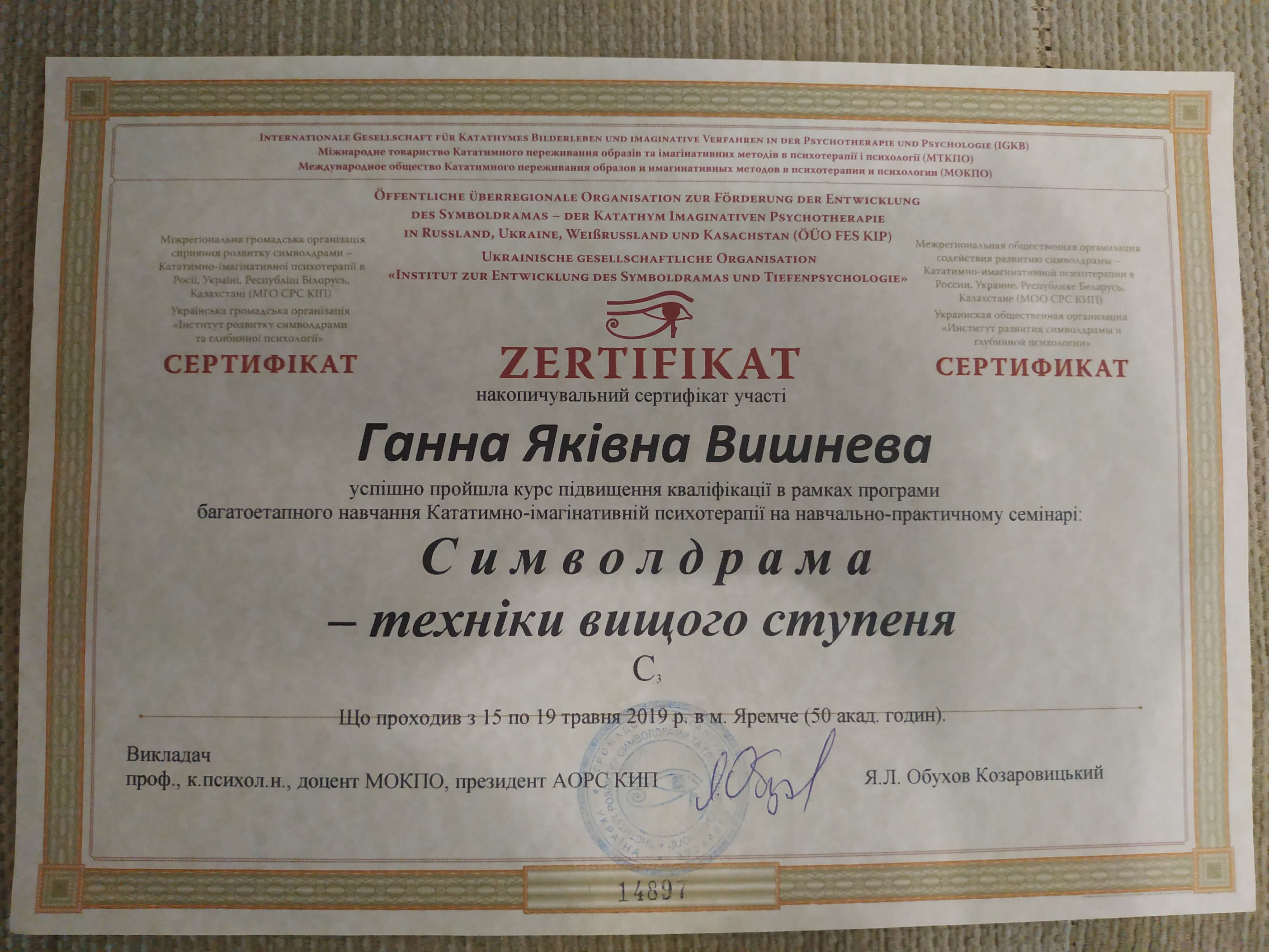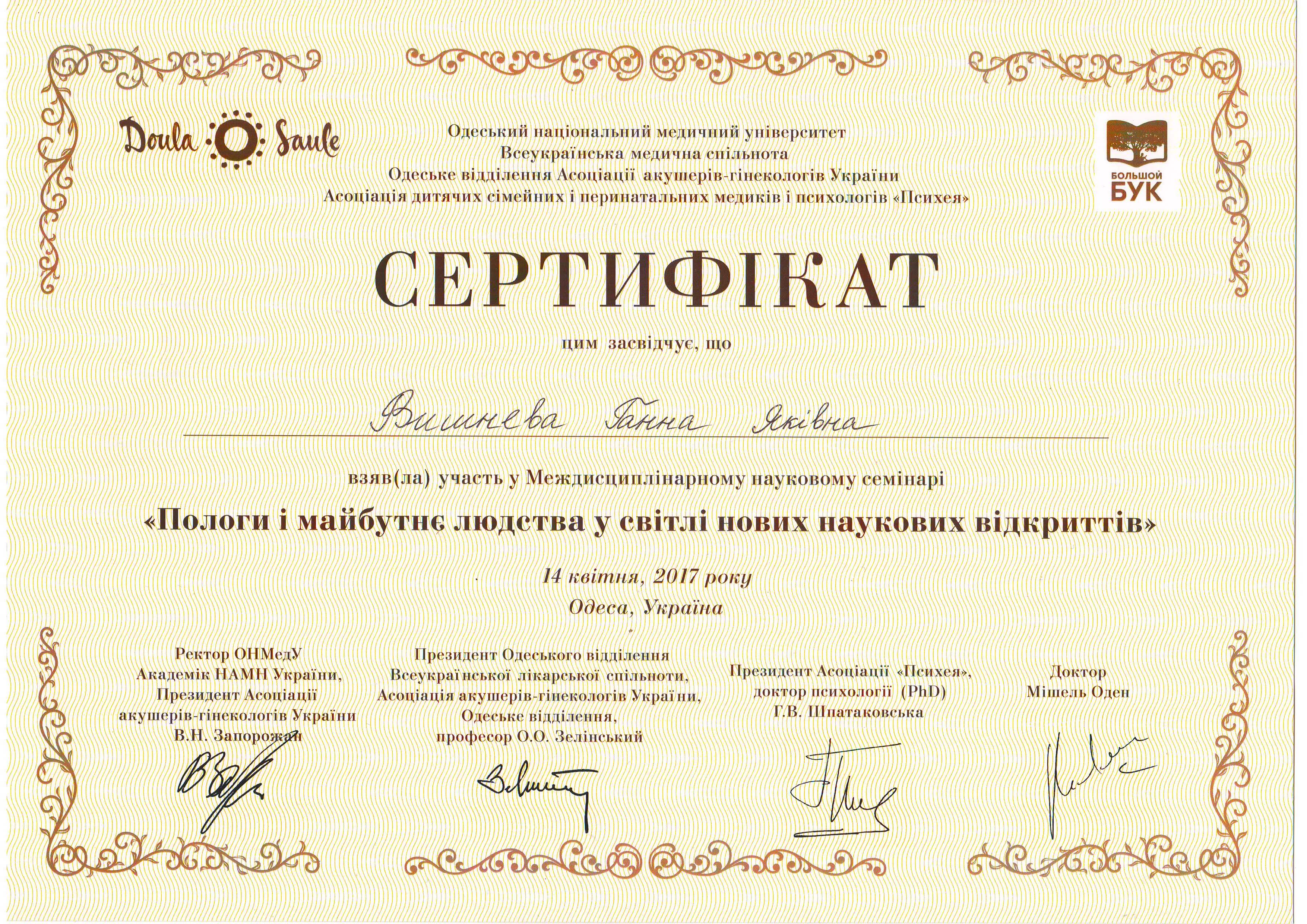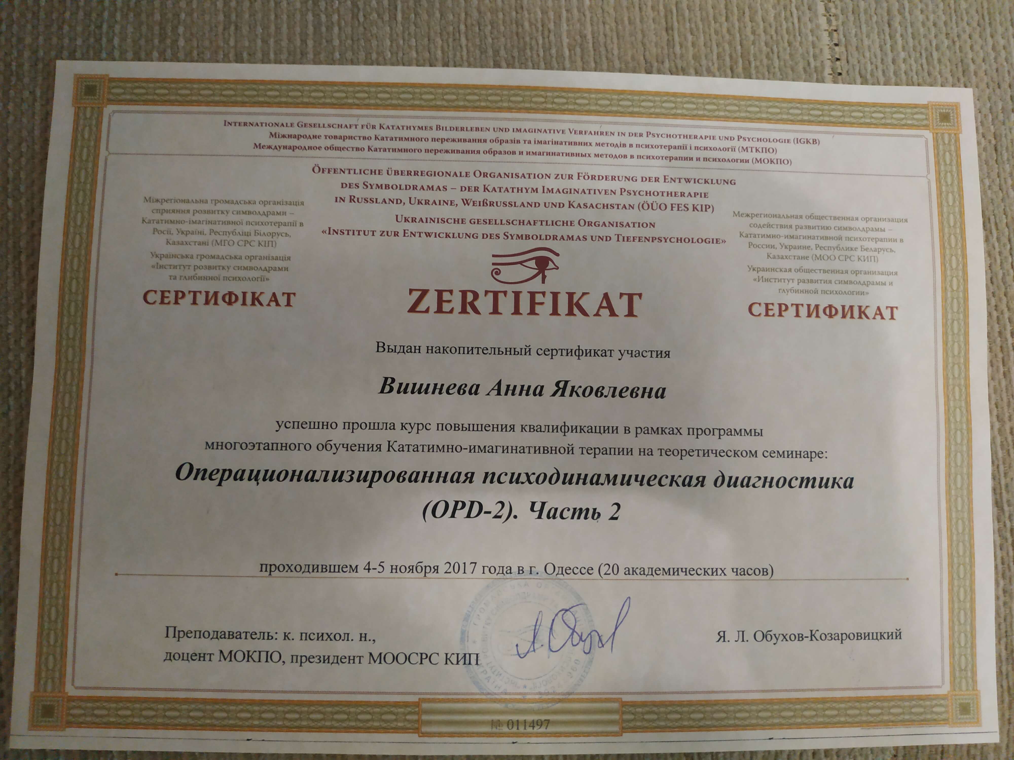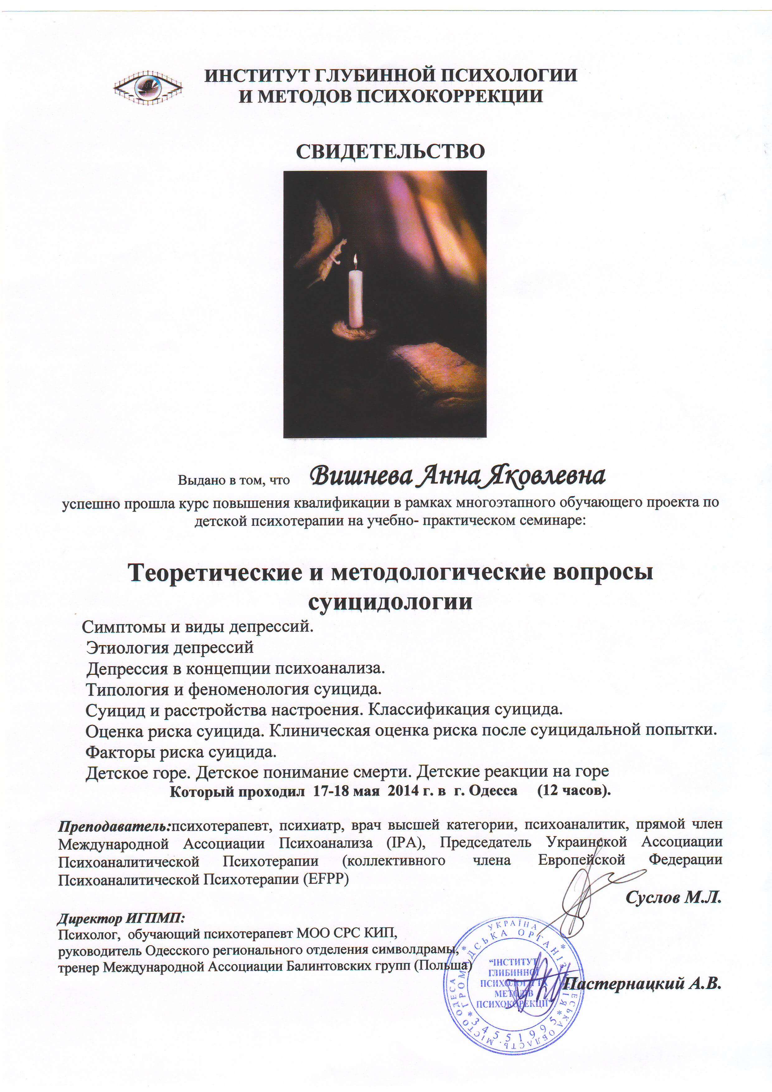 Выдан: Ассоциация детских, семейных, перинатальных психологов, медиков и педагогов "Психея" Украины