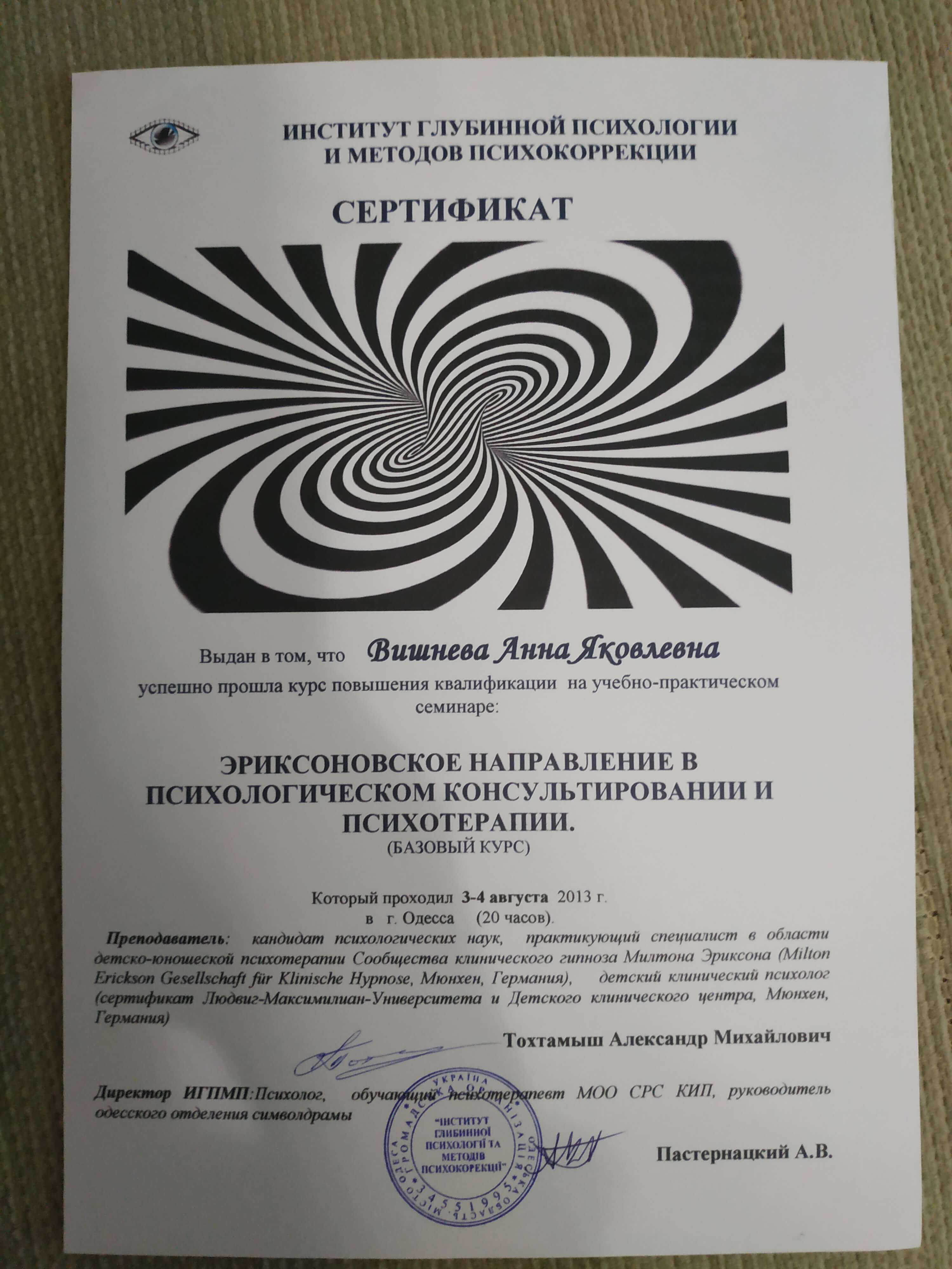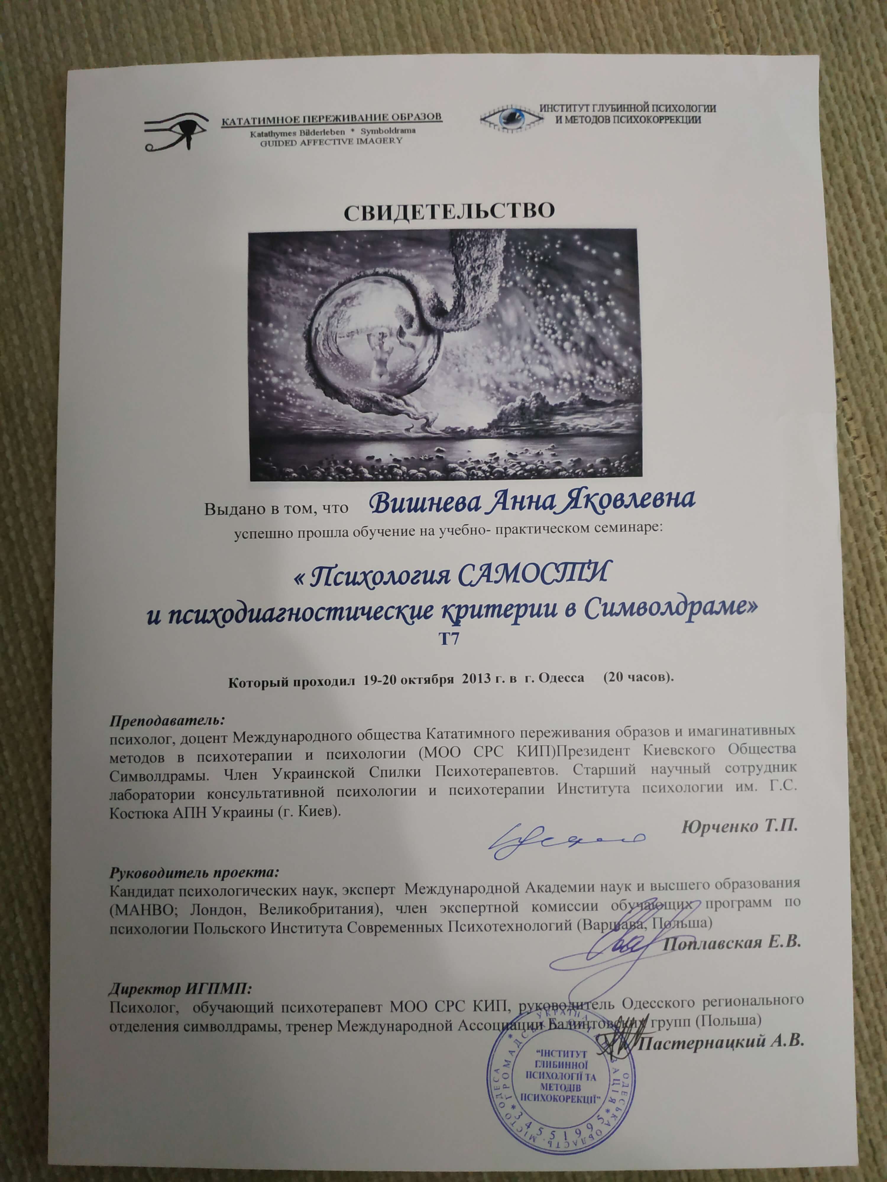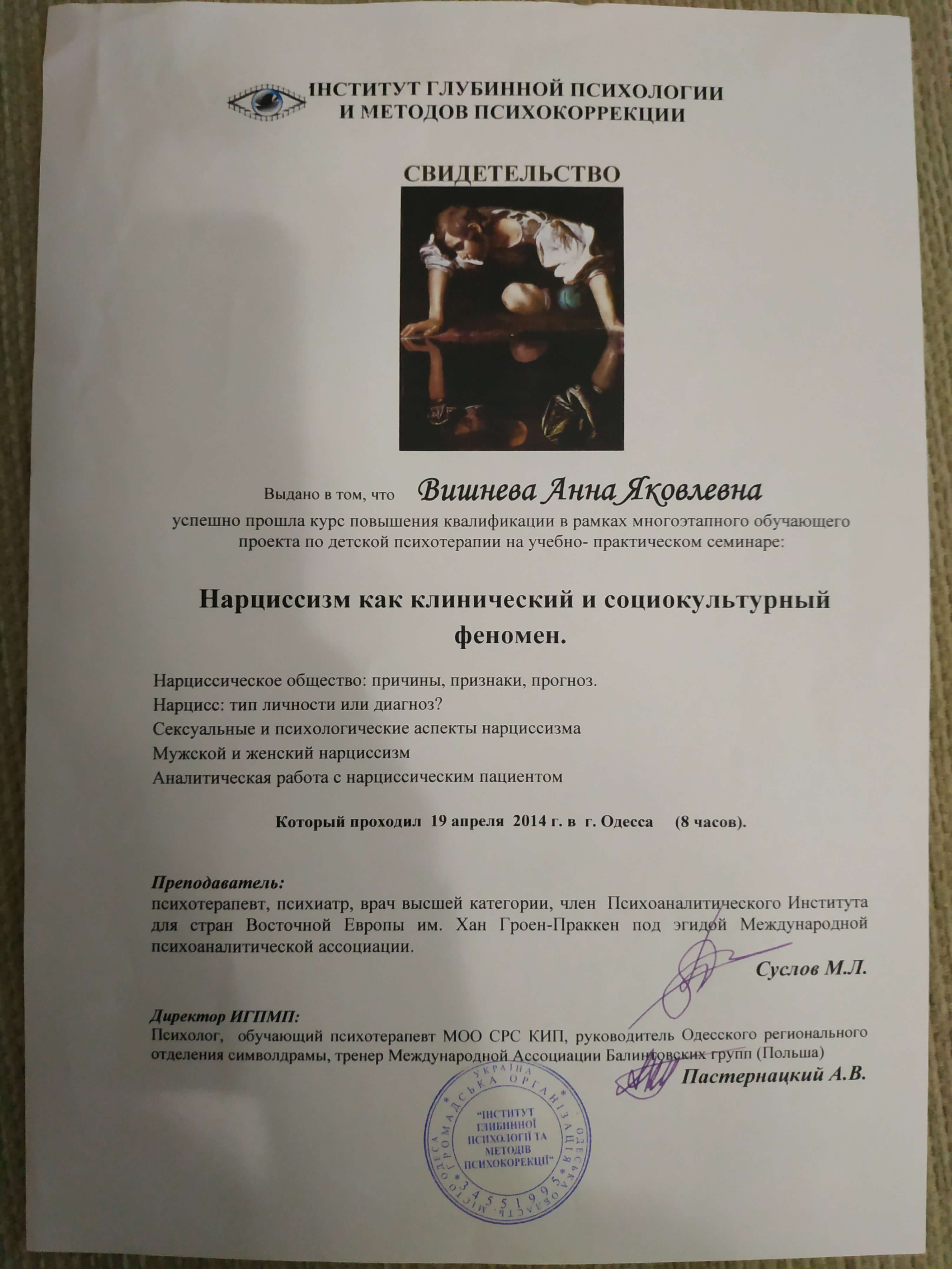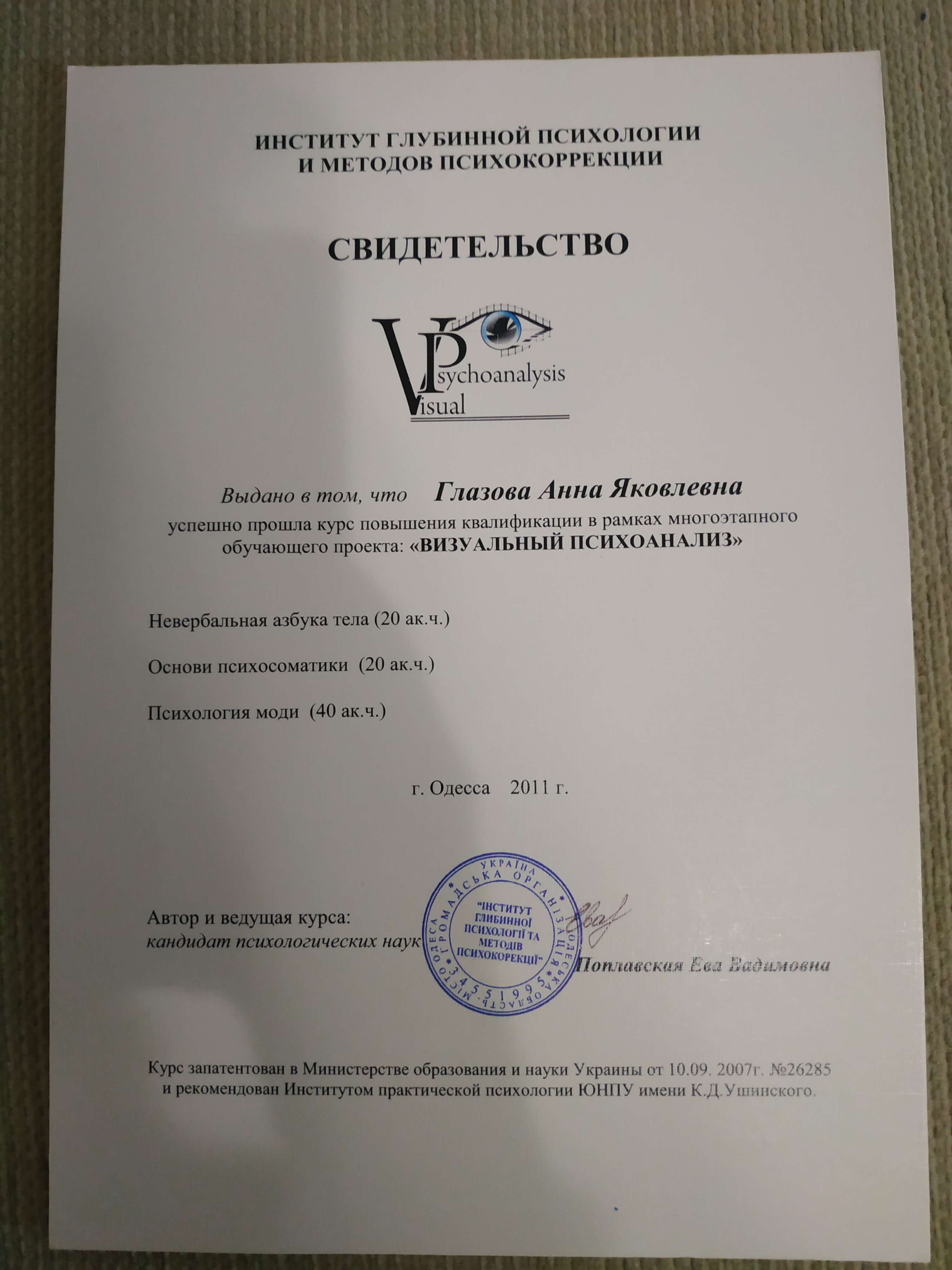 Выдан: Институт глубинной психологии и методов психокоррекции