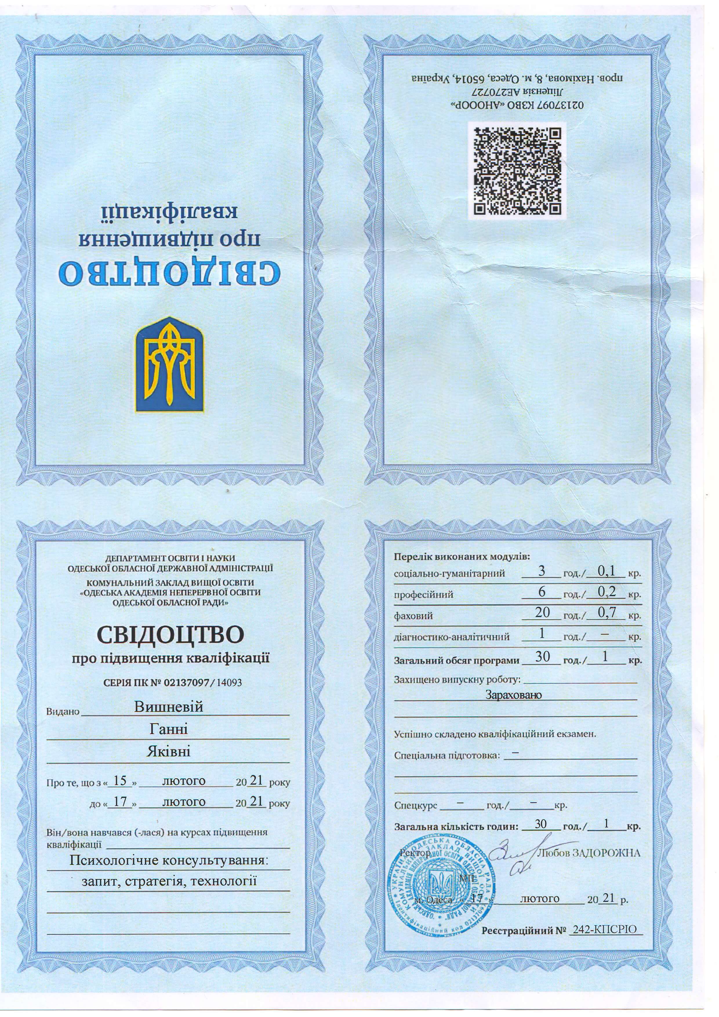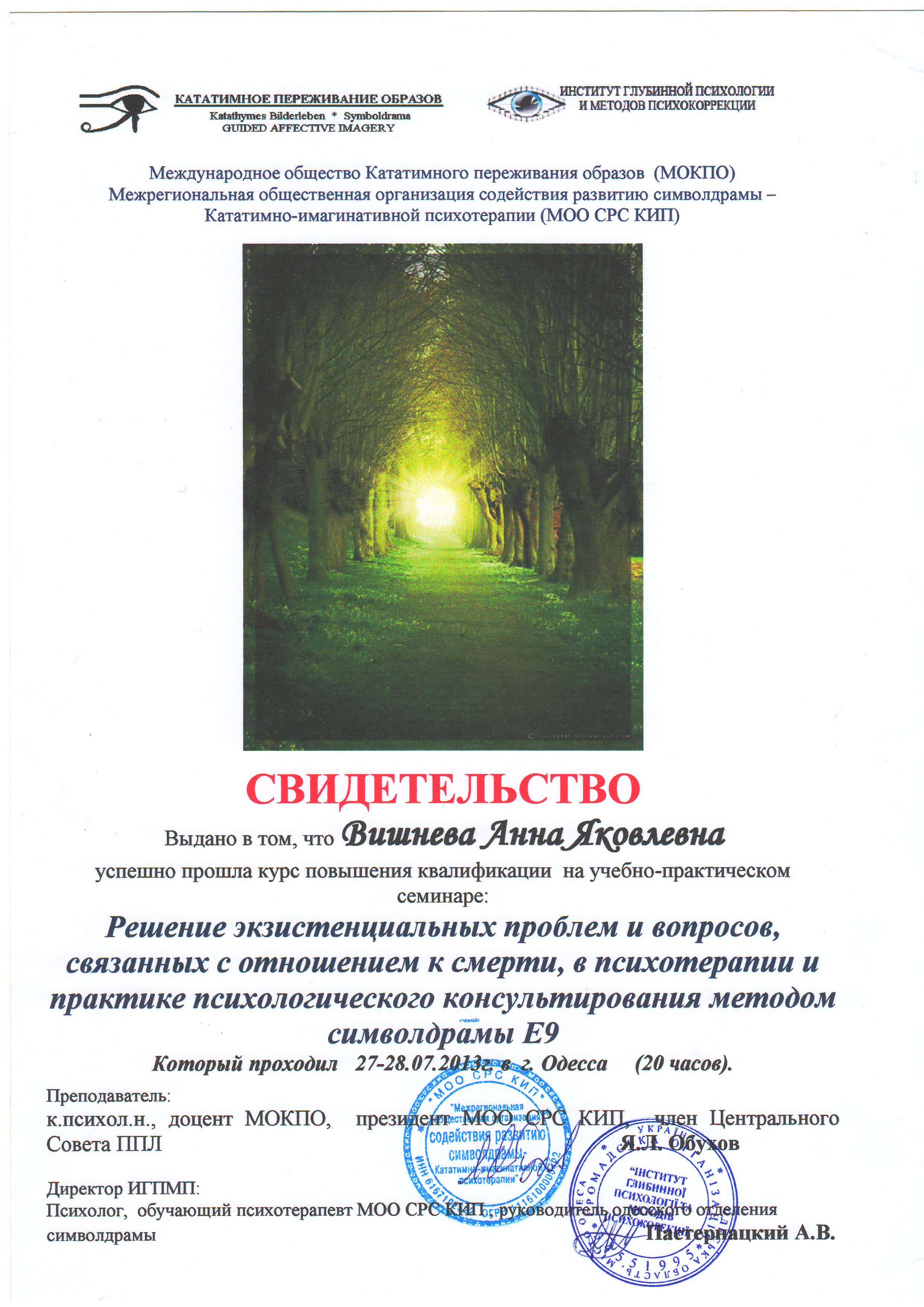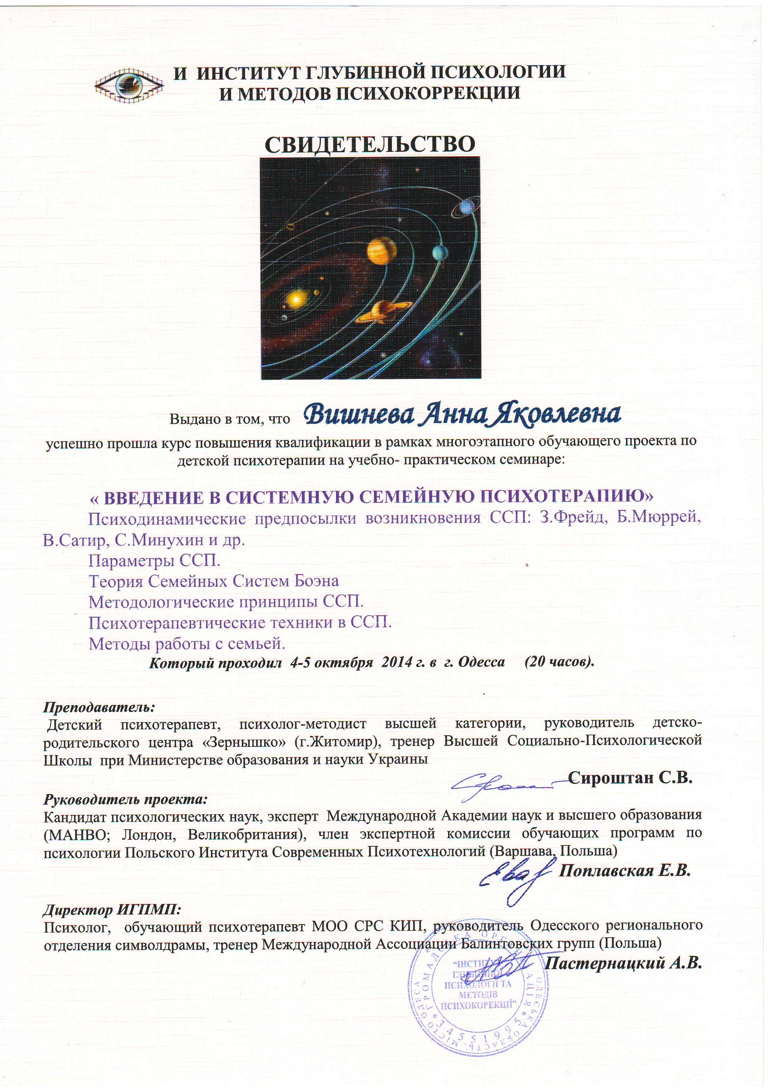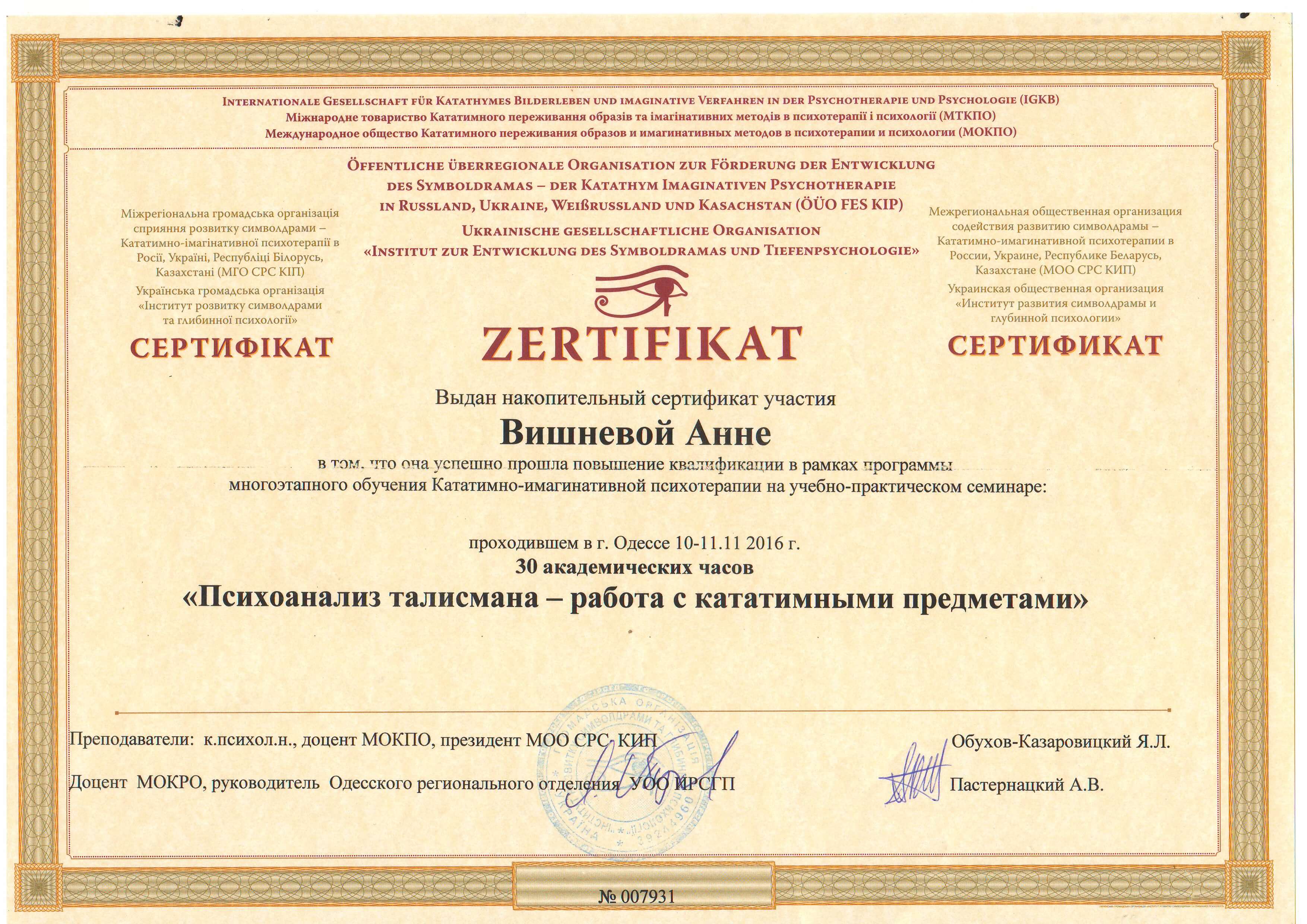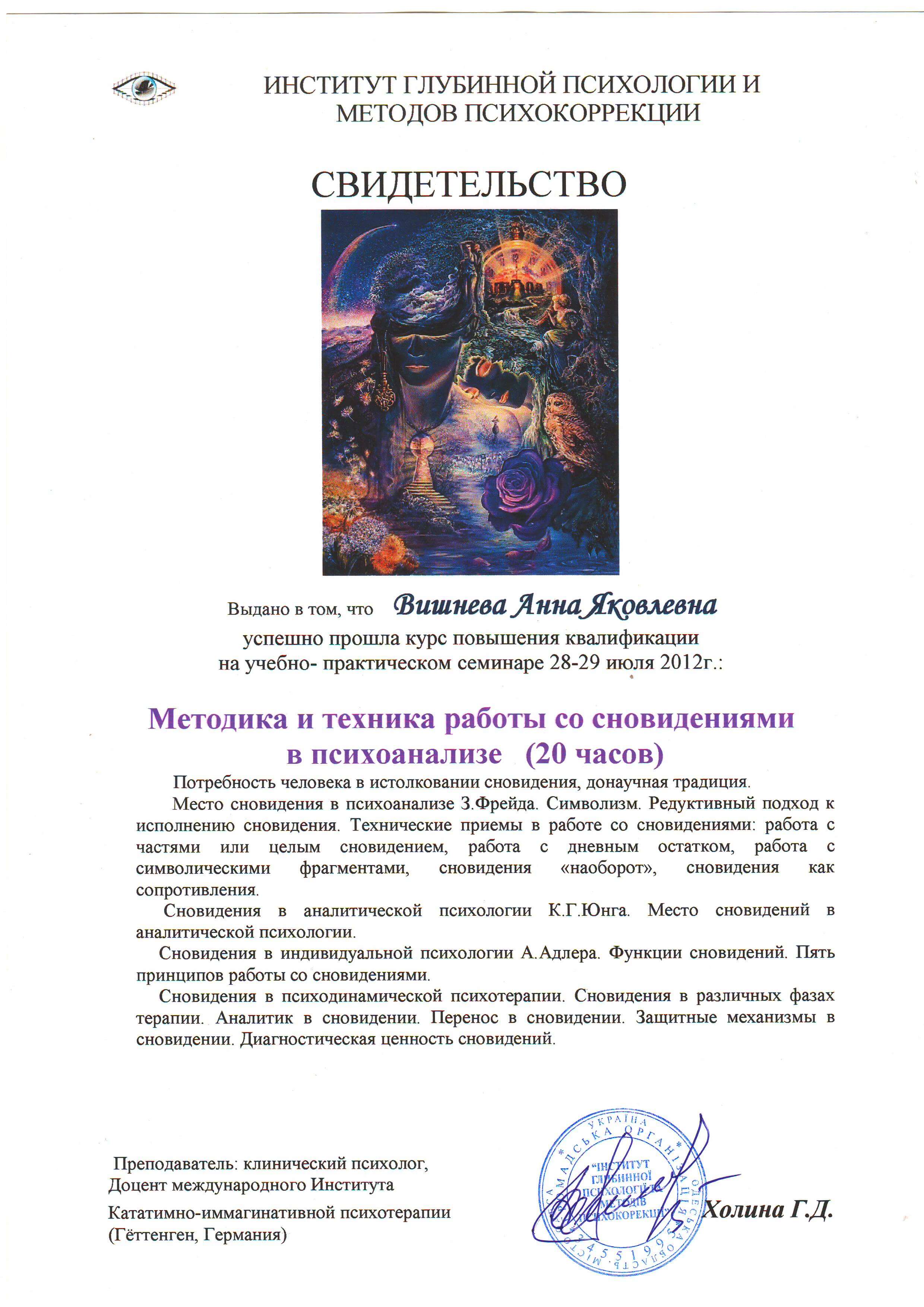 Выдан: Институт глубинной психологии и методов психокоррекции