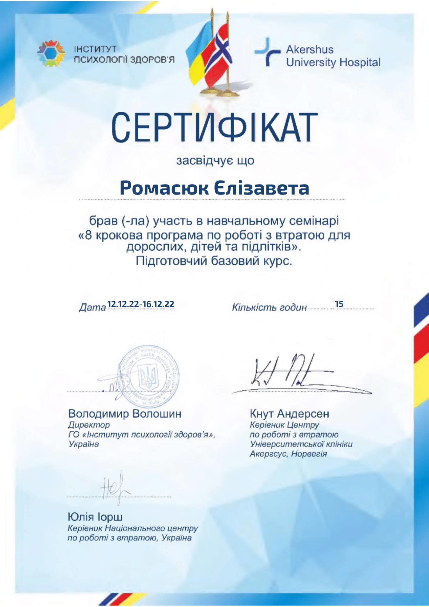 - Институт психологии здоровья – 8 пробковая программа по работе с потерей для взрослых, детей и подростков (15 часов, 2022 год)
