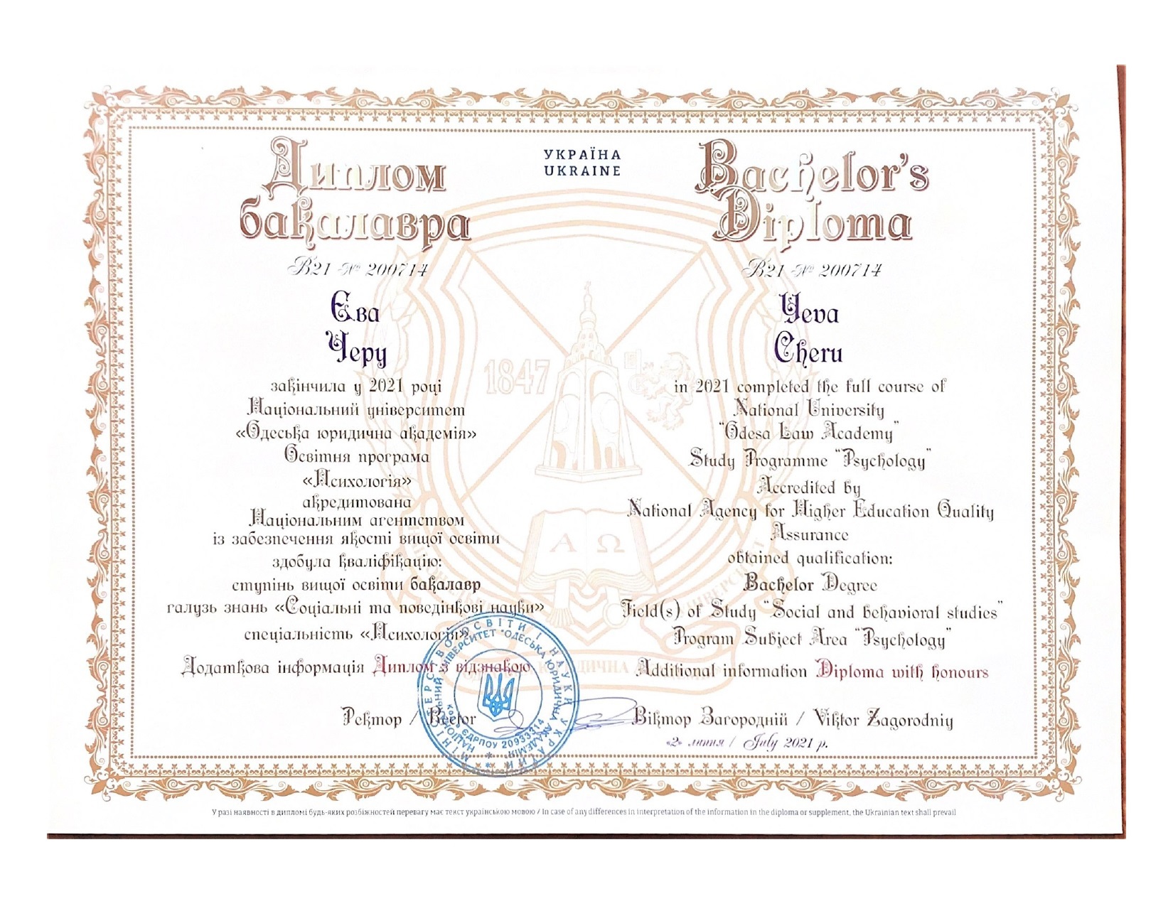 Я получила степень бакалавра и магистра в Национальном университете «Одесская юридическая академия».