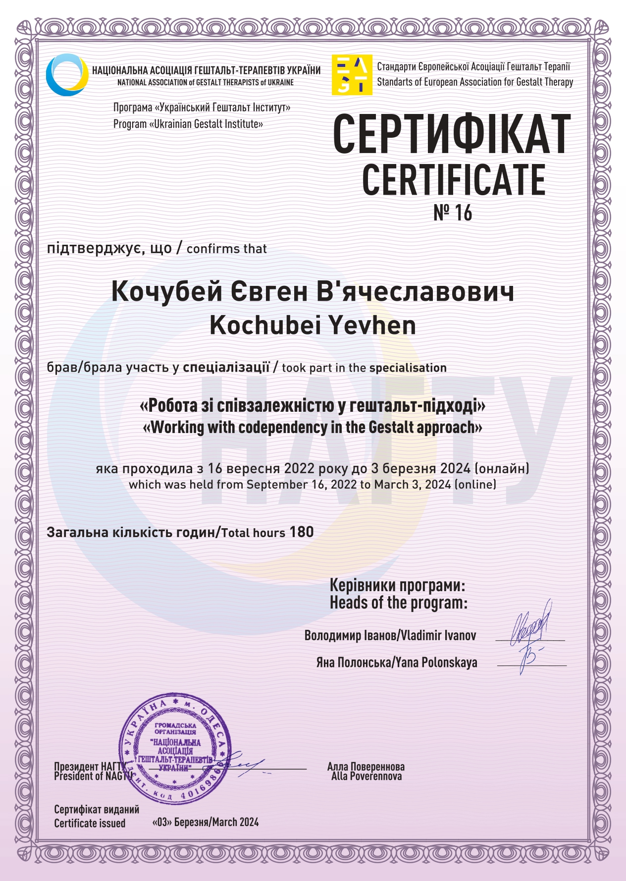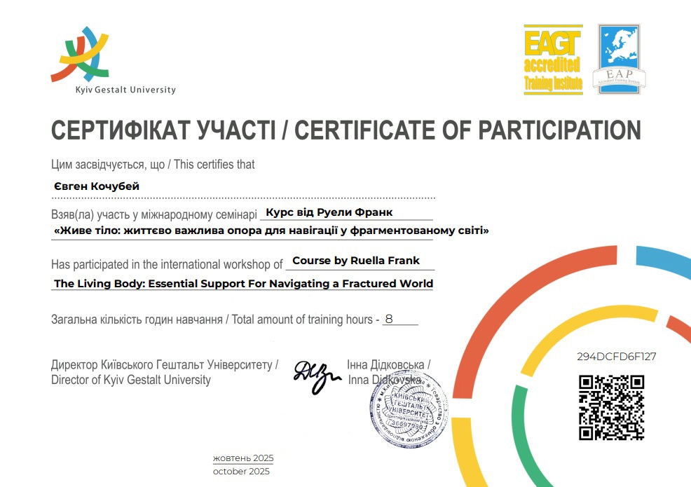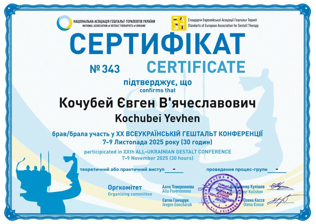 2га степень гештальта терапии в НАГТУ, сертификация в мае 2026 года.