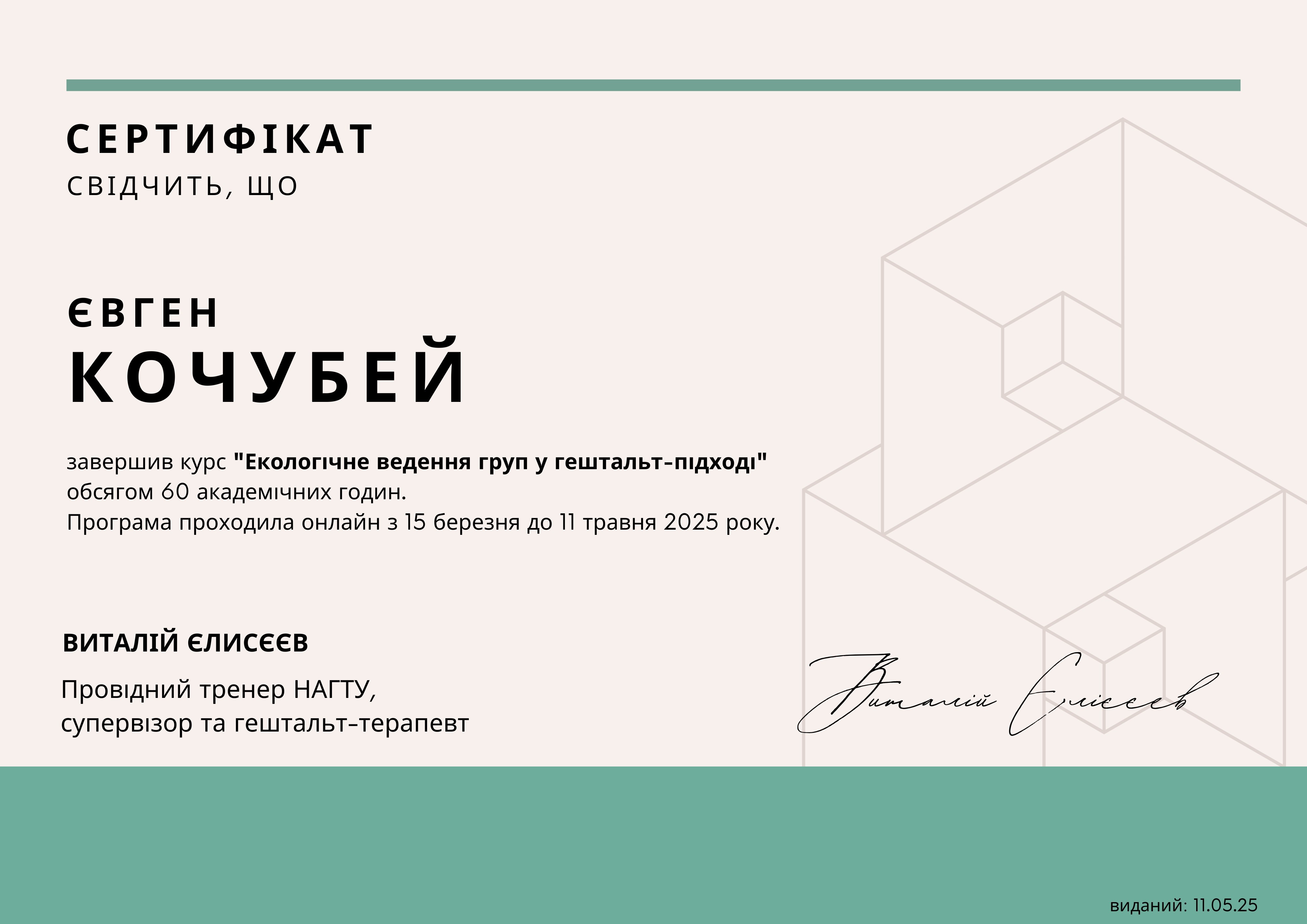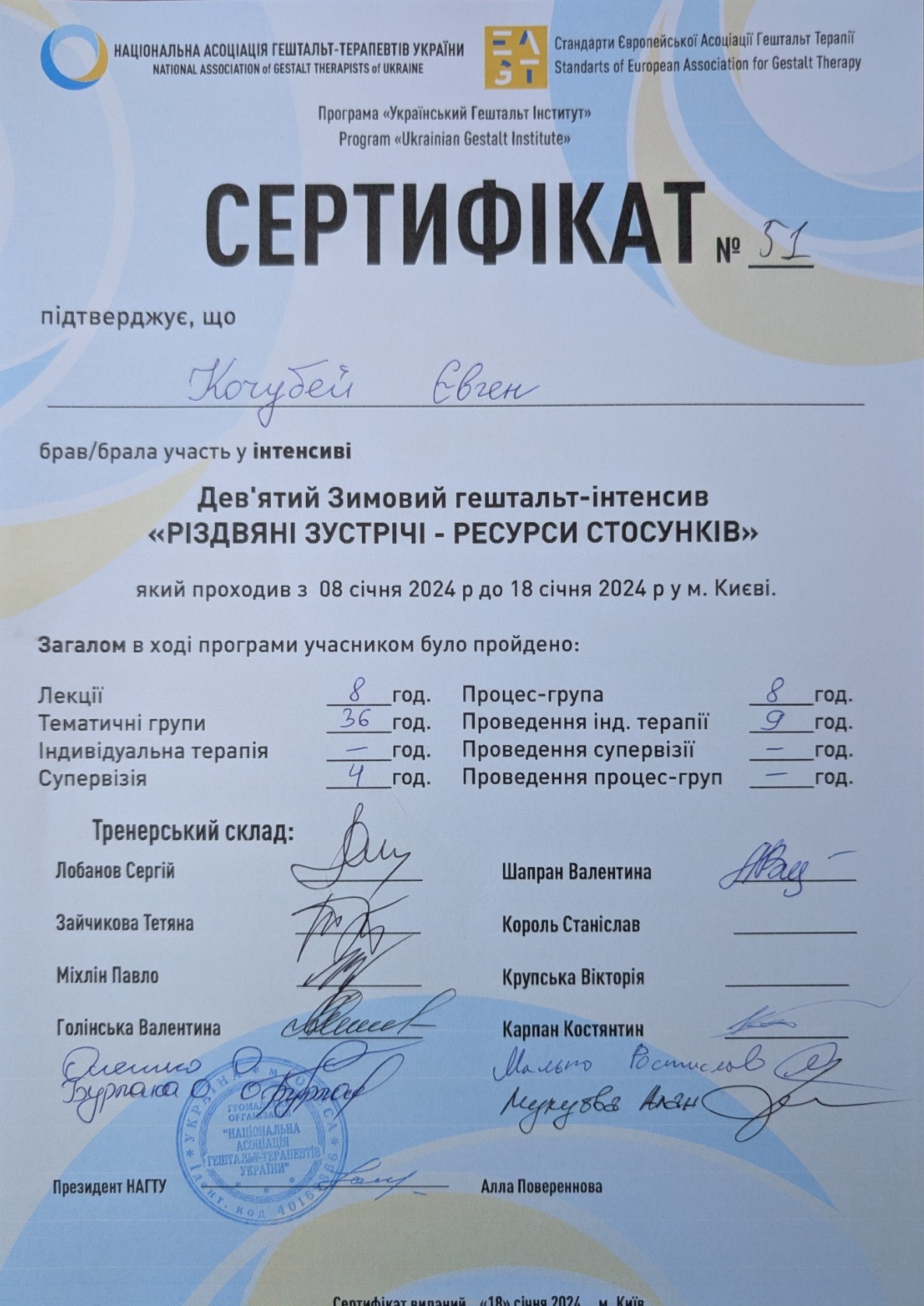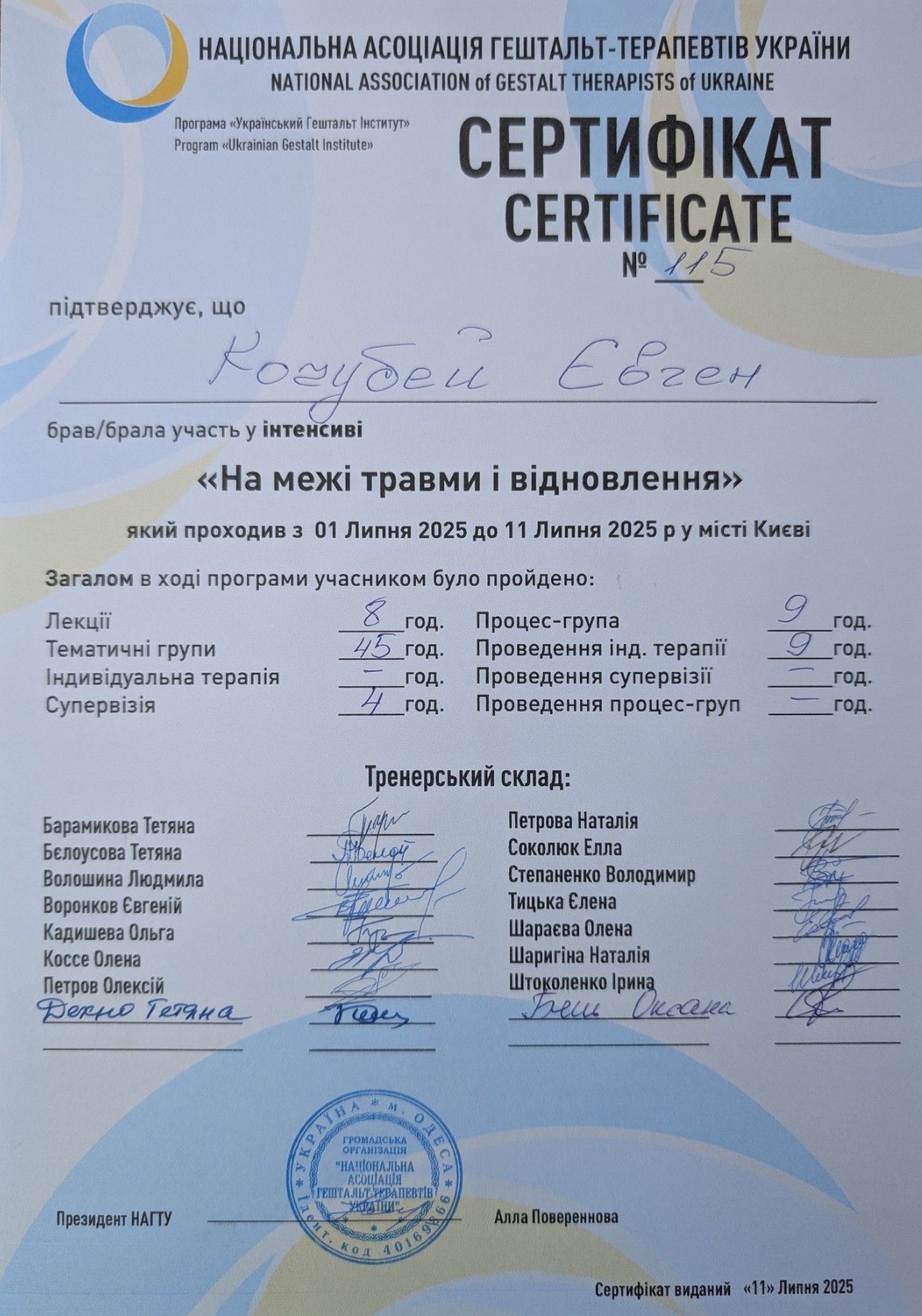 2га степень гештальта терапии в НАГТУ, сертификация в мае 2026 года.