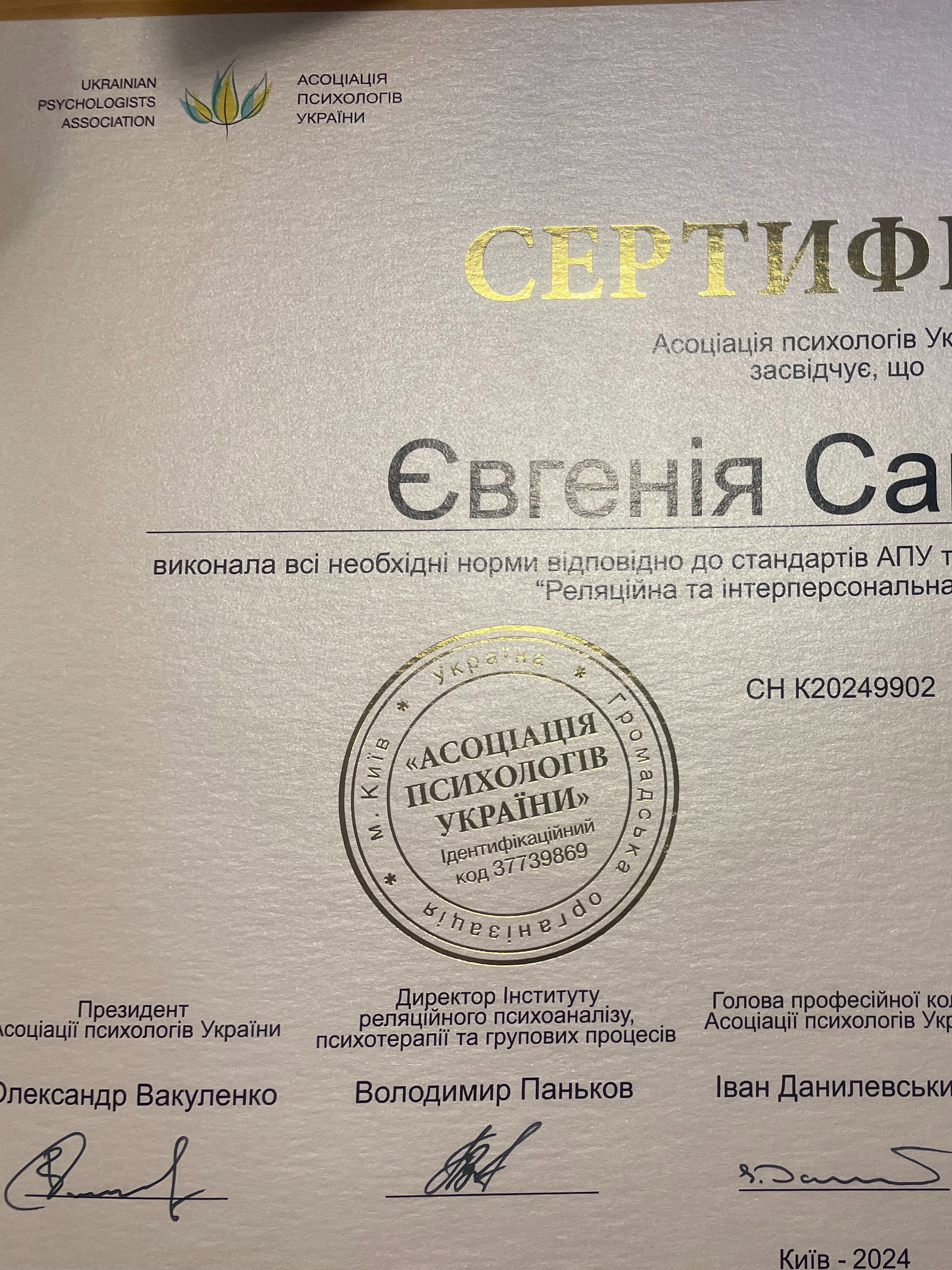 У меня завершено высшее образование - магистр психологии. Также, есть законченное психотерапевтическое образование, которое прошло во Львовском психоаналитическом институте ментального здоровья. И сейчас участвую в пятилетнем Трускавецком проекте (от УСП).