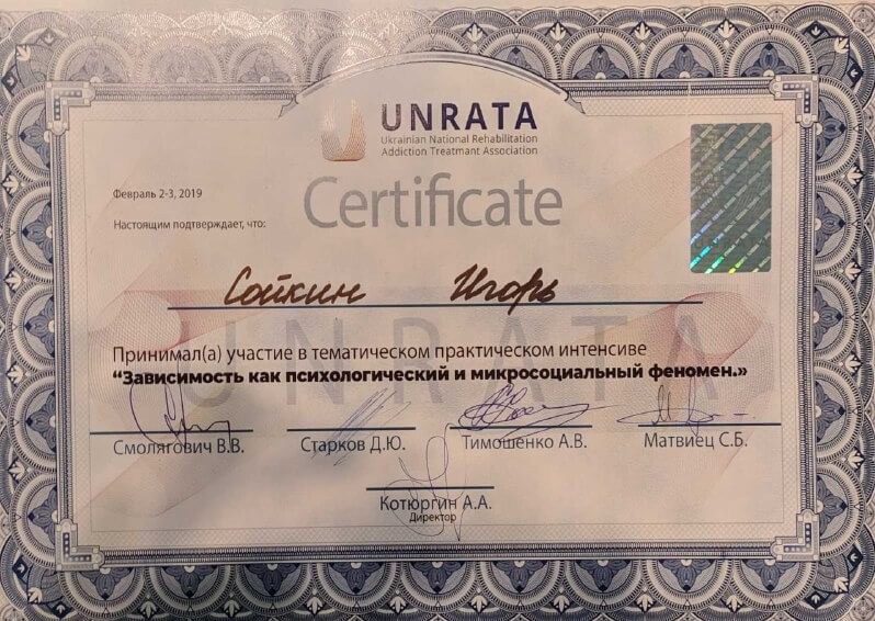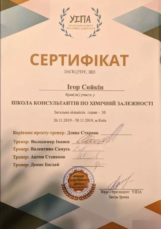 Прошел обучение с 26.11.2019 по 27.05.2020 в «Школе консультантов по химической зависимости» УИПА (60 часов теории и 25 часов супервидения) и получил сертификационное звание от Украинского института практической адиктологии – Консультант по химической зависимости 21.11.2010. , г. Киев – Прошел подготовку в ШКОЛА КОНСУЛЬТАНТОВ ПО ХИМИЧЕСКОЙ ЗАВИСИМОСТИ.