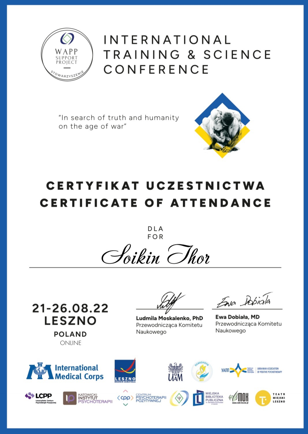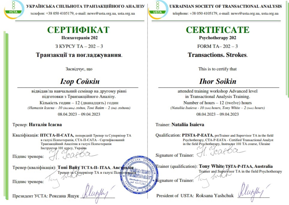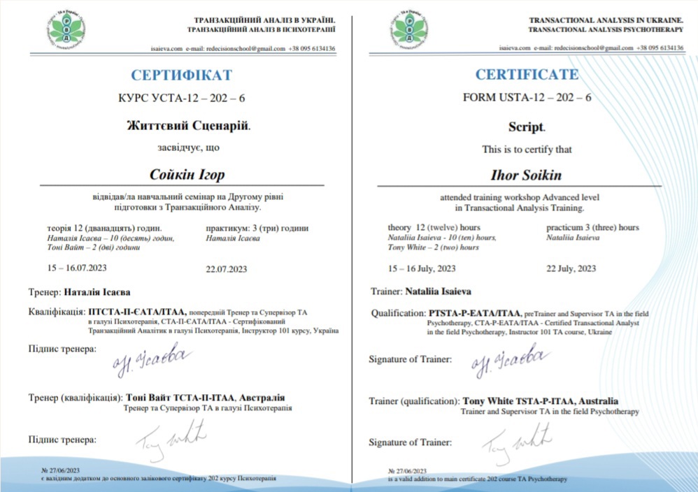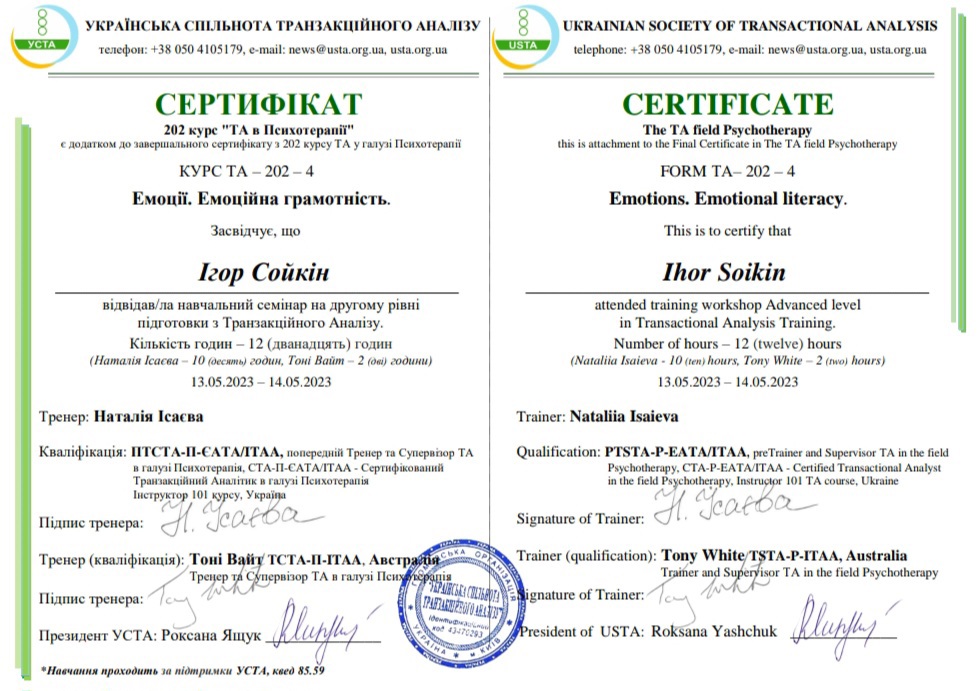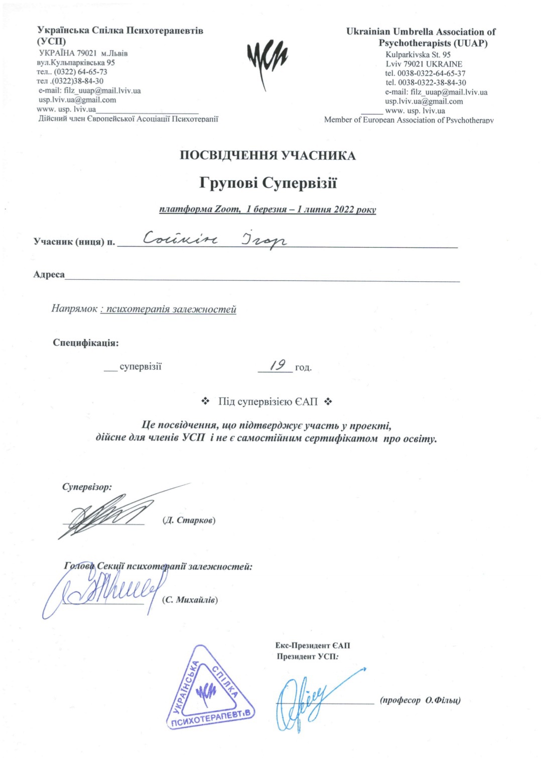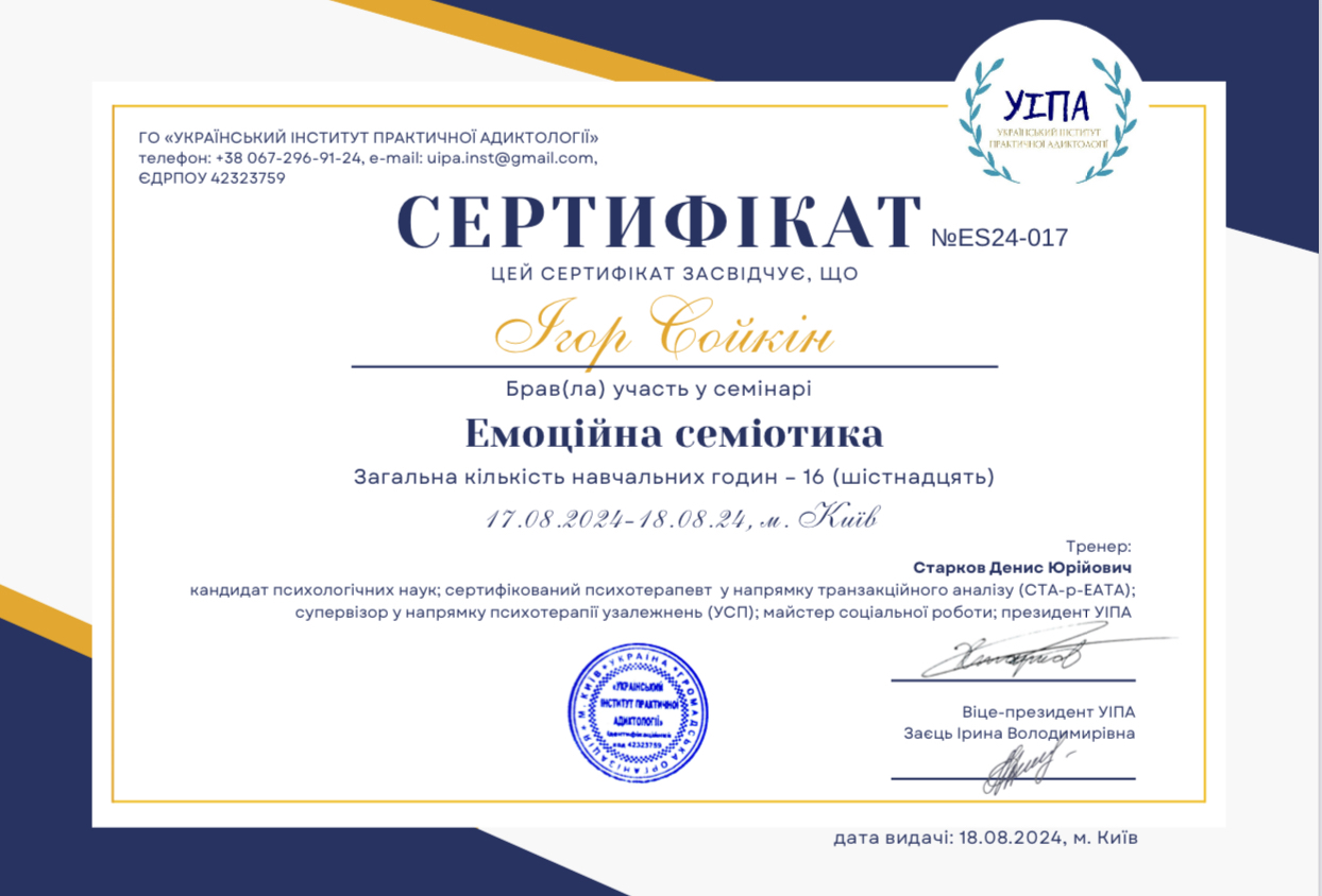 24.10.2020 – 09.10.2022, г. Киев – закончил учебный курс УИПА «Психологическая работа с зависимостями: консультирование, психотерапия, реабилитация» общее количество – 256 часов и получил сертификационное звание от Украинского института практической адиктологии.