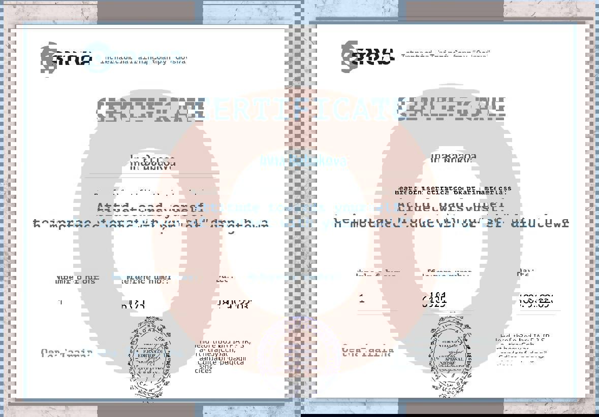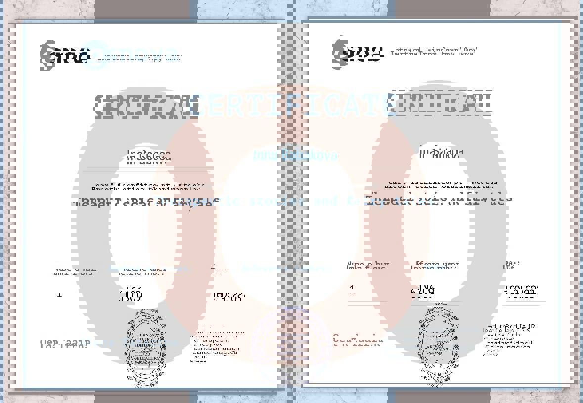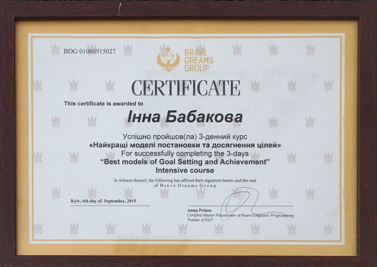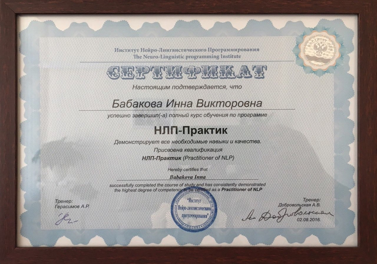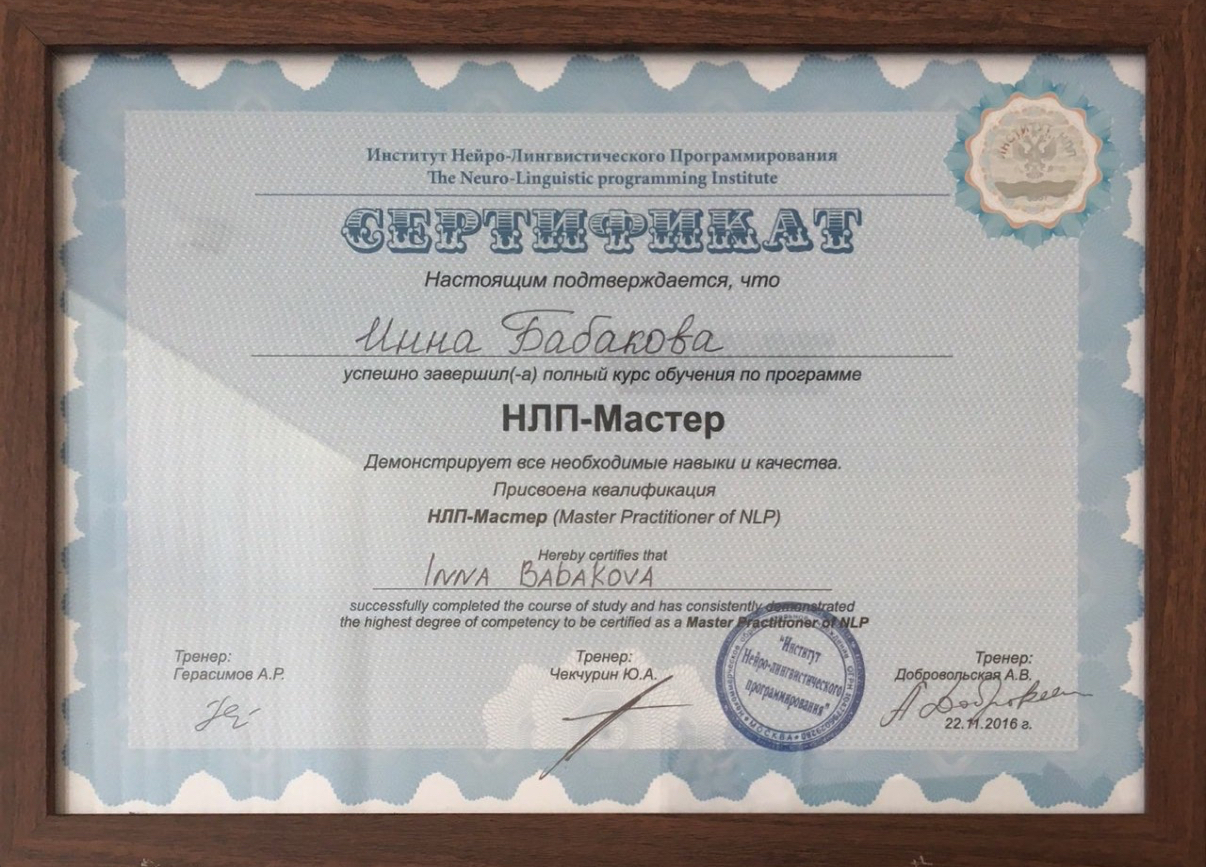 • НЛП практик и мастер НЛП – сертификаты от А.А. Добровольской, О. Герасимовой, Ю. Чекчурин.