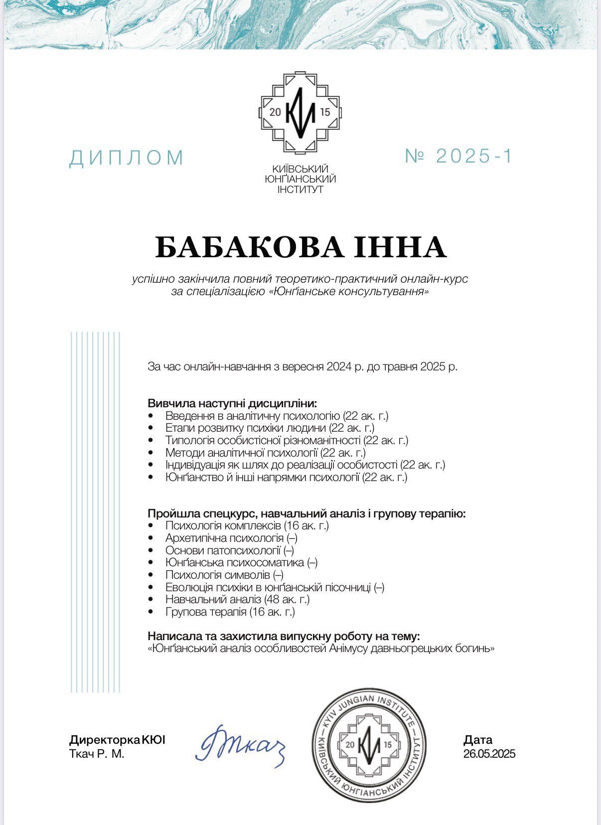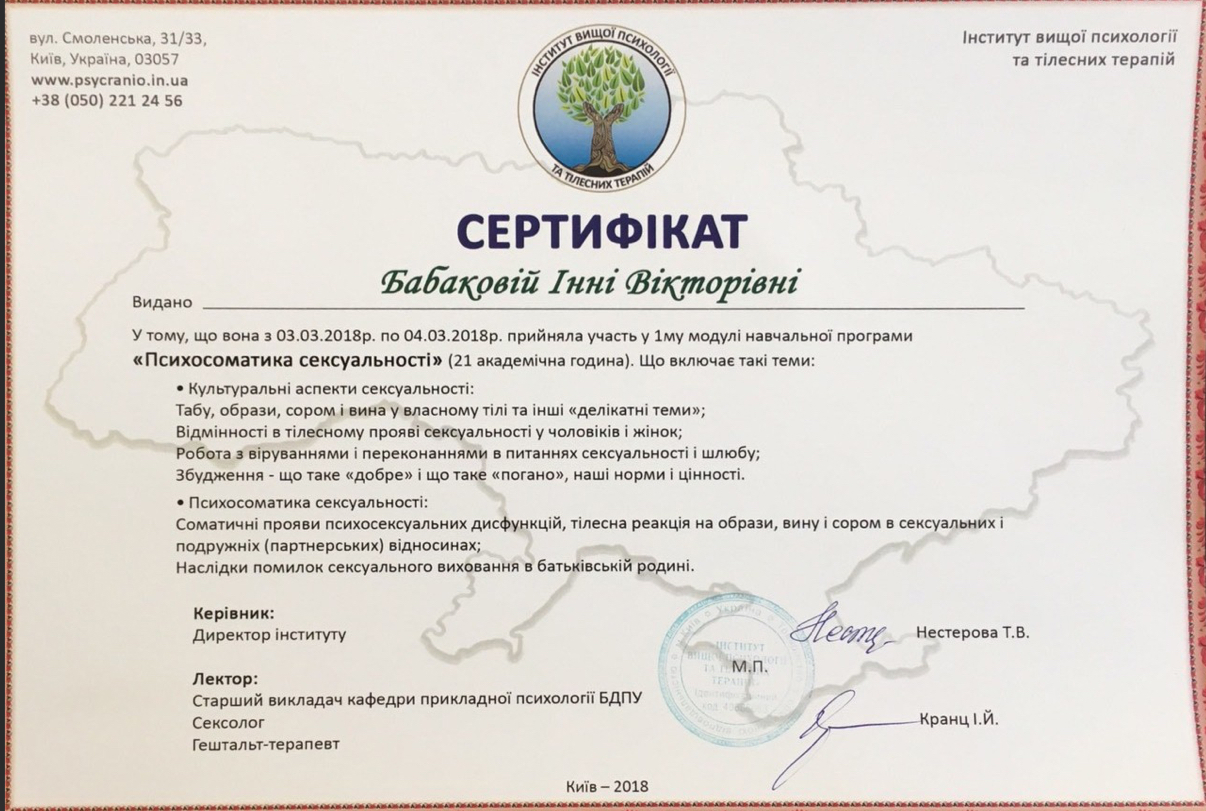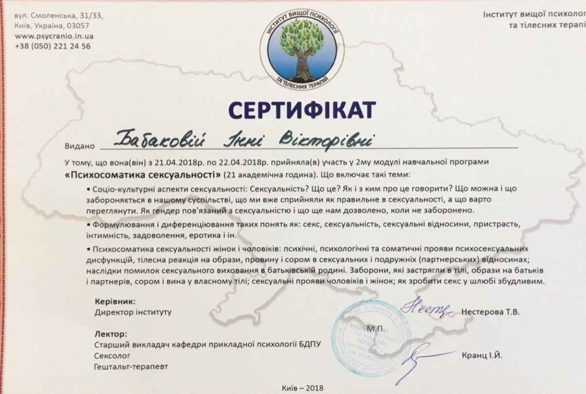 - Юнгианское консультирование (Киевский юнгианский институт (Р. Ткач); Тренер женских программ (Л. Ренар);