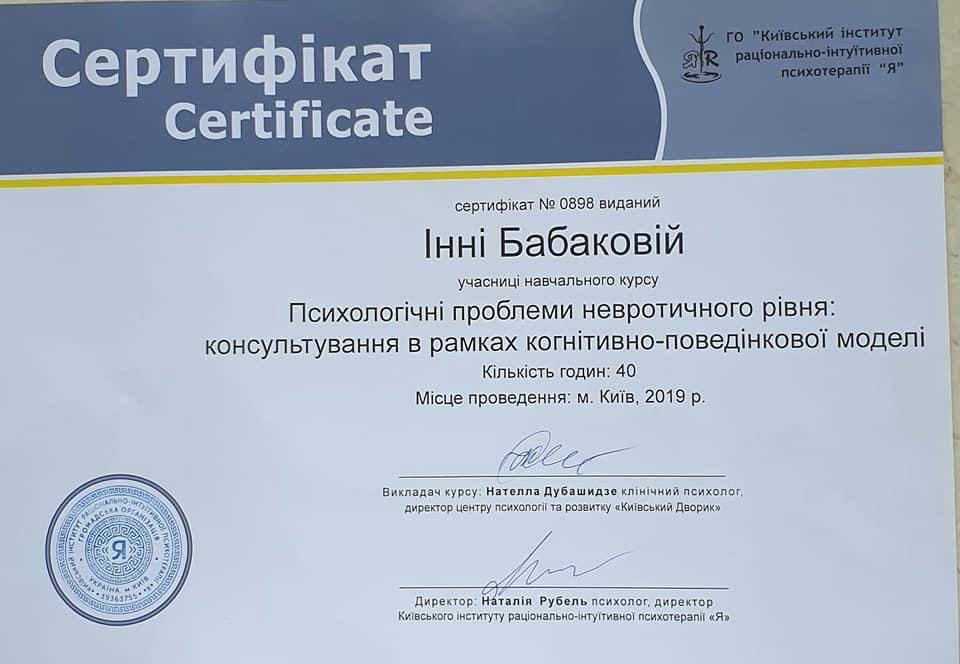 Психологические проблемы невротического уровня, консультирование в рамках когнитивно поведенческой модели (Киевский институт рационально-интуитивной психотерапии "Я" (Н. Дубашидзе, Н. Рубель);