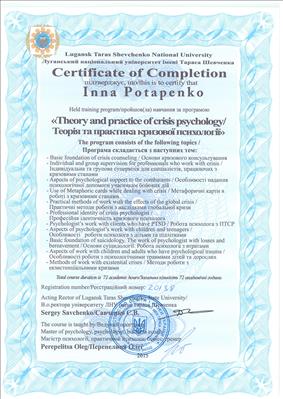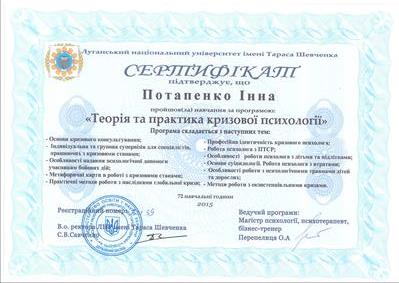 Магістр психології, практикуючий психолог, психолог-сексолог, кризовий и травмопсихолог, сiмейний i парний психолог, груповий терапевт, психосексуальна корекція чоловічих і жіночих дисфункцій, дитяча та підліткова сексологія, системна сімейна терапія, гештальт консультант, арт - терапія, робота з МАК, арт - коуч, тренер.