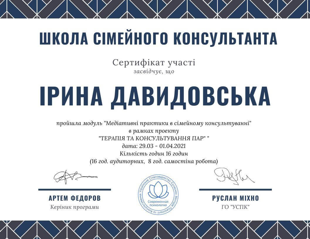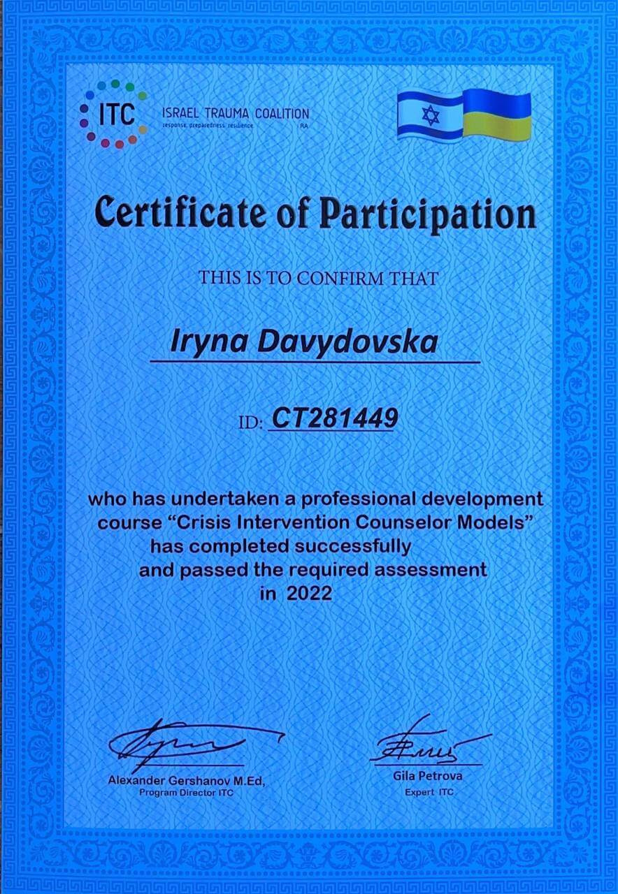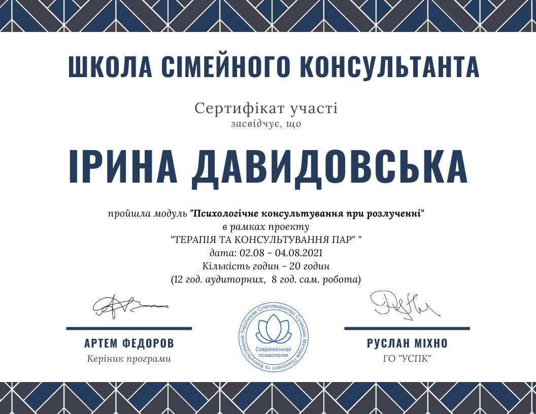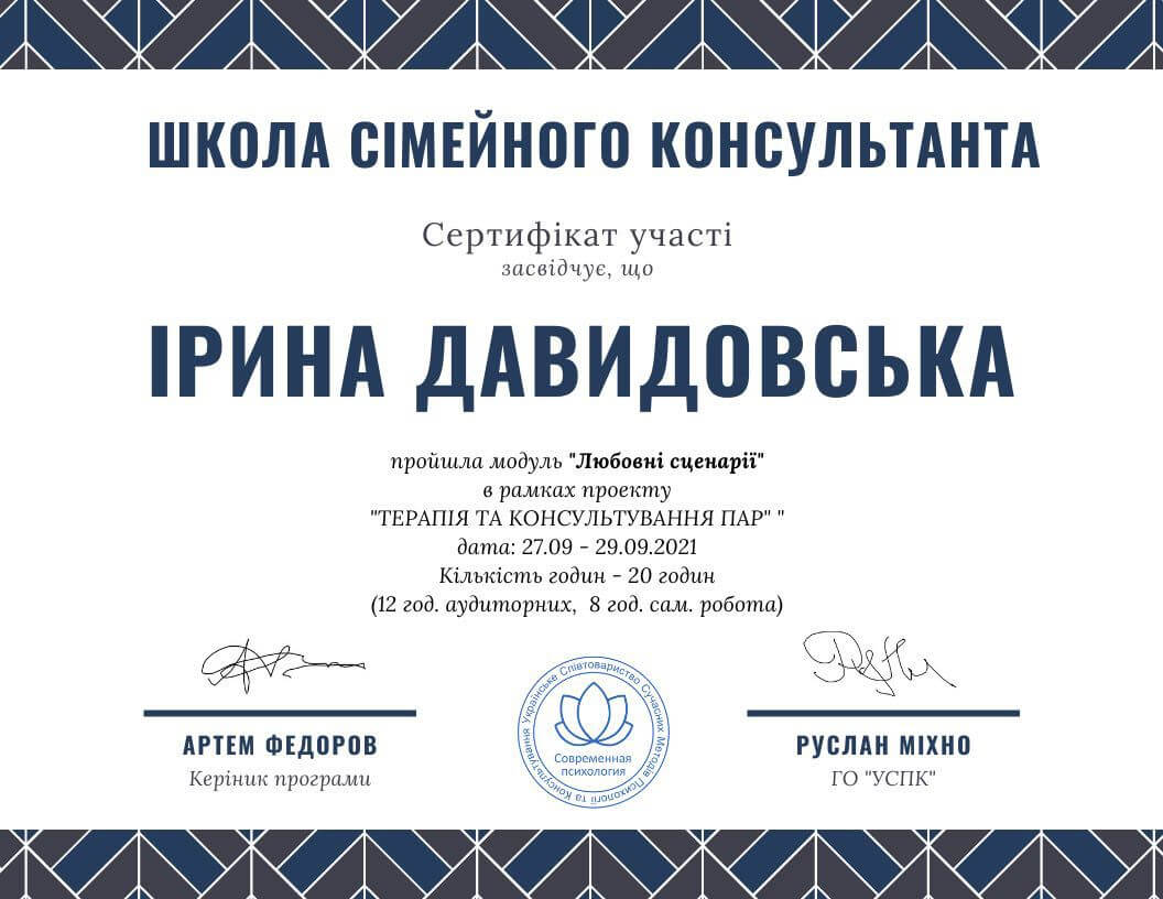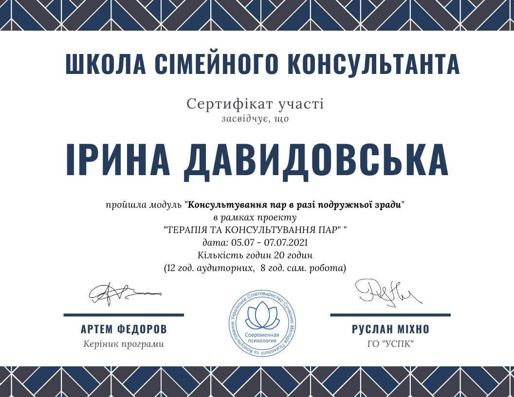 Меня зовут Ирина, я сертифицированный специалист, рекомендованный Ассоциацией Психологов Украины. работаю в методе интерперсональной психотерапии.
