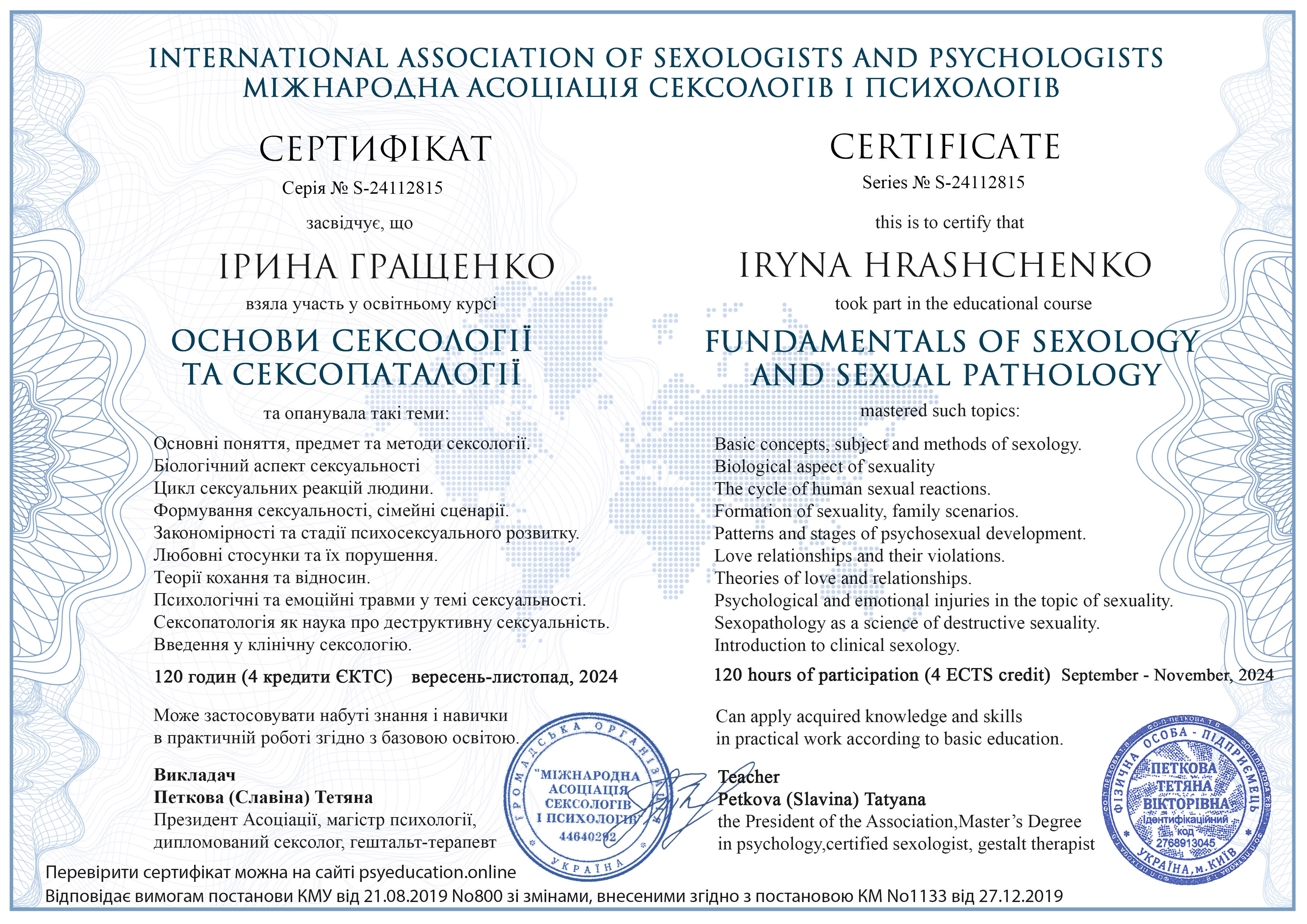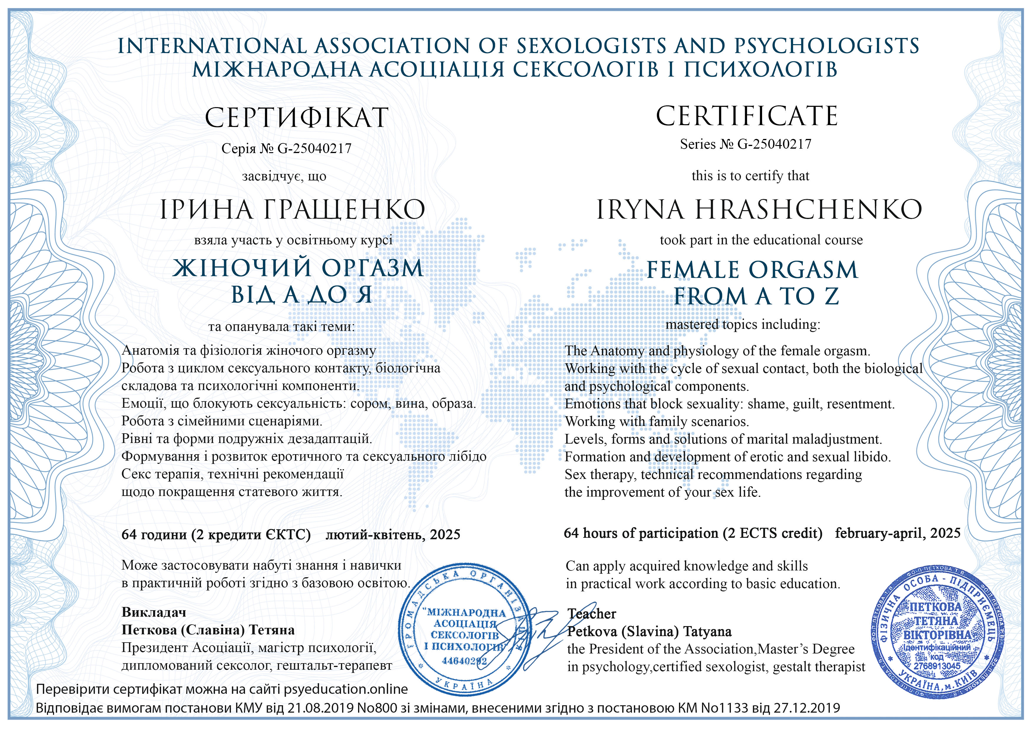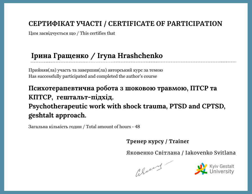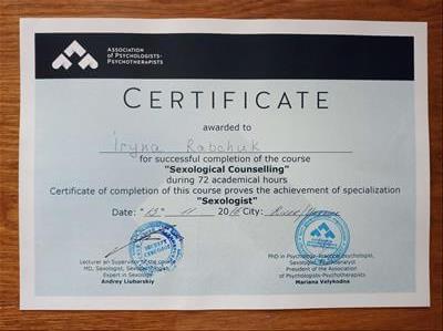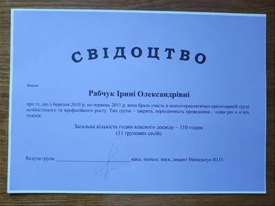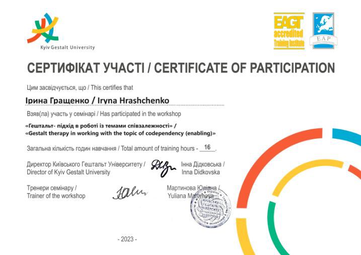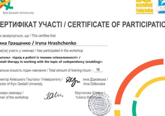 Обучаюсь на второй ступени Киевского Гештальт Университета (третий год обучения, перешла экватор).