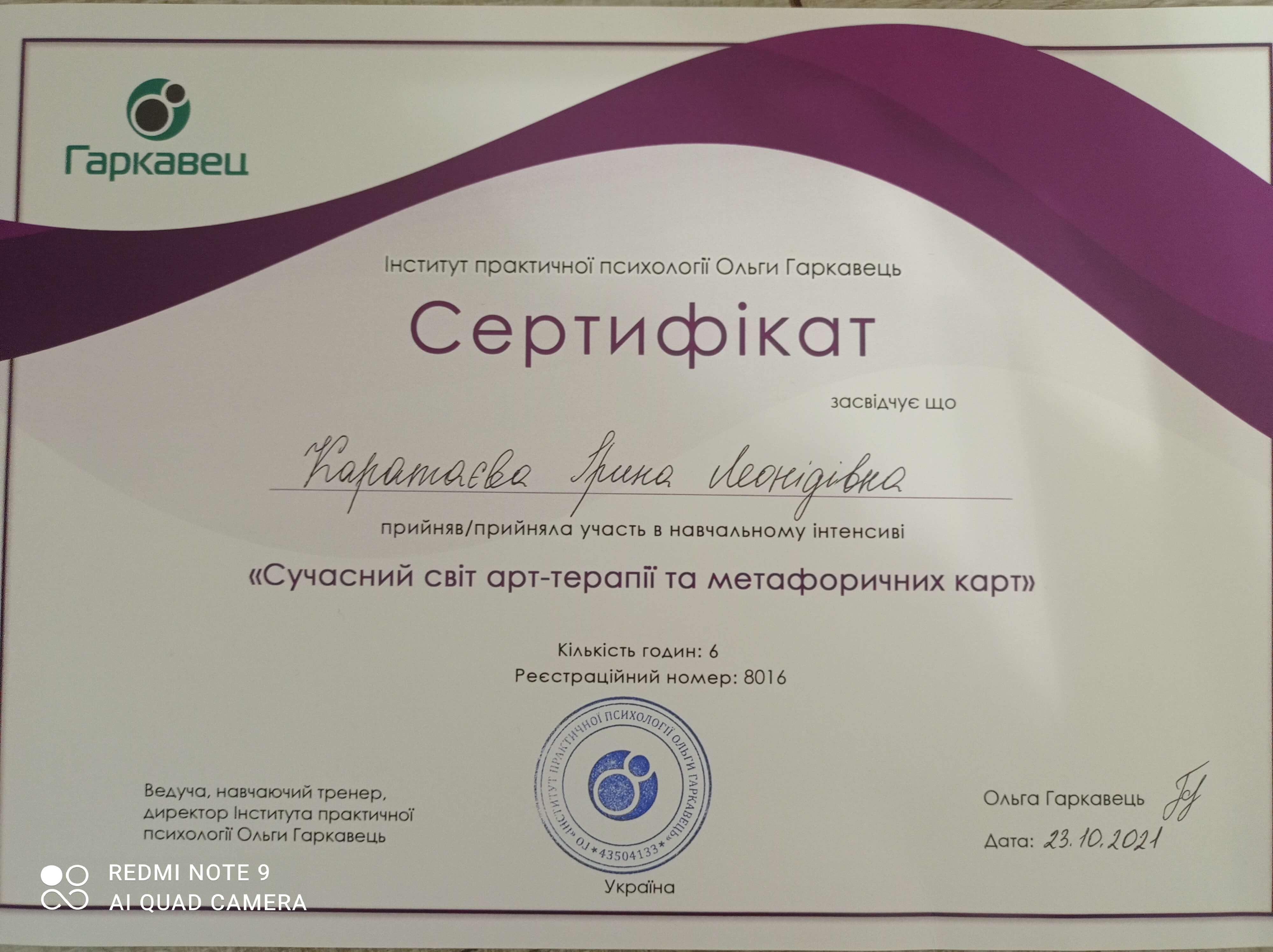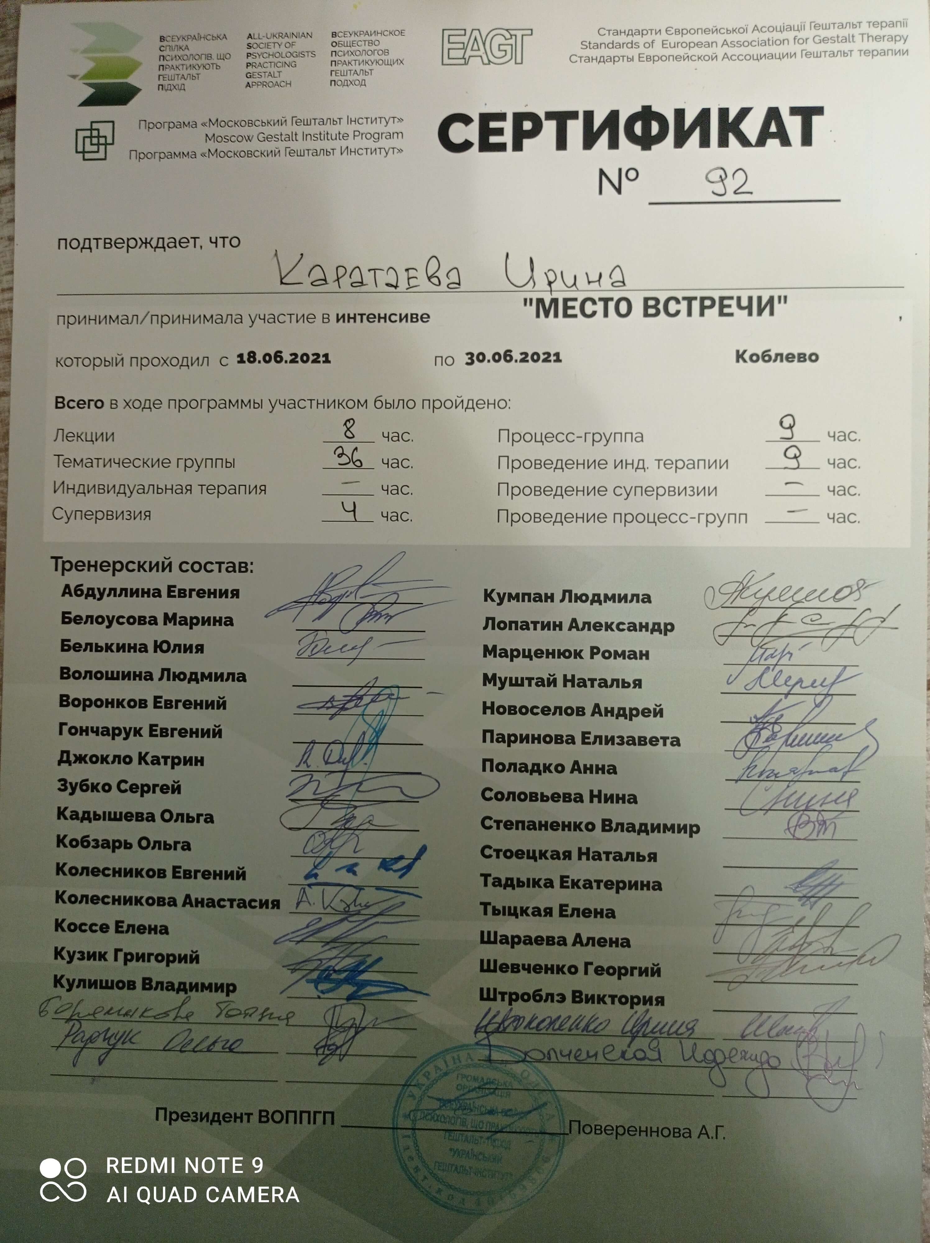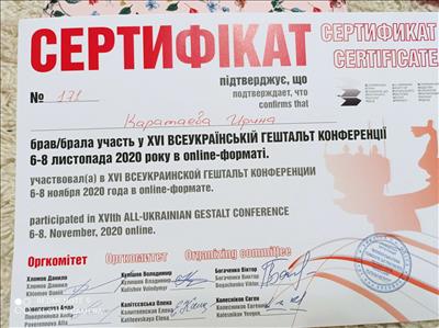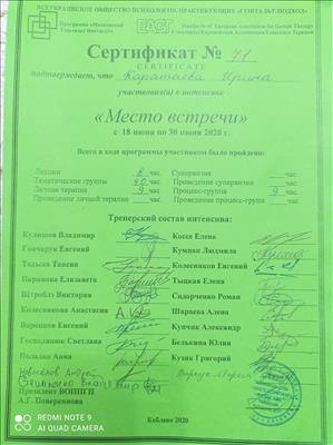 Есть собственная терапия более 5 лет, супервидение и интервизия. Завершены специализации в гештальт-подходе, а именно: психосоматика, работа с гендерной идентичностью, отношения в паре, кризисы и травмы, клиническая и теории развития, работа с метафорическими картами и арттерапия.
