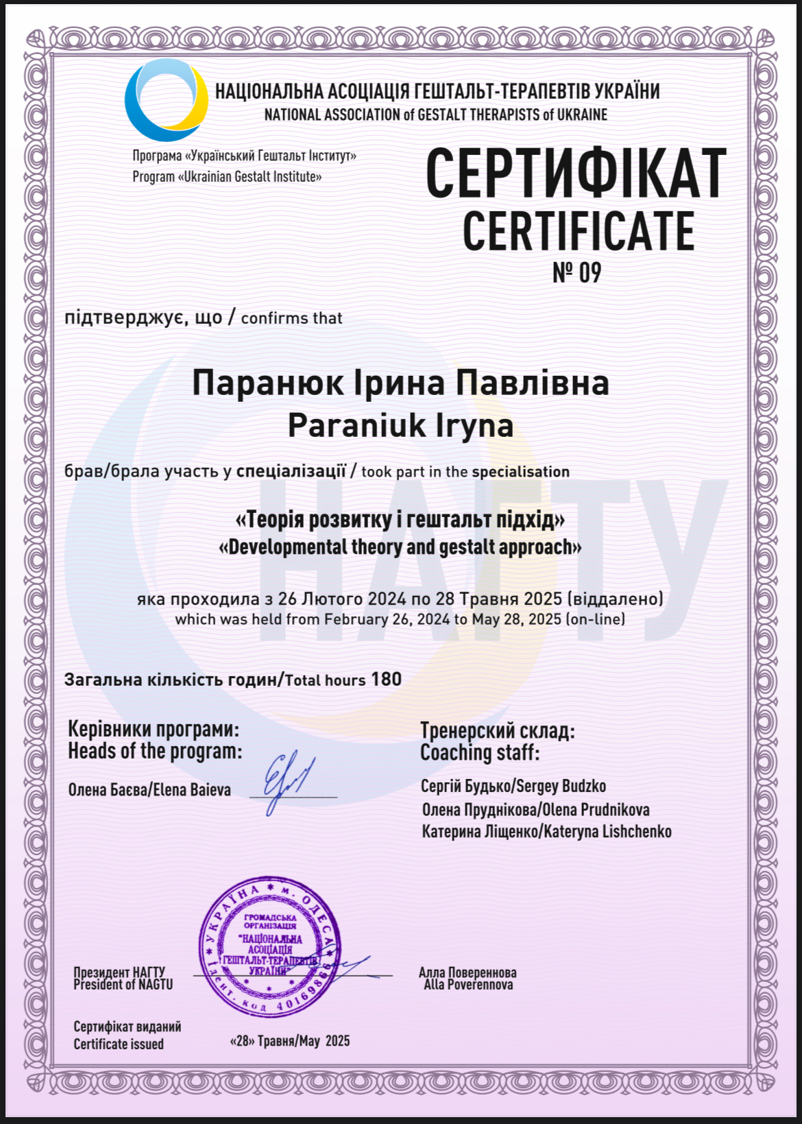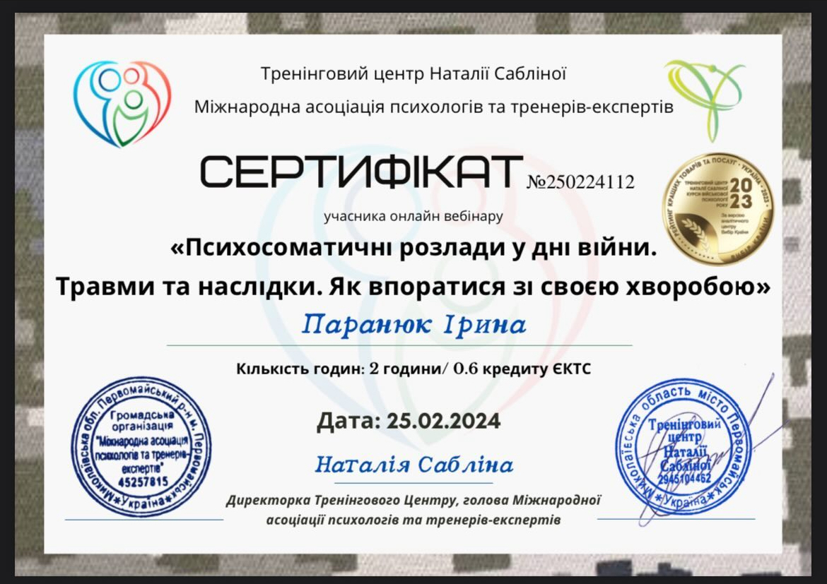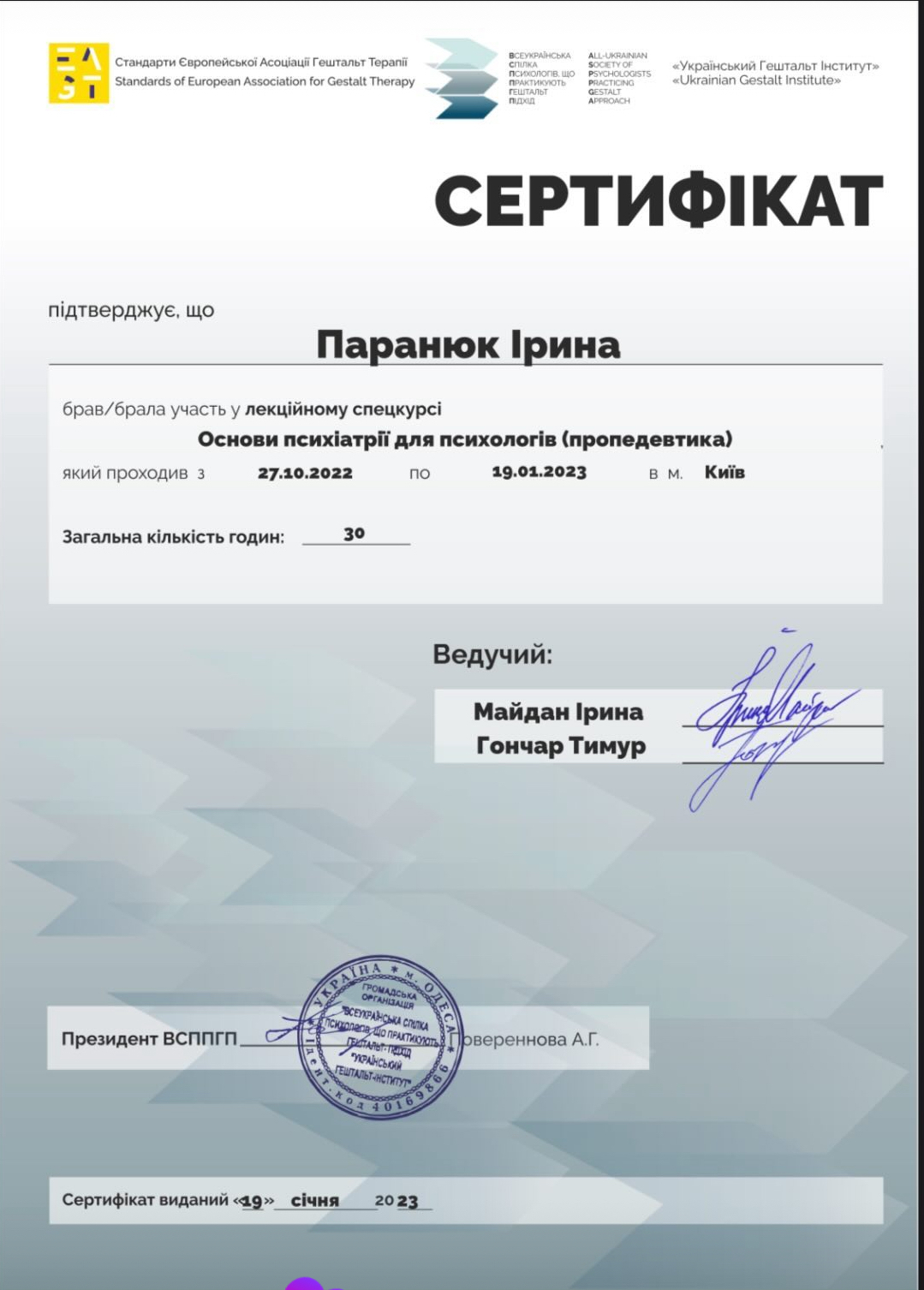 Завершила 1,2 степень гештальта терапия НАГТУ
