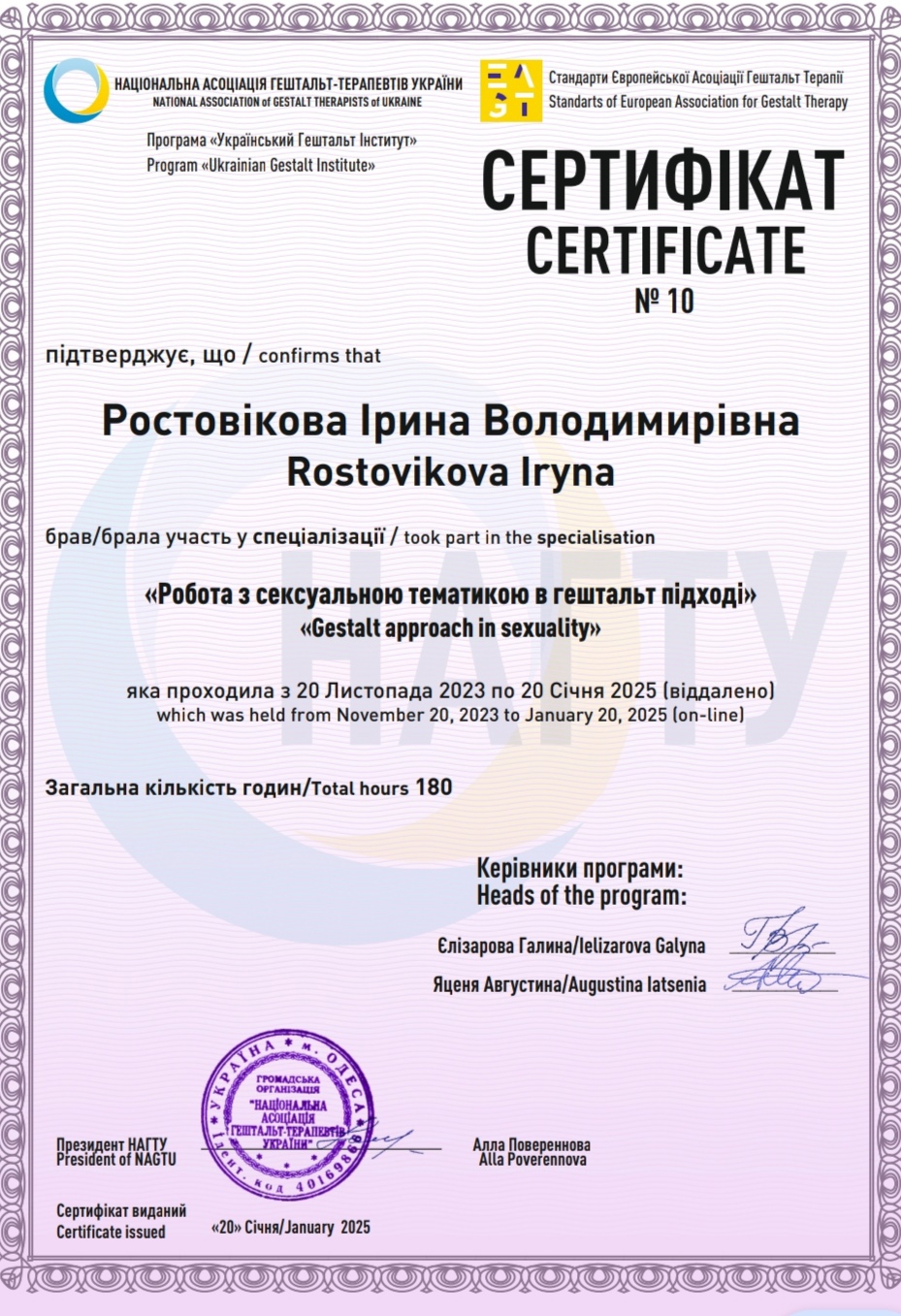 Завершила специализацию "Телесный процесс в гештальт-терапии".