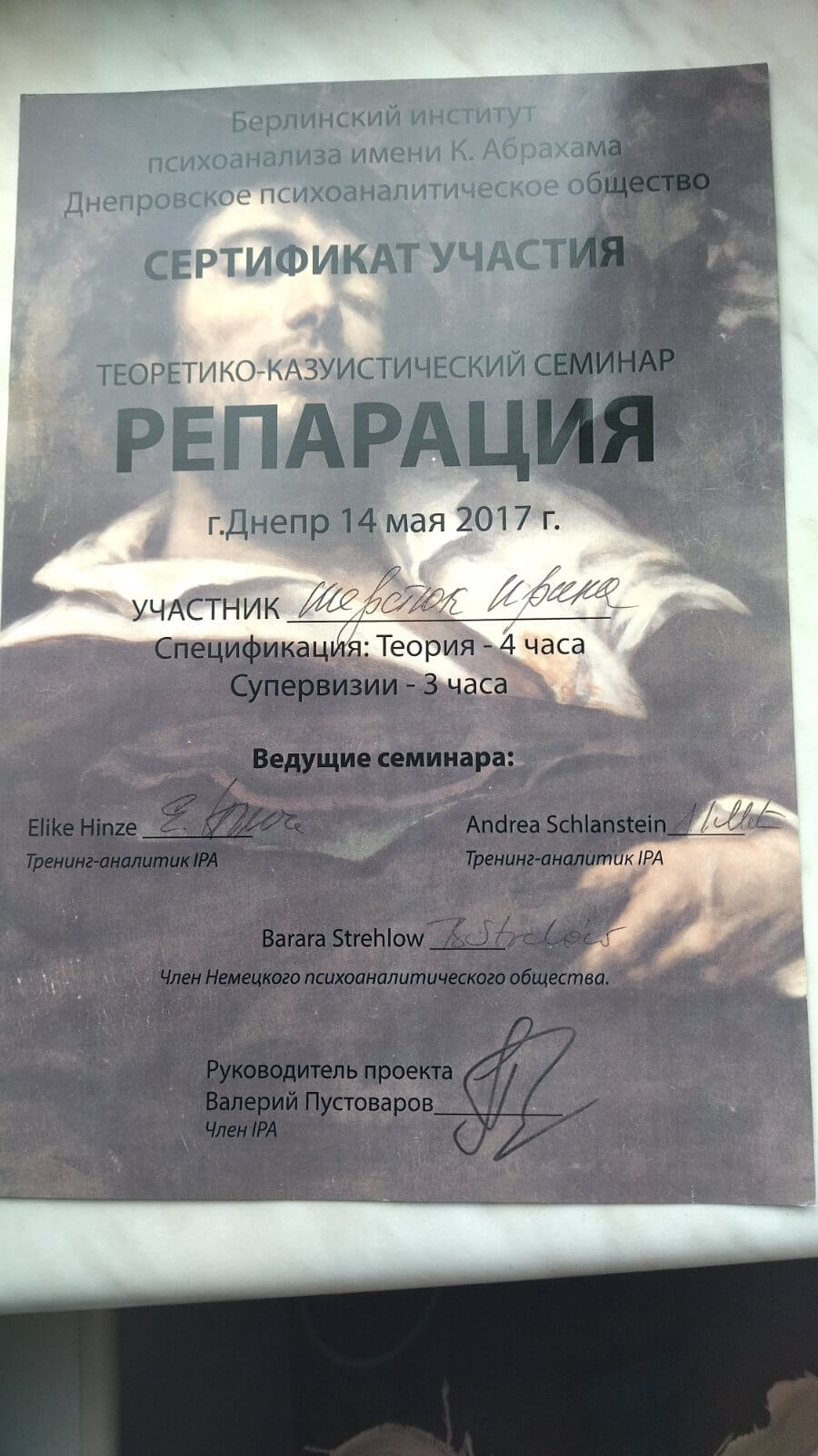 Ежемесячно участвую в семинарах, в основном, с приглашенными тренер-аналитиками Великобритании, Германии, Франции. 2 раза в неделю имею супервизии с аналитиками из Великобритании и Германии.