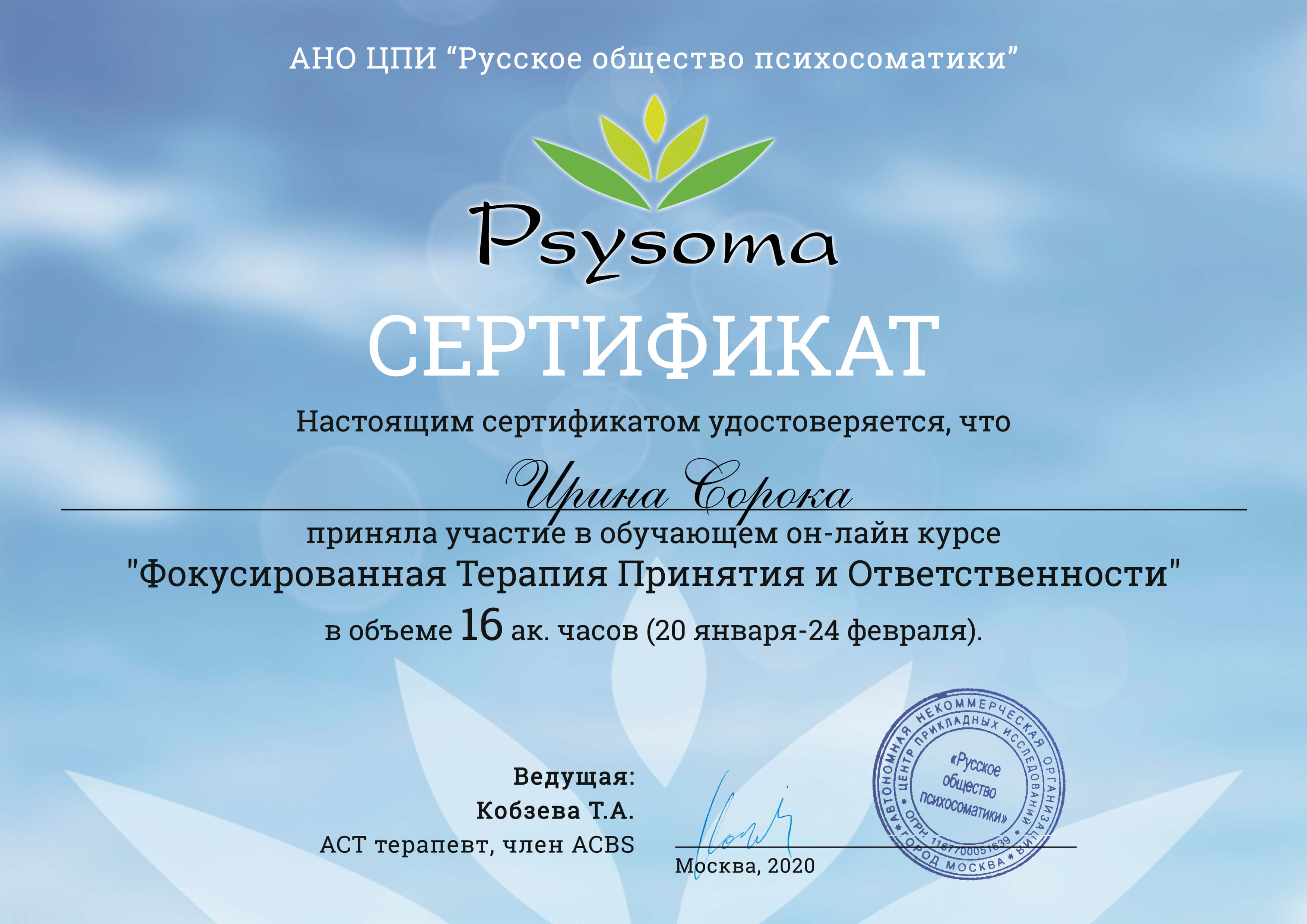2020 г. январь-февраль «ФАКТ (Фокусивная терапия принятия и ответственности)»