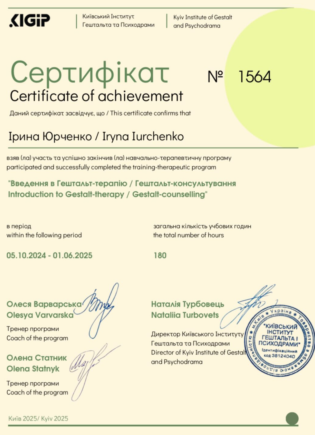 Окончила курс по основам КПТ от Международного института психологии. Закончила повышение квалификации психологической помощи военным и их близким от Южноукраинского университета им. Ушинского. Имею членство в Complex trauma institute, прошла там курс травматерапии в технике Rewind, а также прохожу курс ACT-TF по работе с расстройствами тела. Прошла 8-шаговая программа по работе с потерей. Сейчас учусь на 1 ступени гештальта в КИГИП.