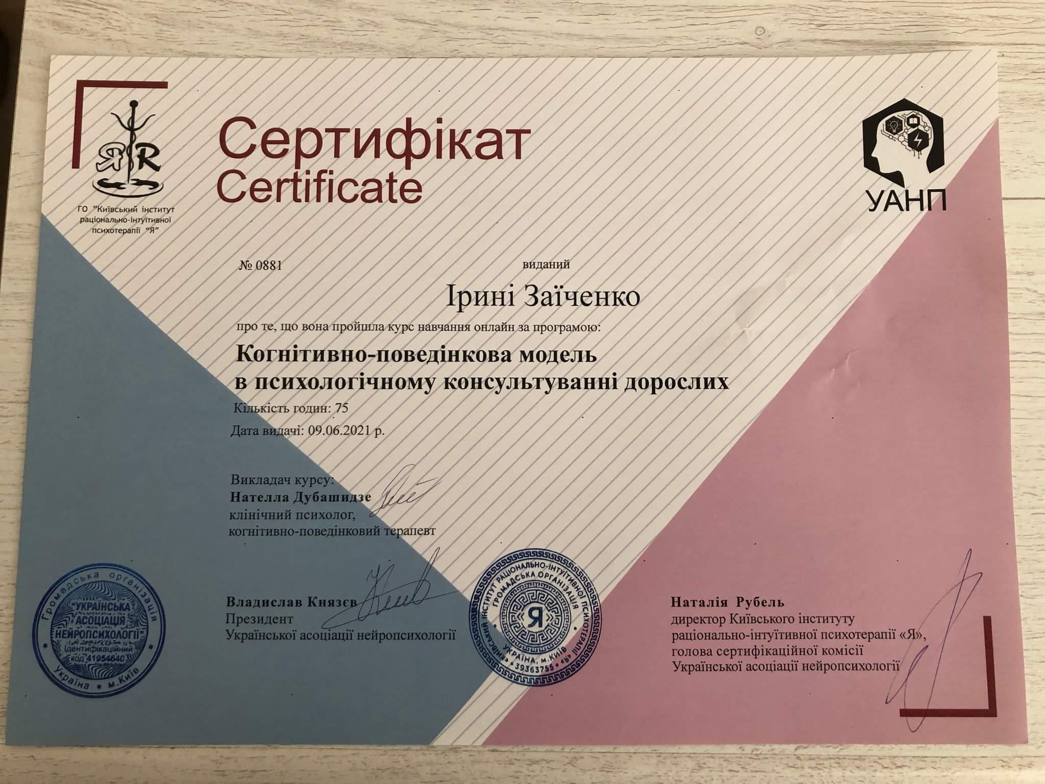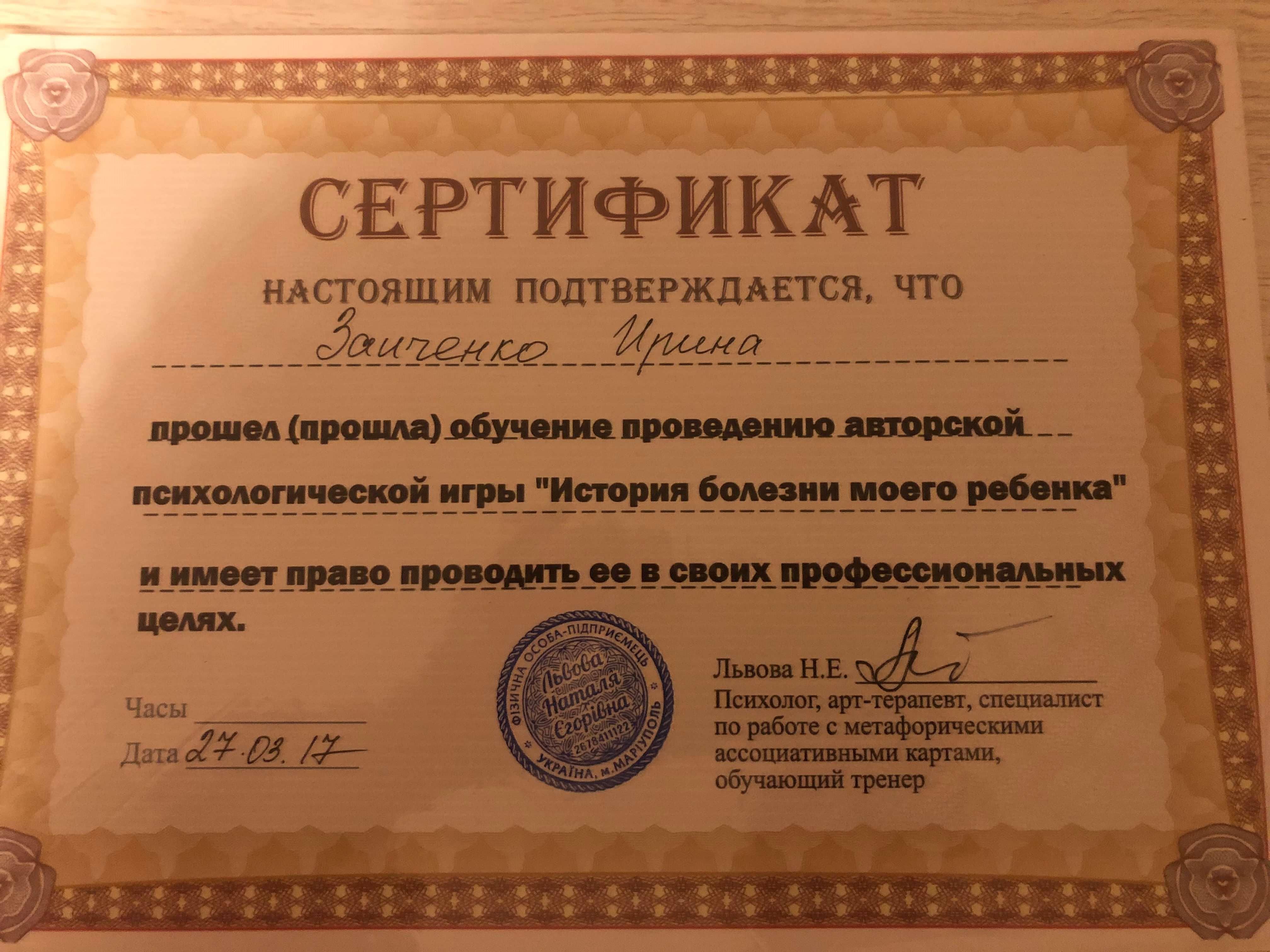 КНУ имени Тараса Шевченко, диплом специалиста, психолог, преподаватель психологии. Курсы по детской практической психологии и песочной терапии. Повышение квалификации по психологическому консультированию в гештальтподходе на 152часа. На данный момент обучаюсь на второй ступени в УИСГТ, участник обучающей программы по аналитической психологии и консультирование методами КПТ взрослых клиентов.