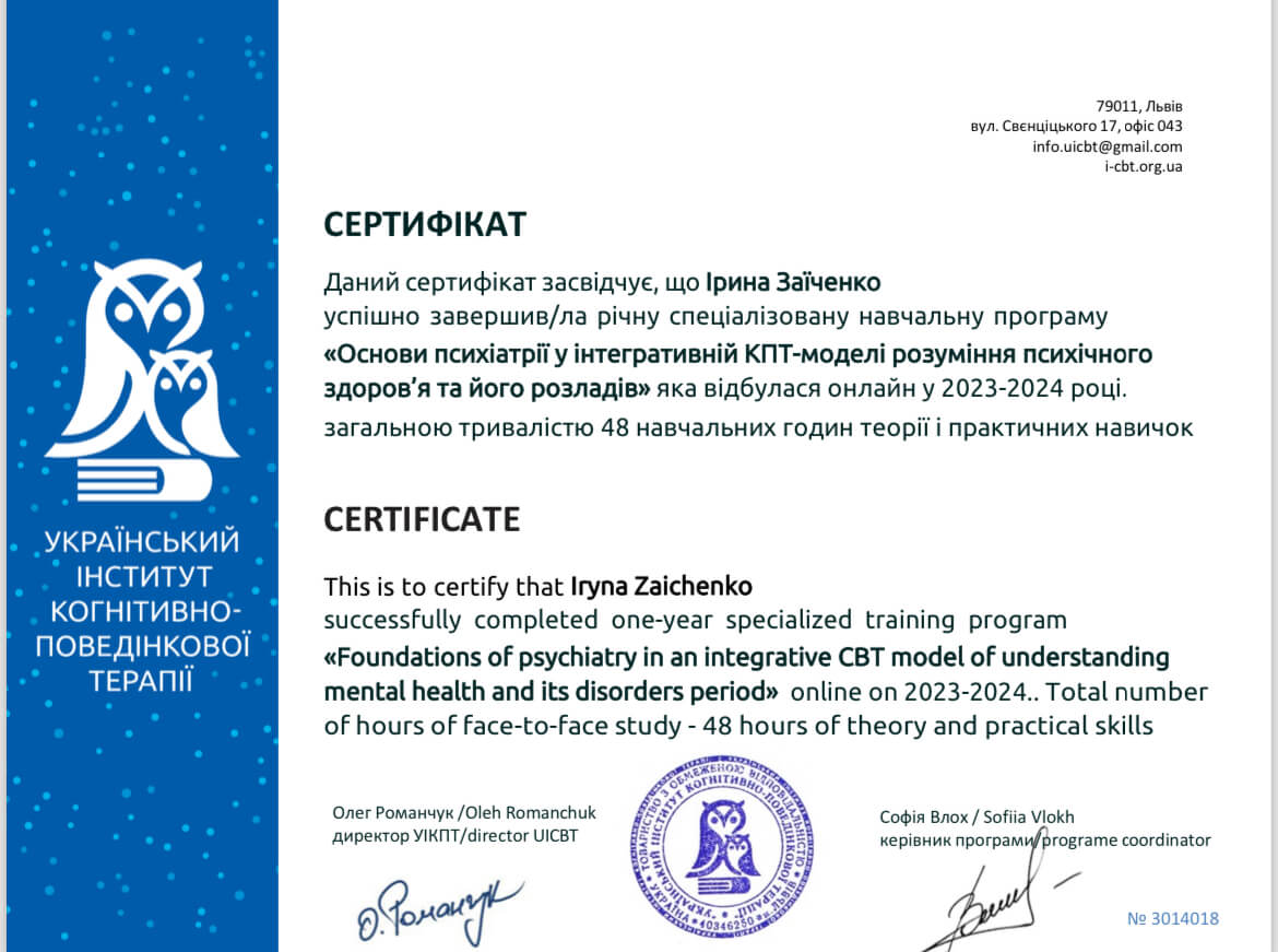 Прохожу обучение на второй ступени Украинского института Современной Гештальттерапии, также обучаюсь в программе “Грани Sandplay” ( юнгианская аналитическая психология),