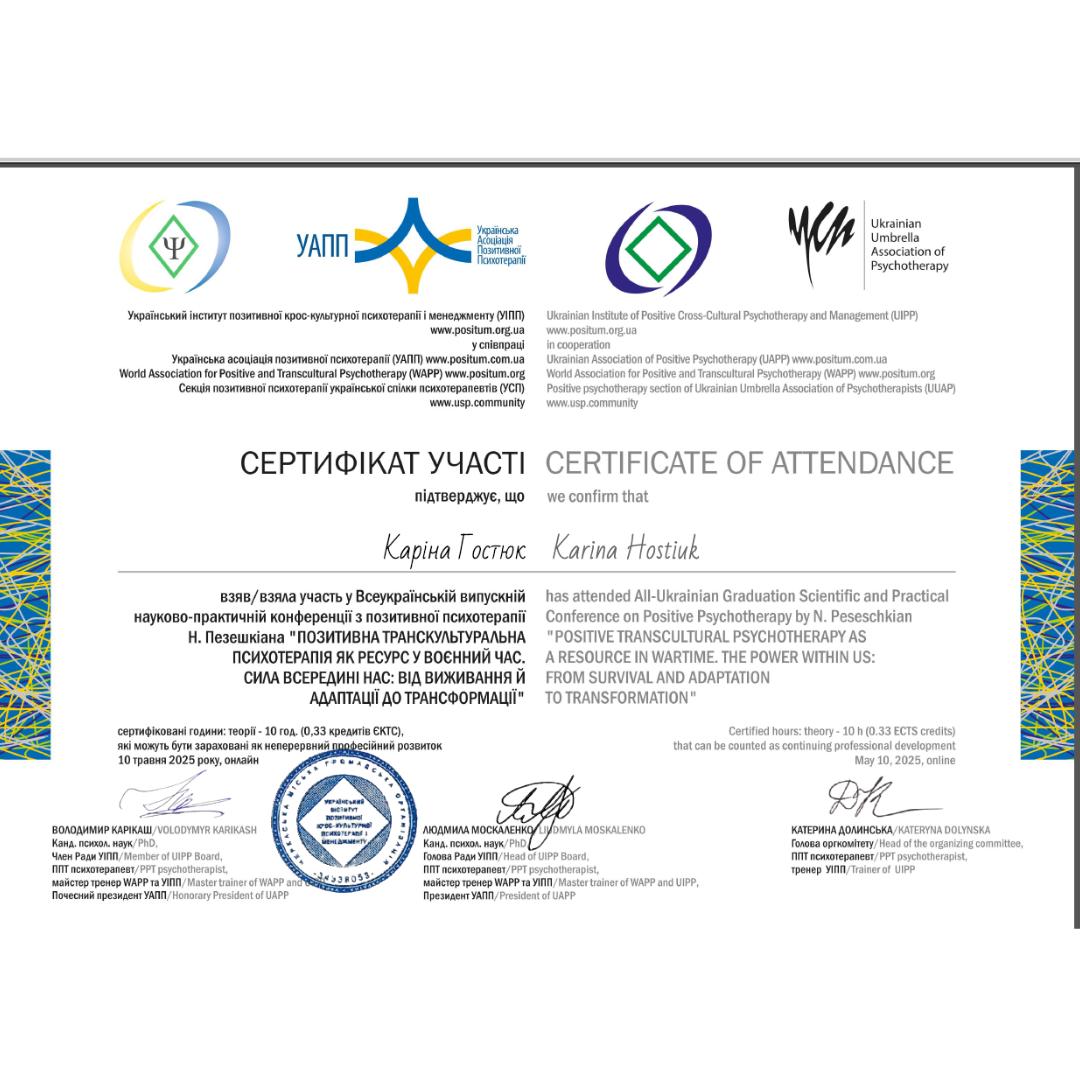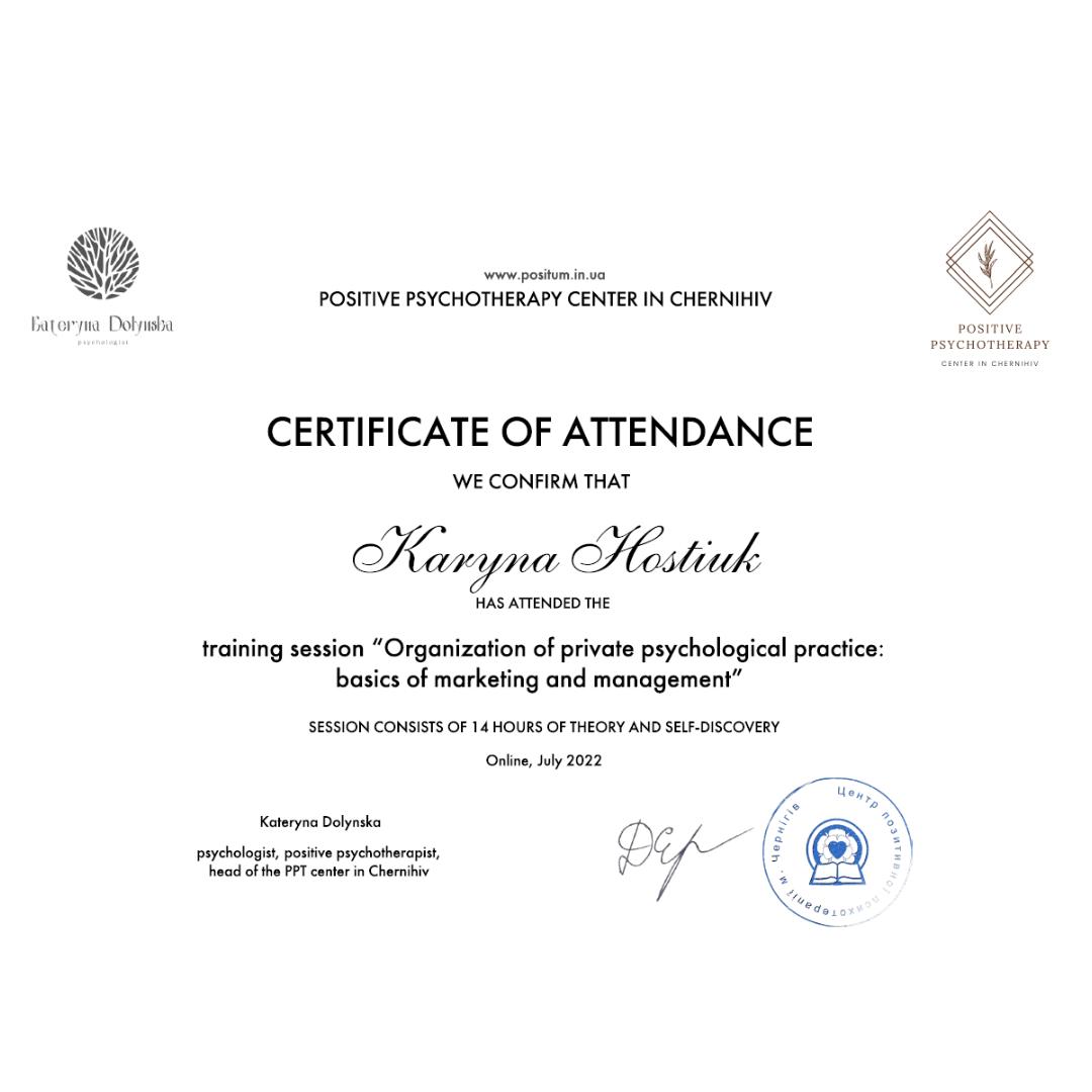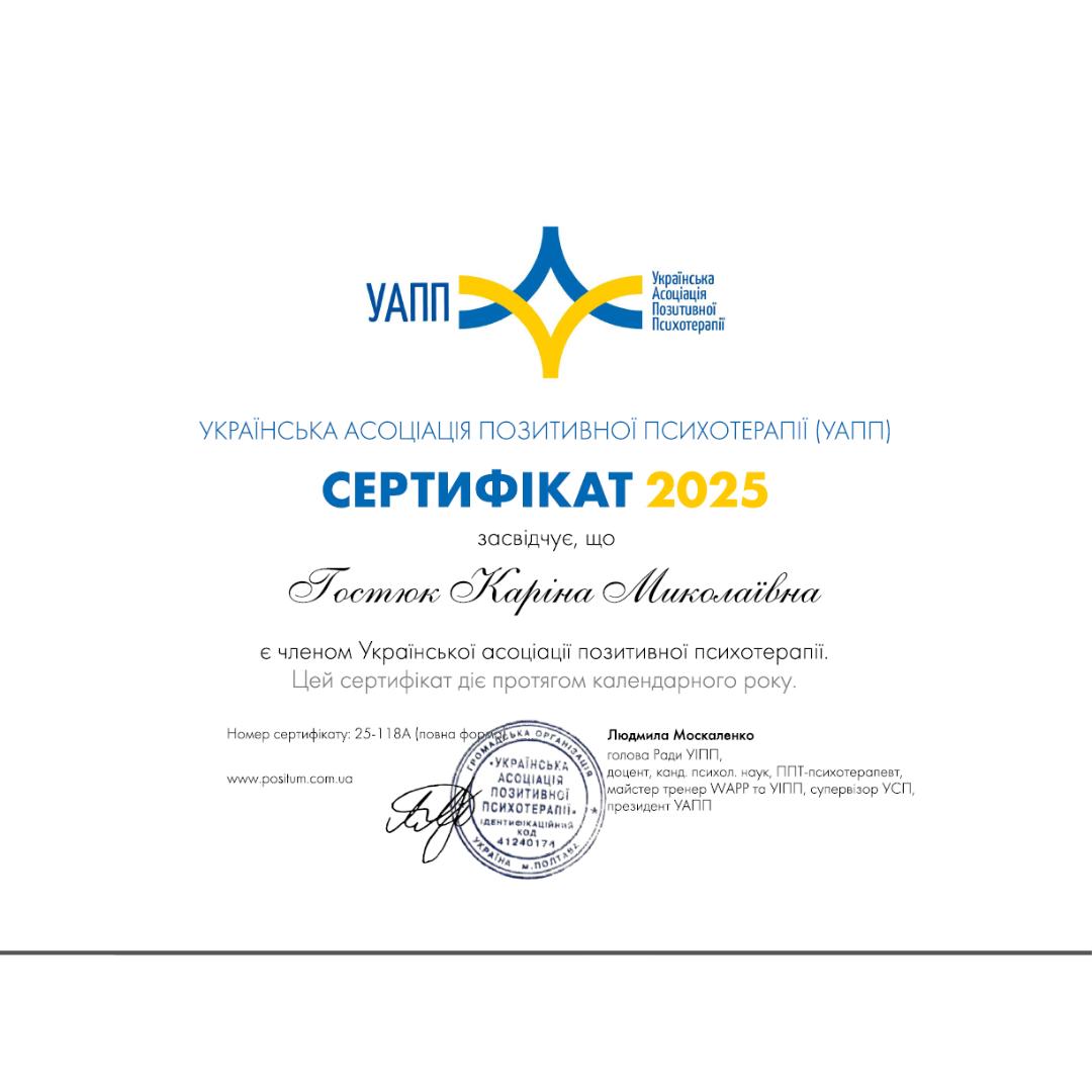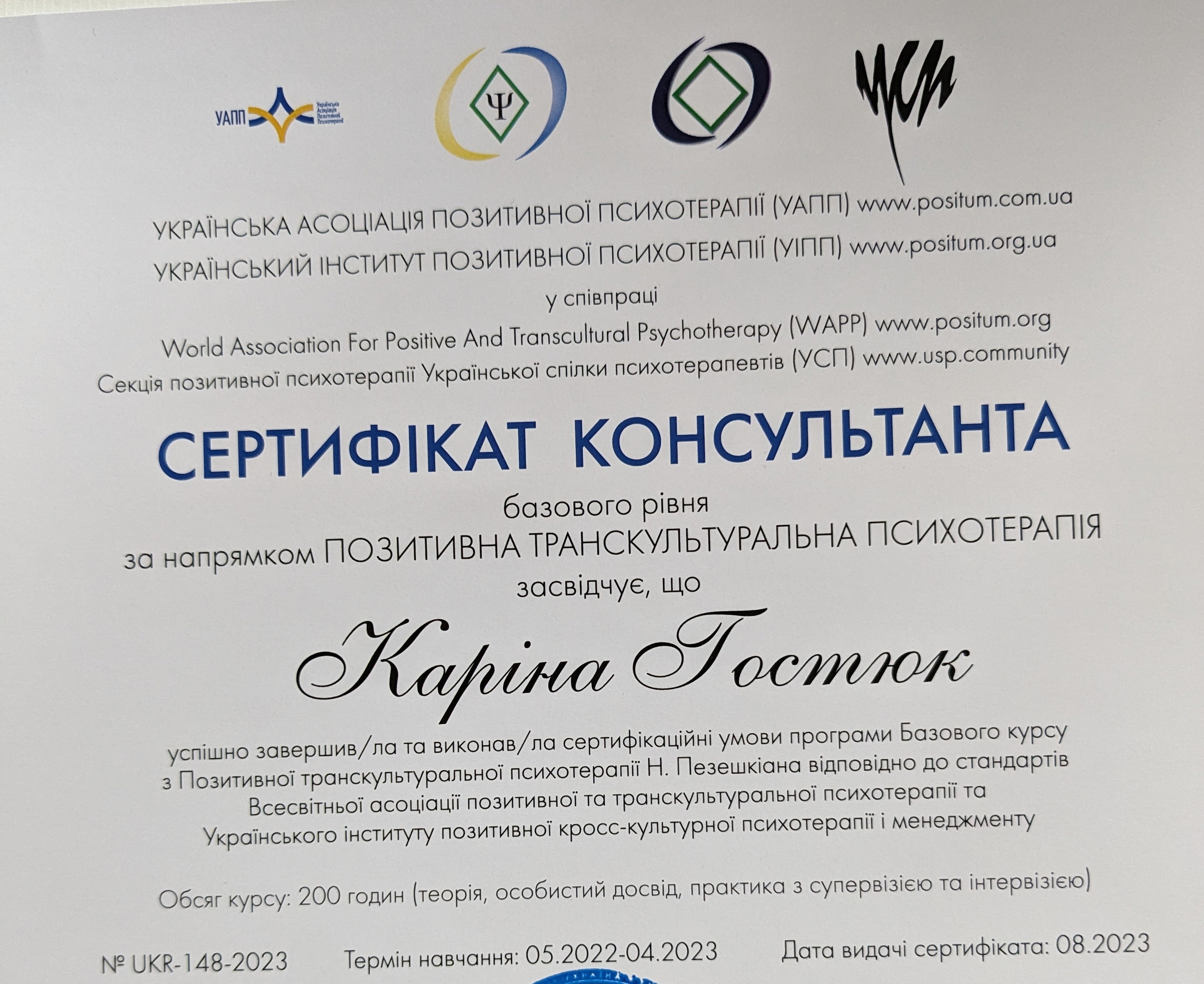 Завершила магистратуру Международного гуманитарного университета по специальности "психология", базовый курс по положительной психотерапии (УИПП), учусь на психотерапевта в этом же методе на мастер курсе по ППТ (УИПП), член УСП, ВАПП и УАПП
