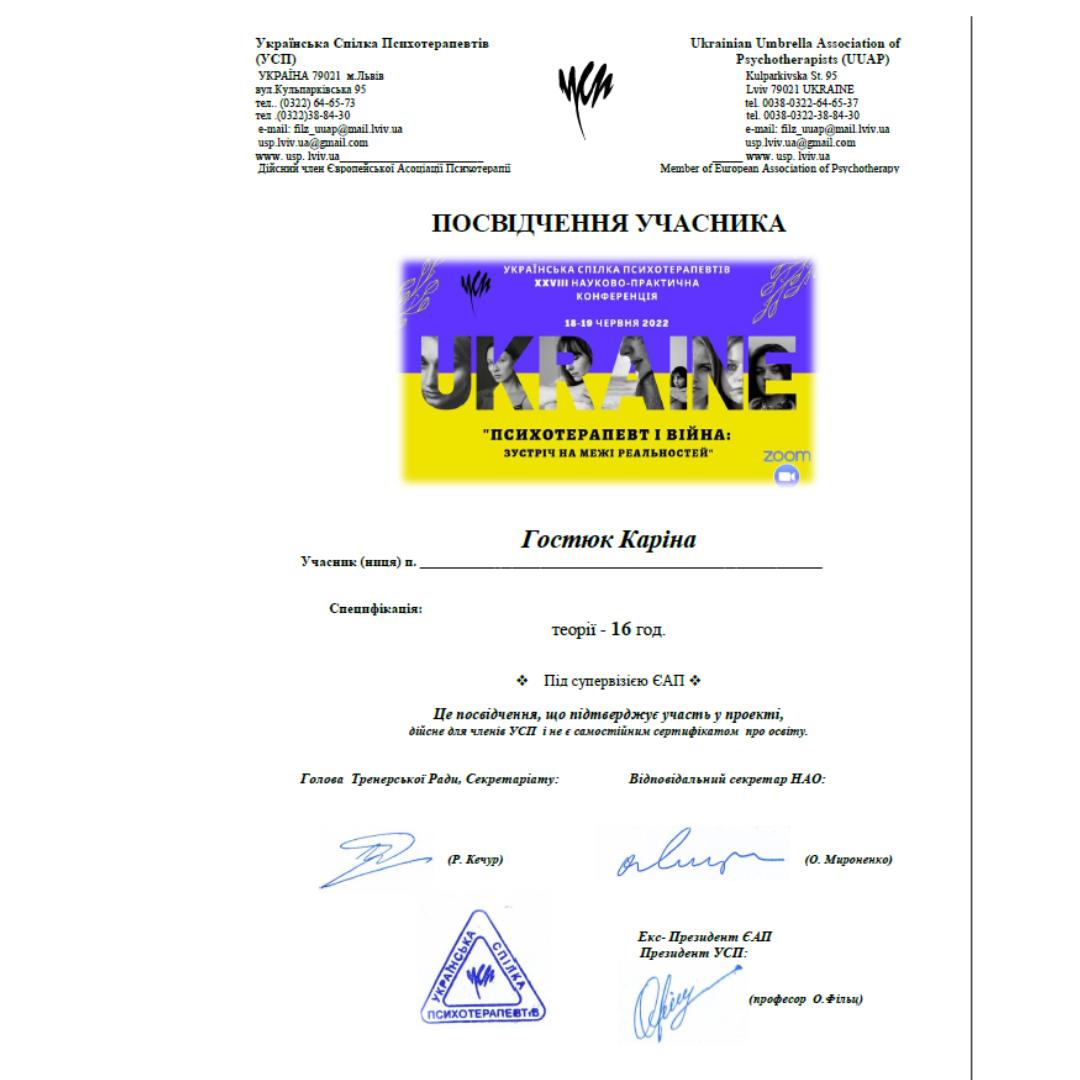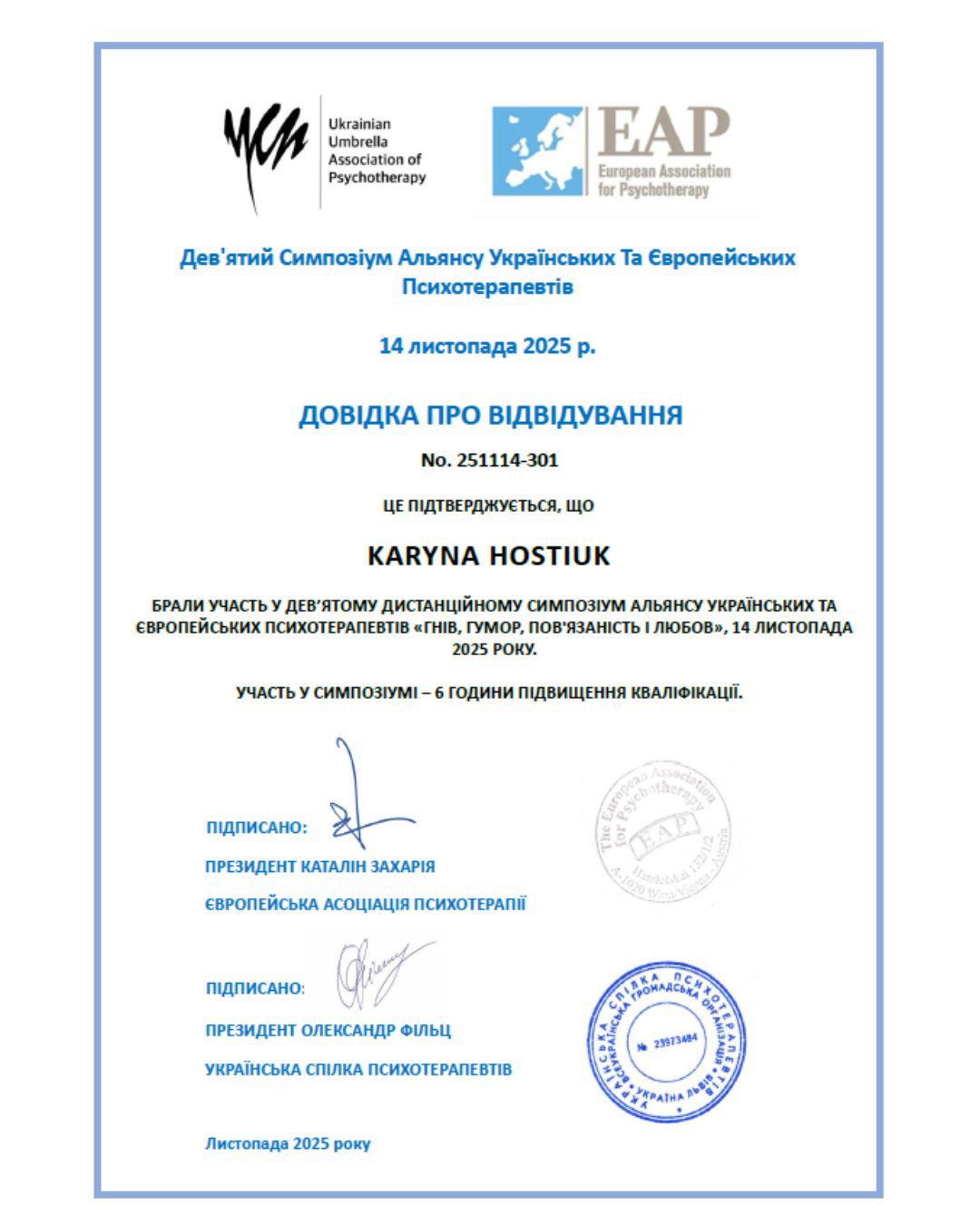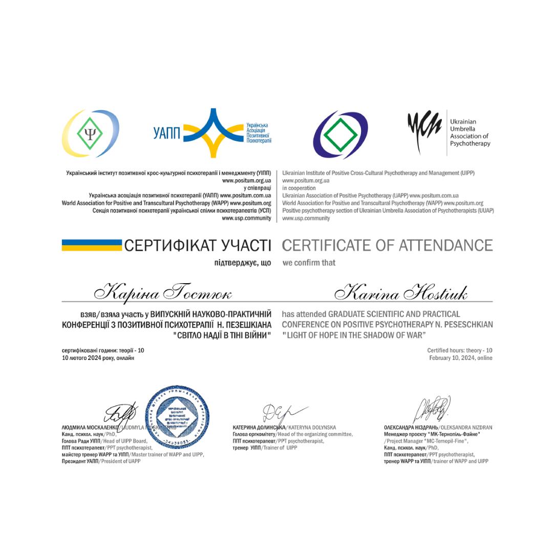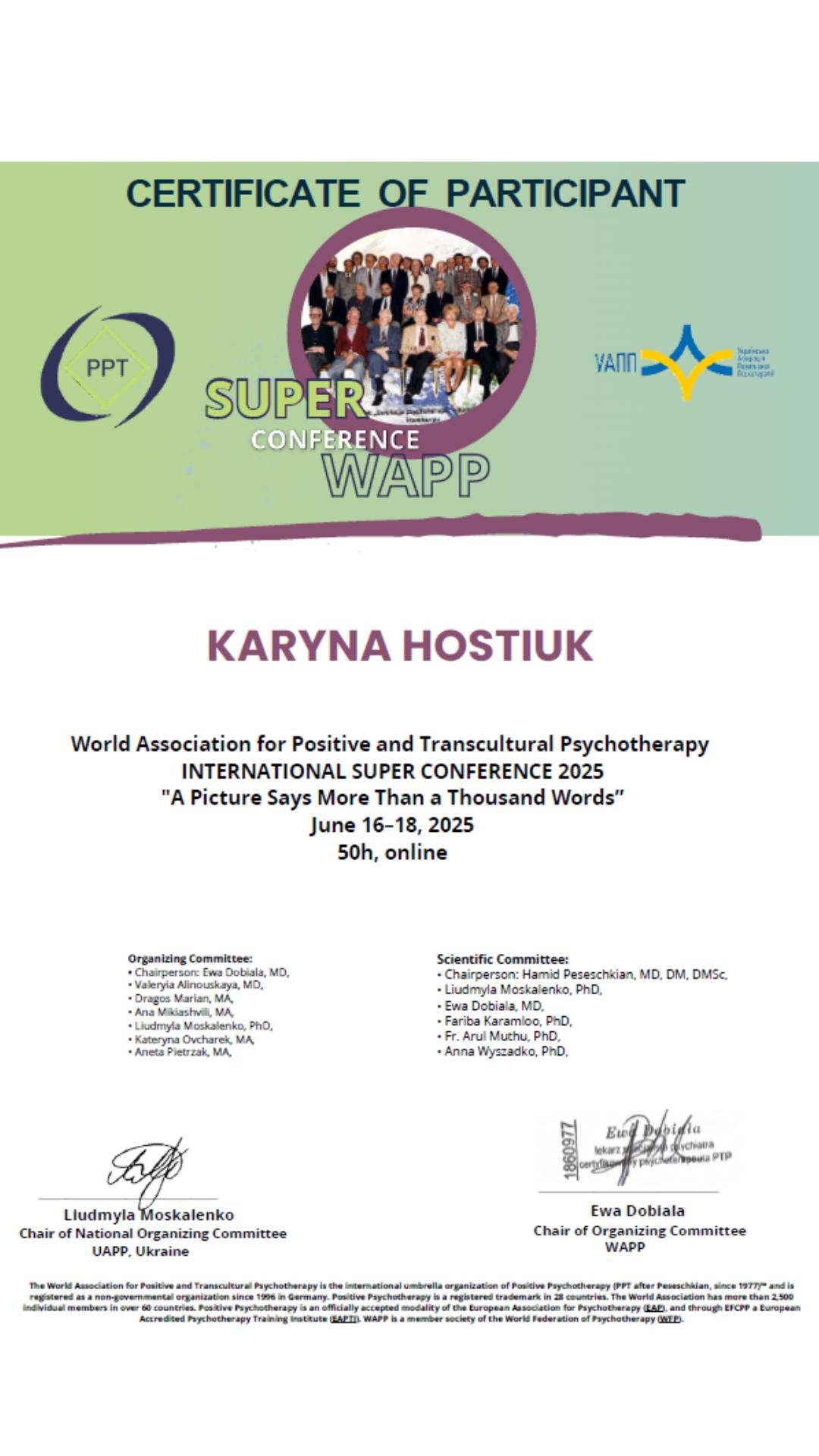 Завершила магистратуру Международного гуманитарного университета по специальности "психология", базовый курс по положительной психотерапии (УИПП), учусь на психотерапевта в этом же методе на мастер курсе по ППТ (УИПП), член УСП, ВАПП и УАПП