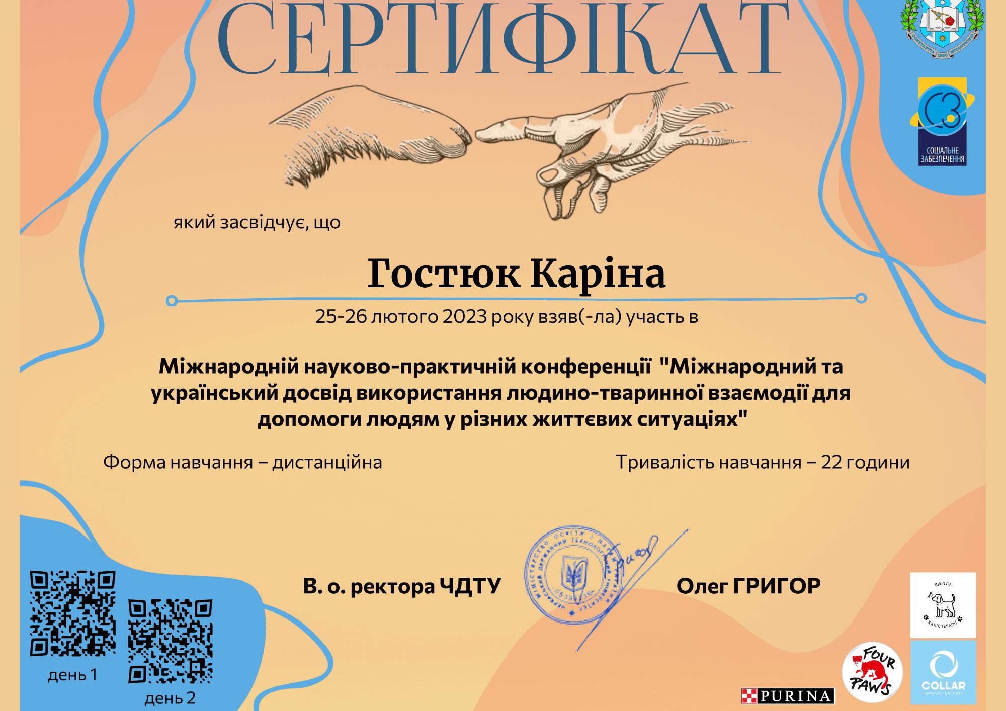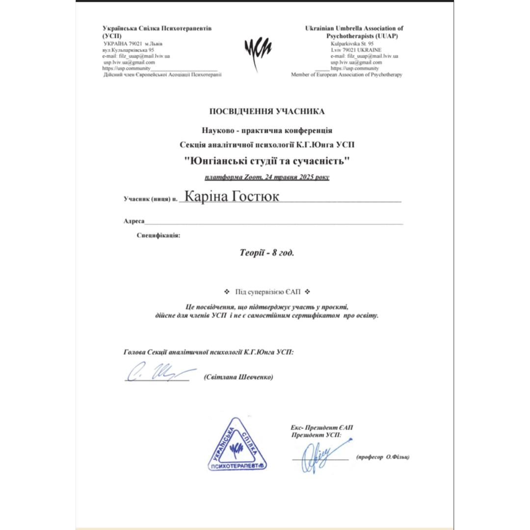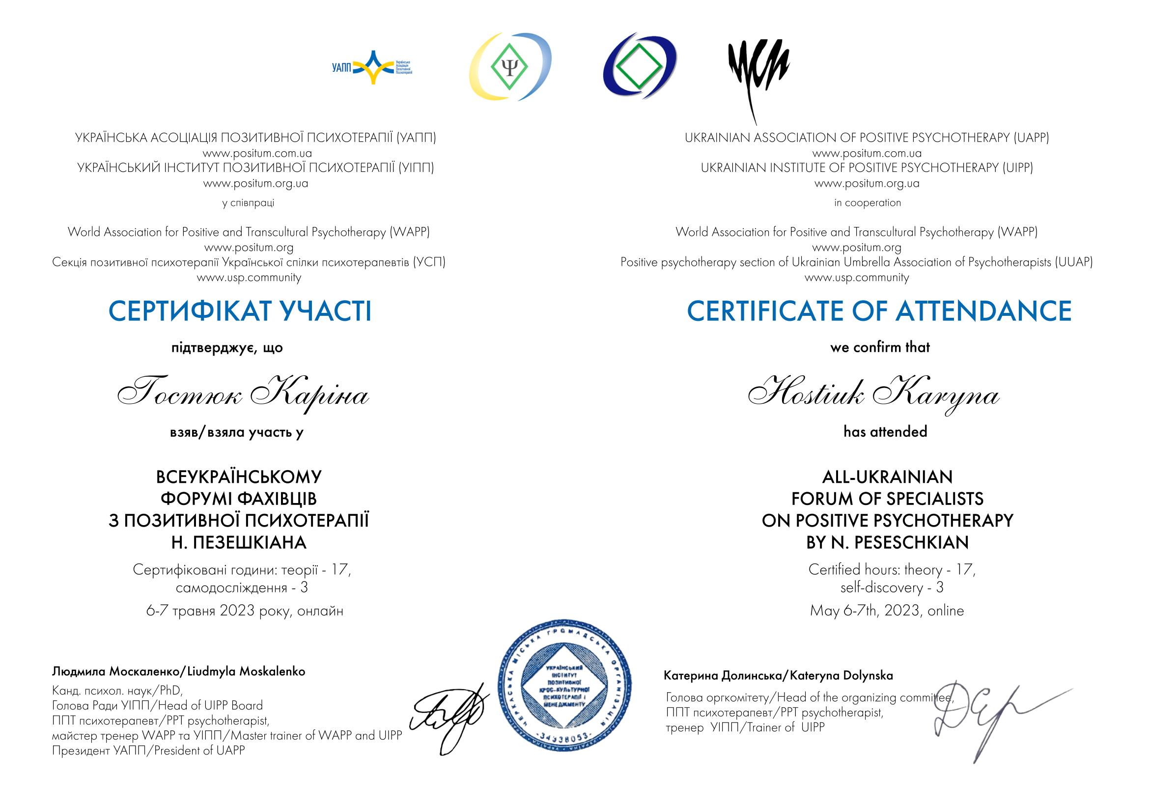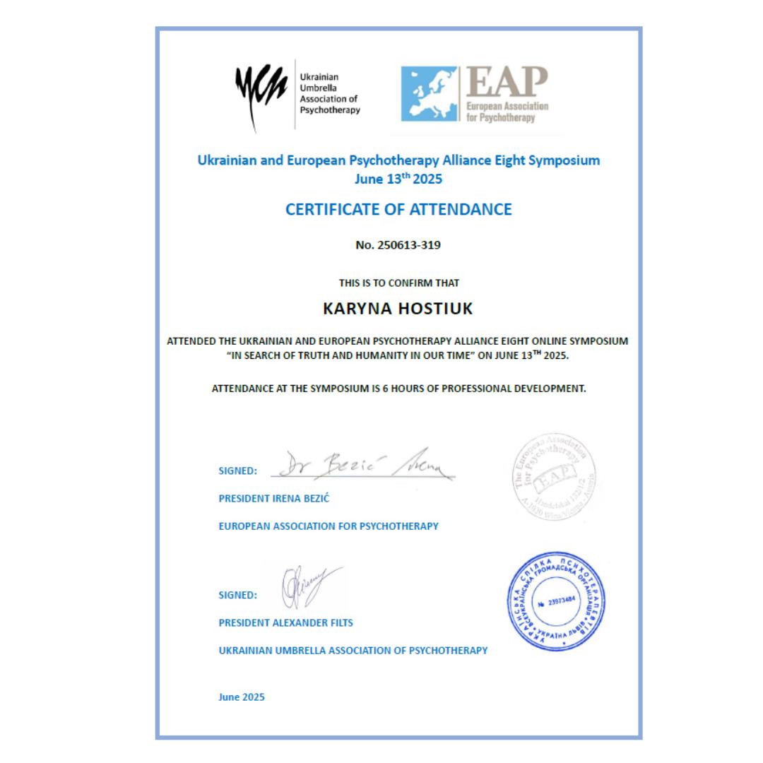 Завершила магистратуру Международного гуманитарного университета по специальности "психология", базовый курс по положительной психотерапии (УИПП), учусь на психотерапевта в этом же методе на мастер курсе по ППТ (УИПП), член УСП, ВАПП и УАПП