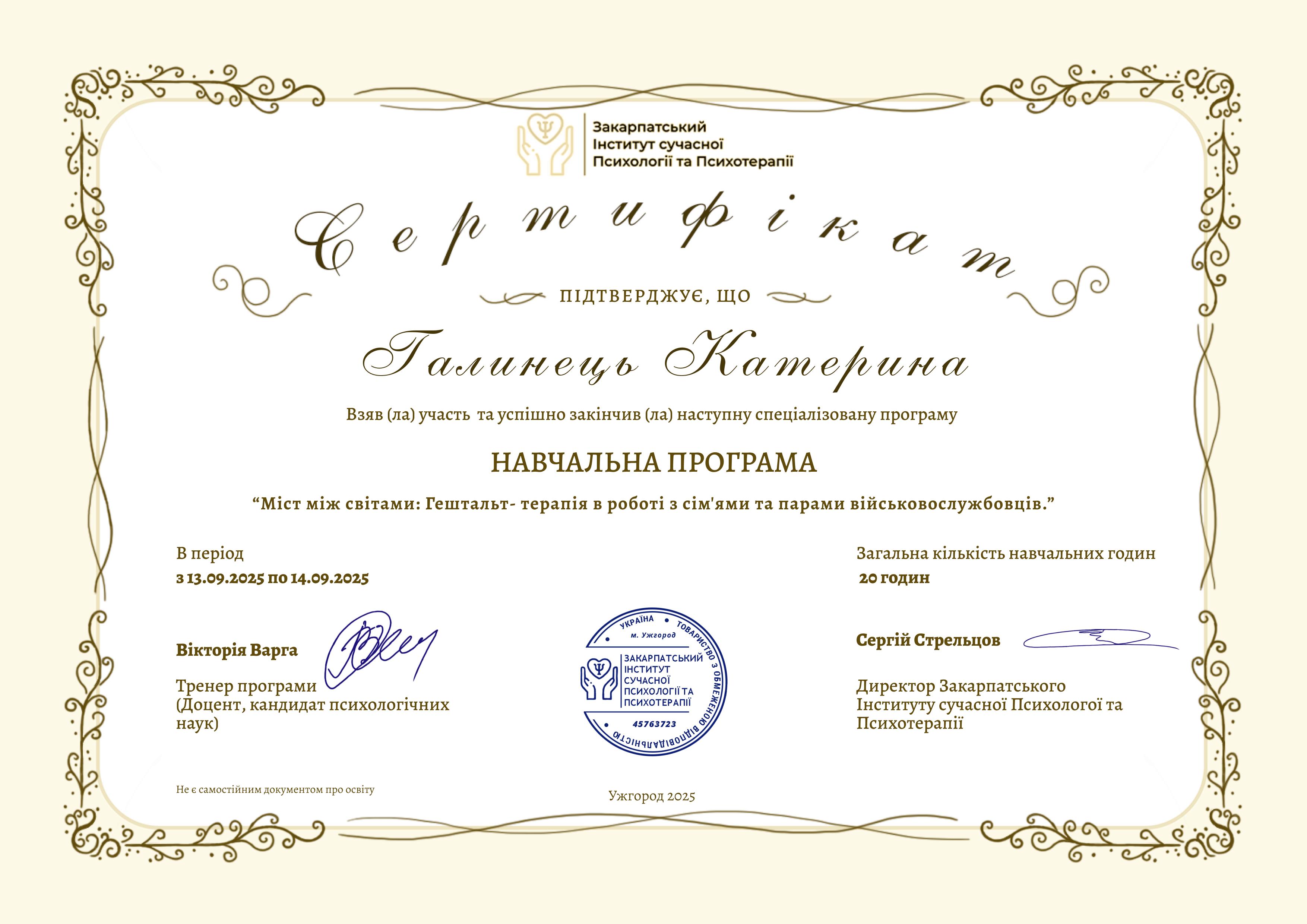 Киевский институт Гештальта и психодрамы, квалификация «Гештальт-терапевт»