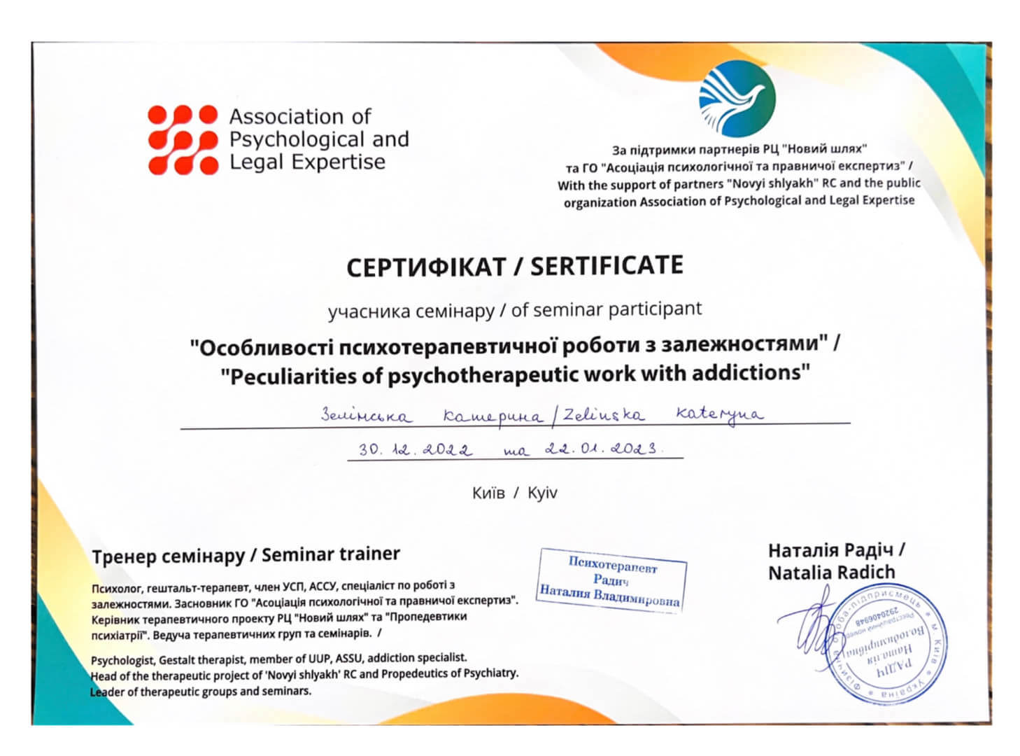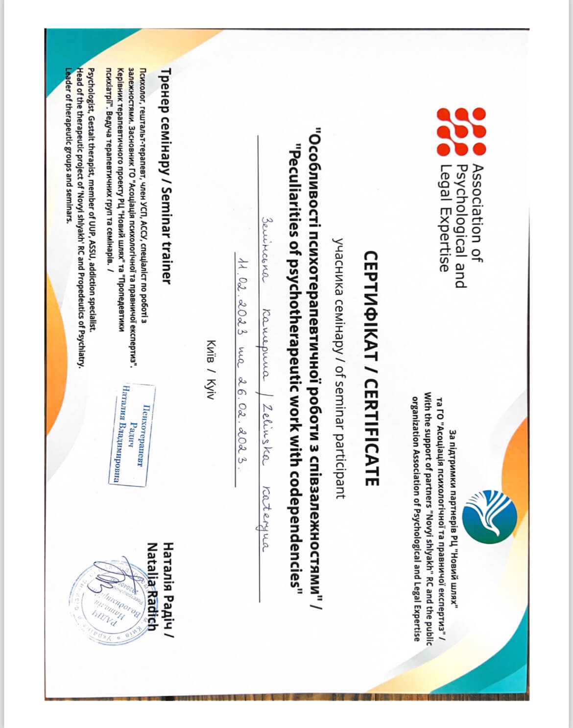 Специализация : «Работа с темами сексуальности» (Киевский гештальт университет)