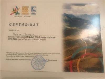 Закончила 2ю ступень в Киевском гештальт университете.