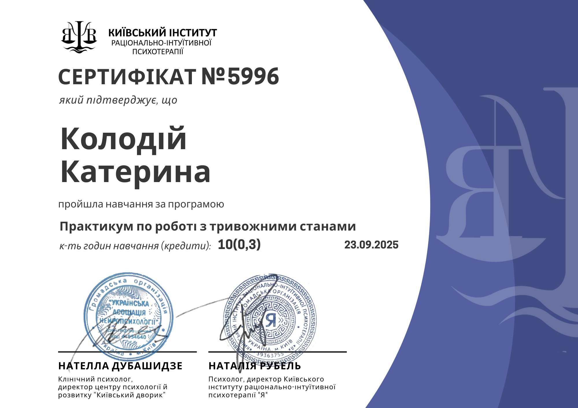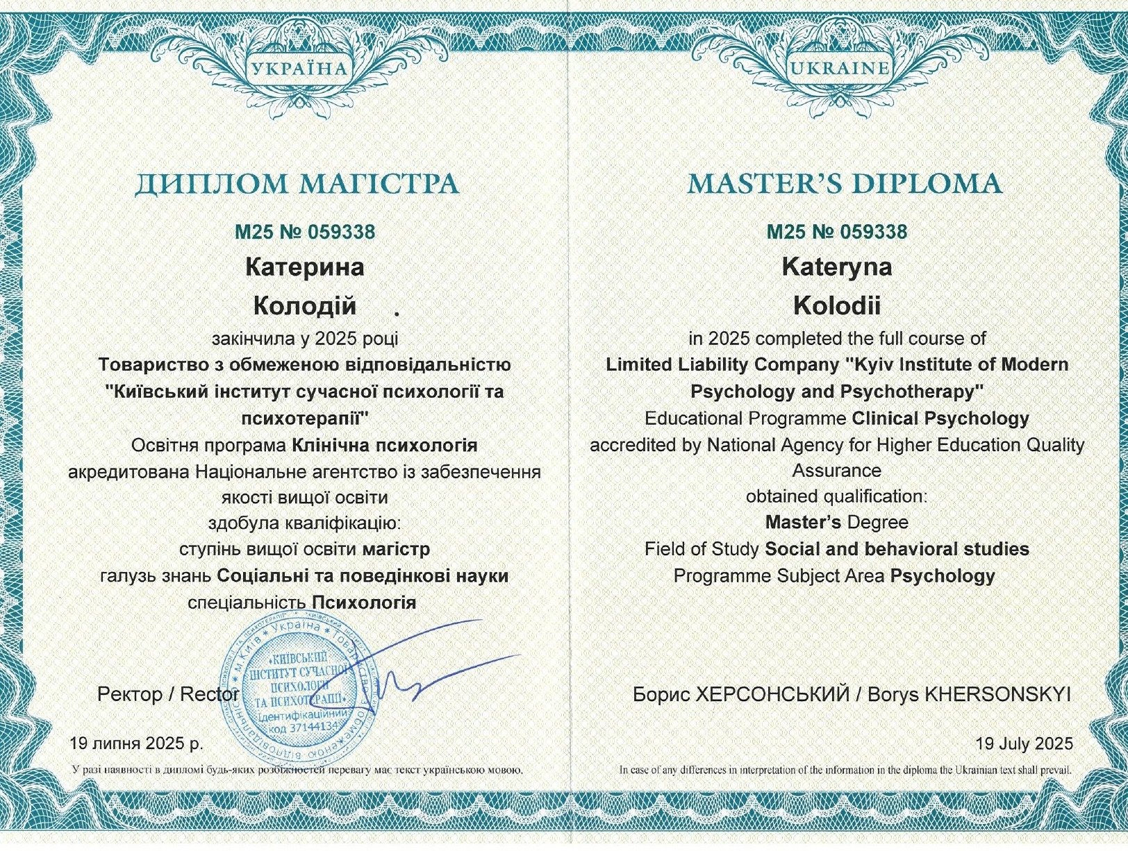 Я – клиническая психологиня. В работе объединяю структурность и мягкость: помогаю лучше понимать свои реакции, снижать напряжение и строить внутреннее сопротивление. Работаю с темами тревожности, внутриличностных конфликтов, самокритики, эмоционального истощения и периодов перемен. Провожу индивидуальные консультации онлайн/оффлайн (в зависимости от твоего формата).
