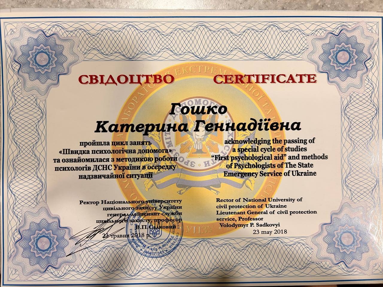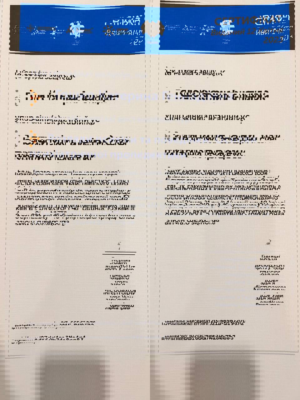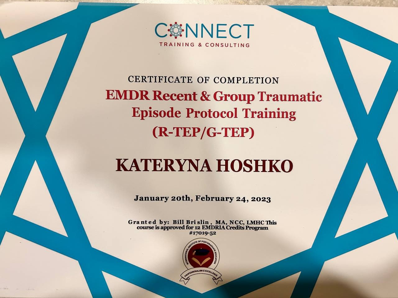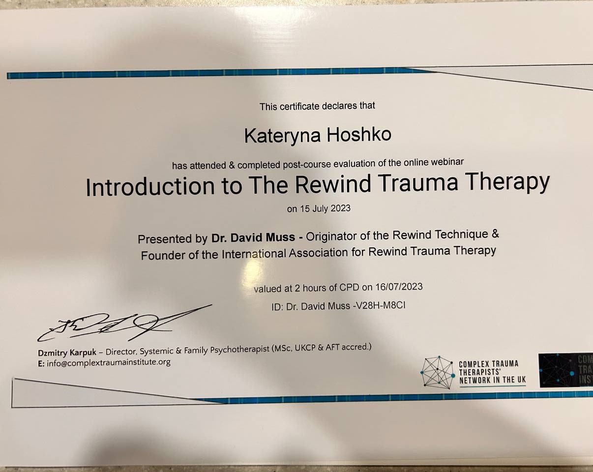Диплом клинического психолога по направлению «Травматерапия» Международного института последипломного образования, окончившего в 2024 году.