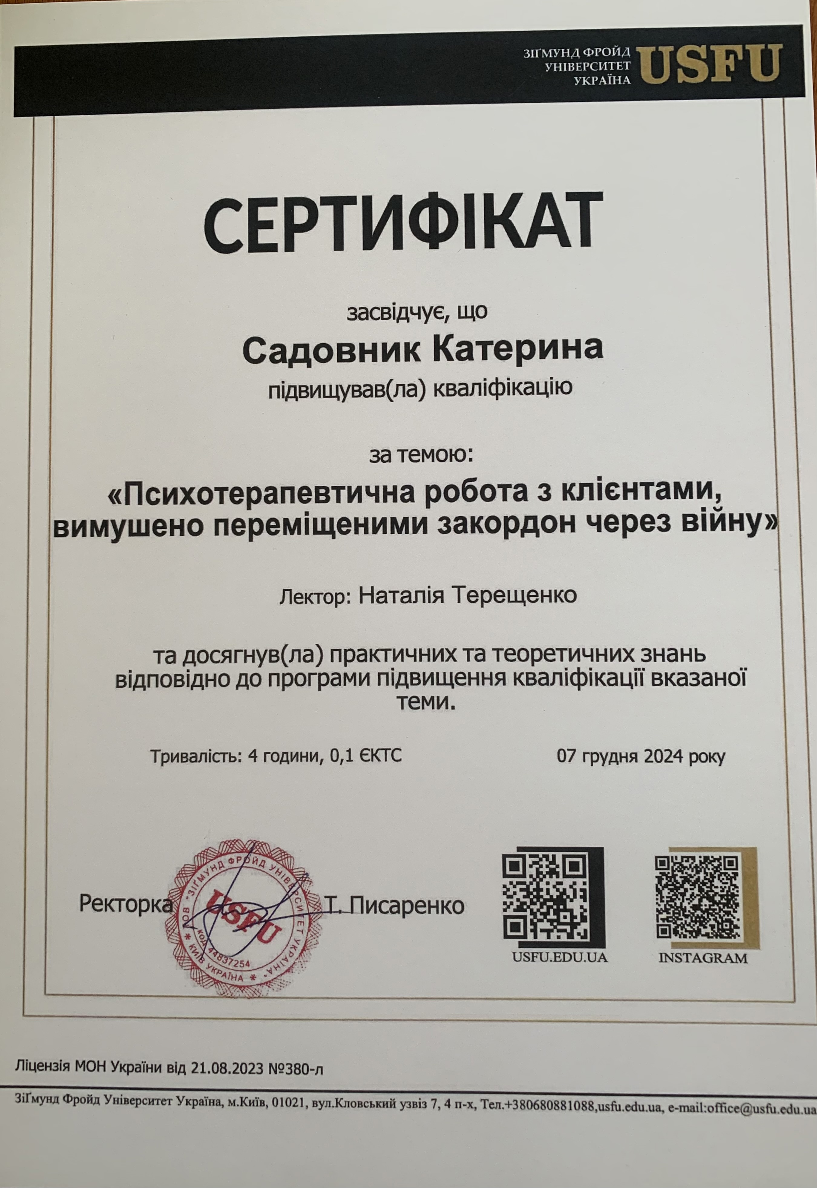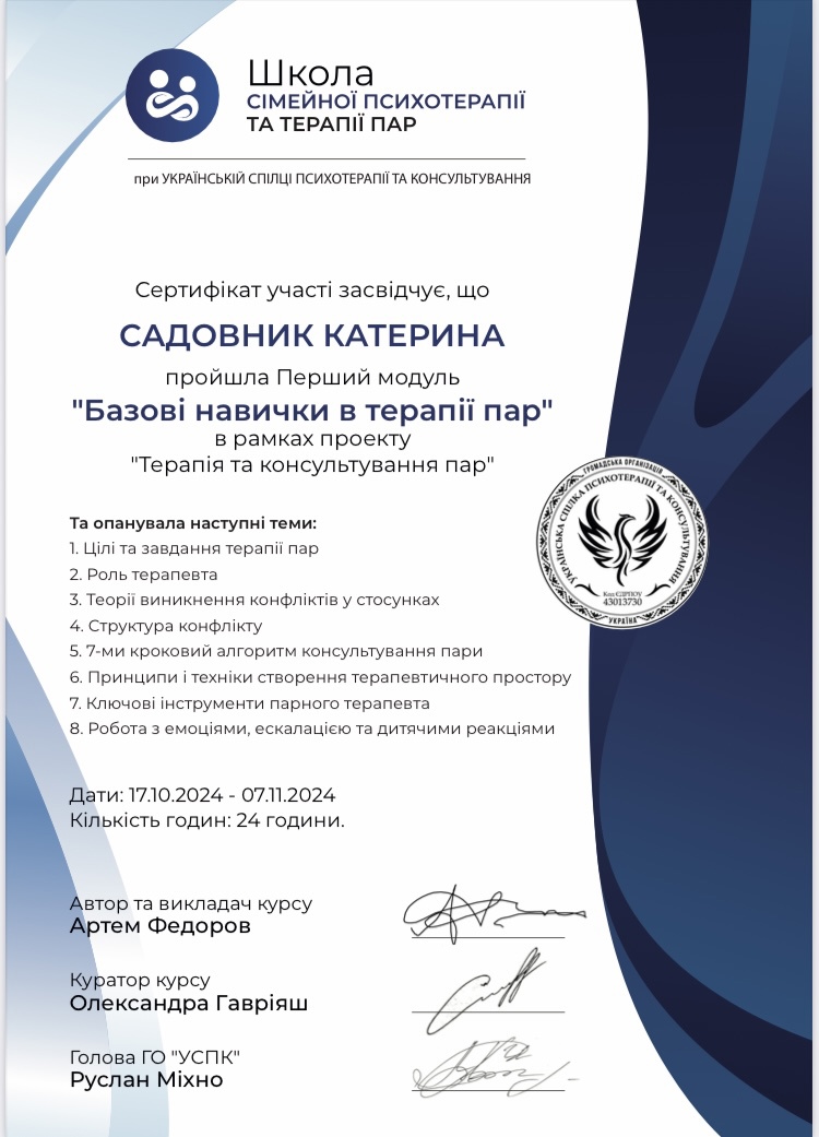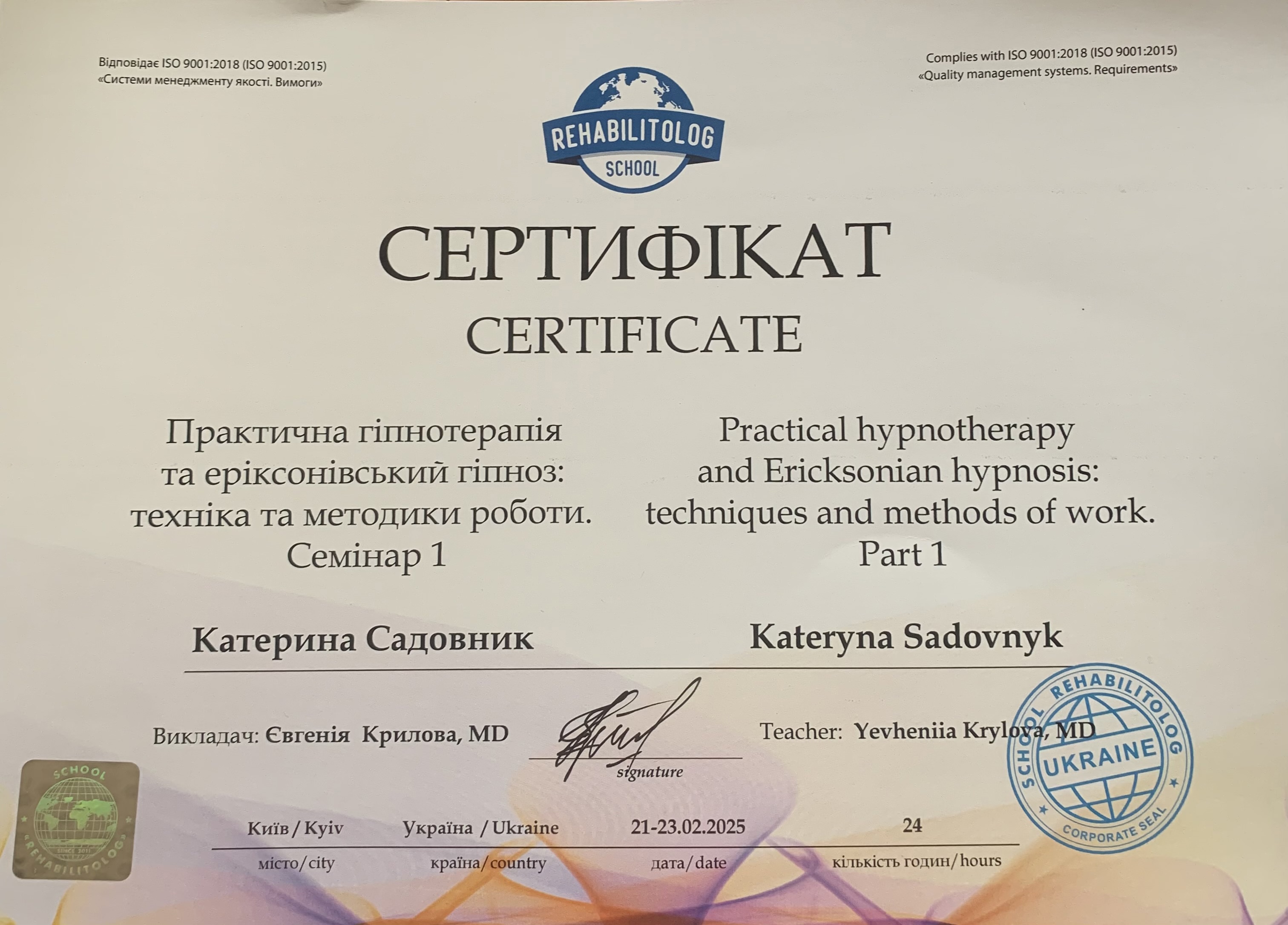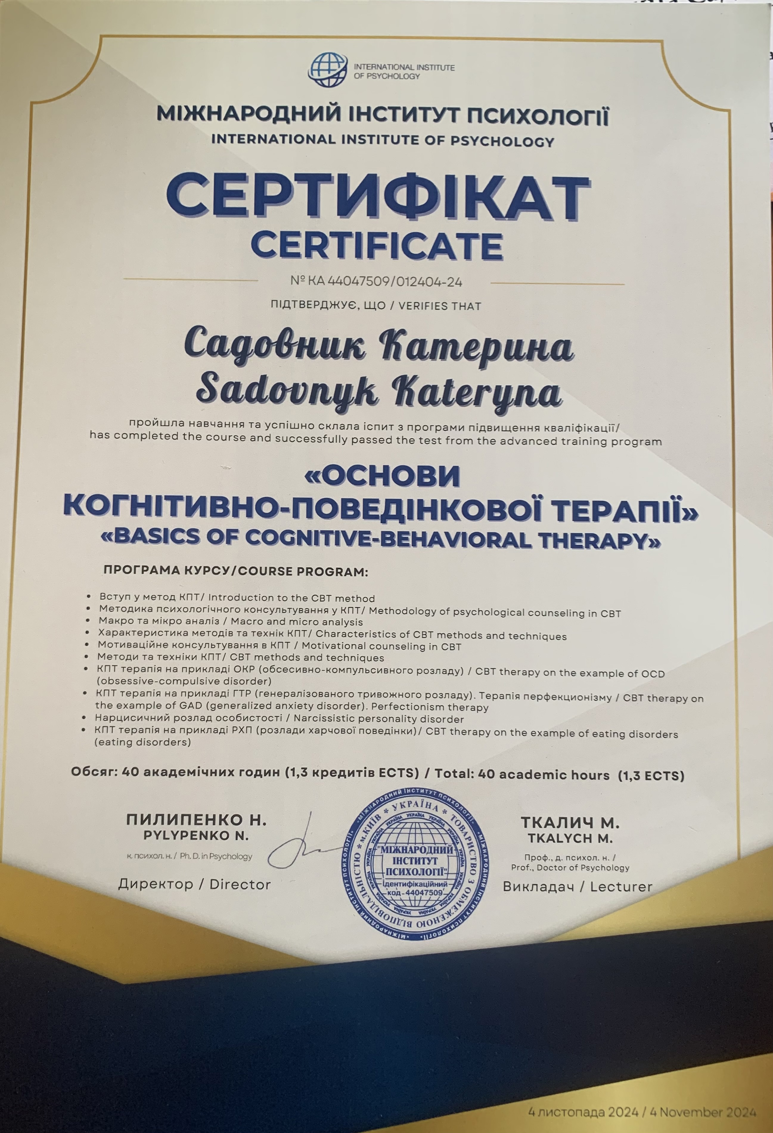 Я Катерина Садовник. Лікар, клінічний психолог, психосоматолог, гіпнотерапевт. Психологія моє покликання, отримую задоволення від роботи і надихаюся результатами моїх клієнтів. Маю знання, життєвий досвід, маю емпатію, люблю людей і життя. У мене прекрасна сім'я, троє дорослих дітей, одружена 34 роки. Я допомагаю людям справлятися з проблемами, знайти першопричину, змінити життя на краще, налагодити відносини з оточуючими, але перш за все з собою. Я знаю, що в наших силах бути щасливими, здоровими і жити в гармонії з собою і навколишнім світом.