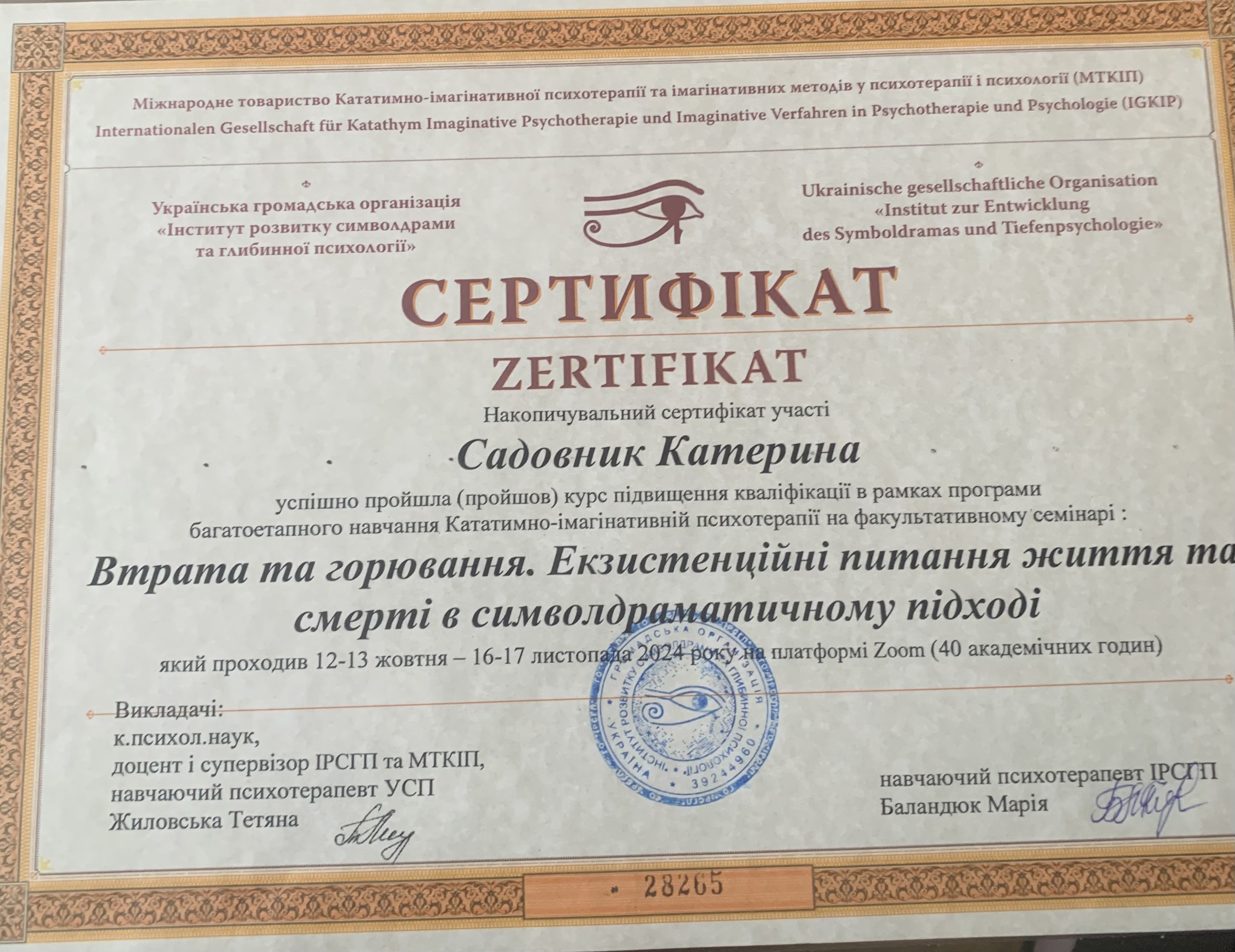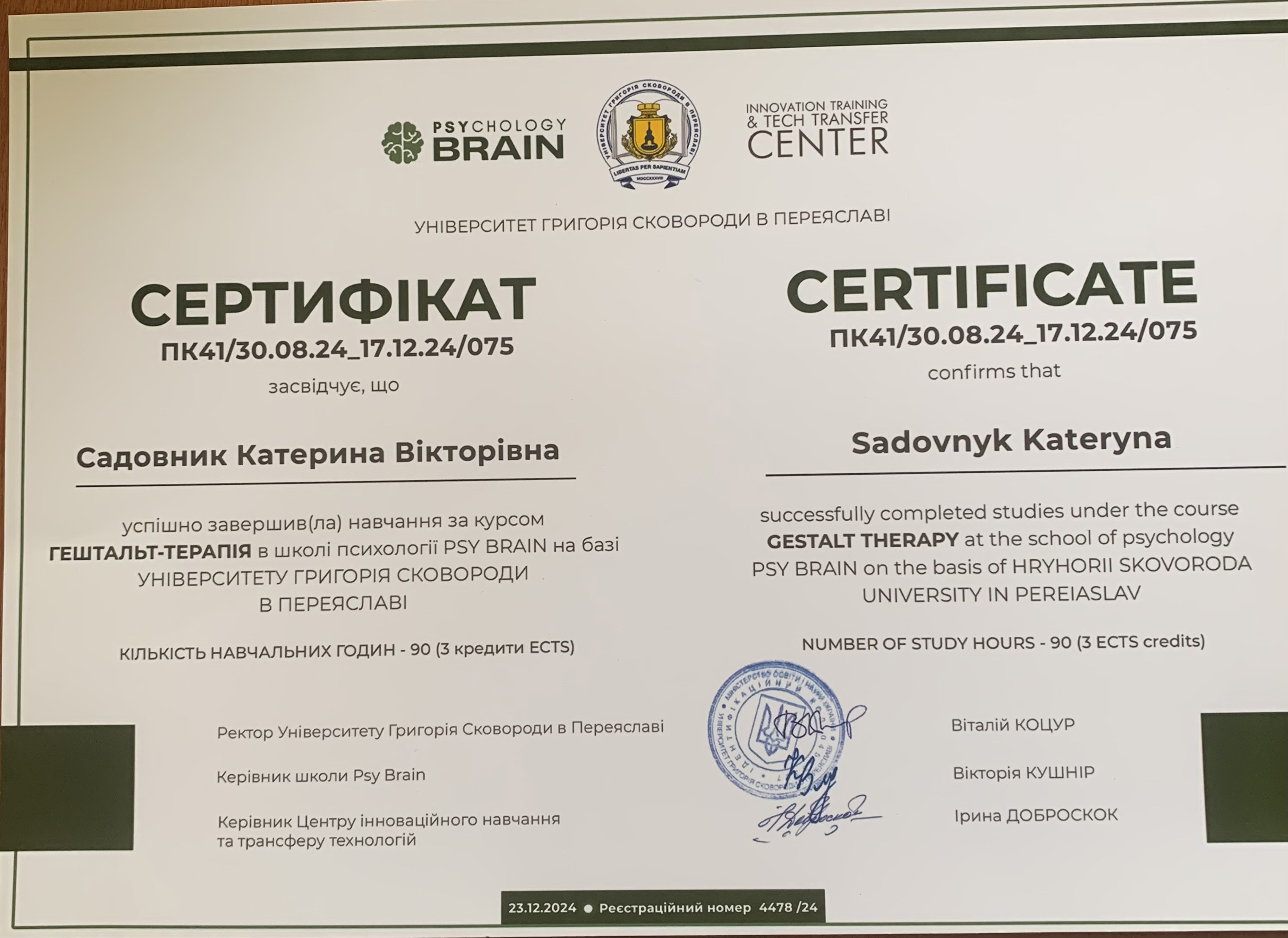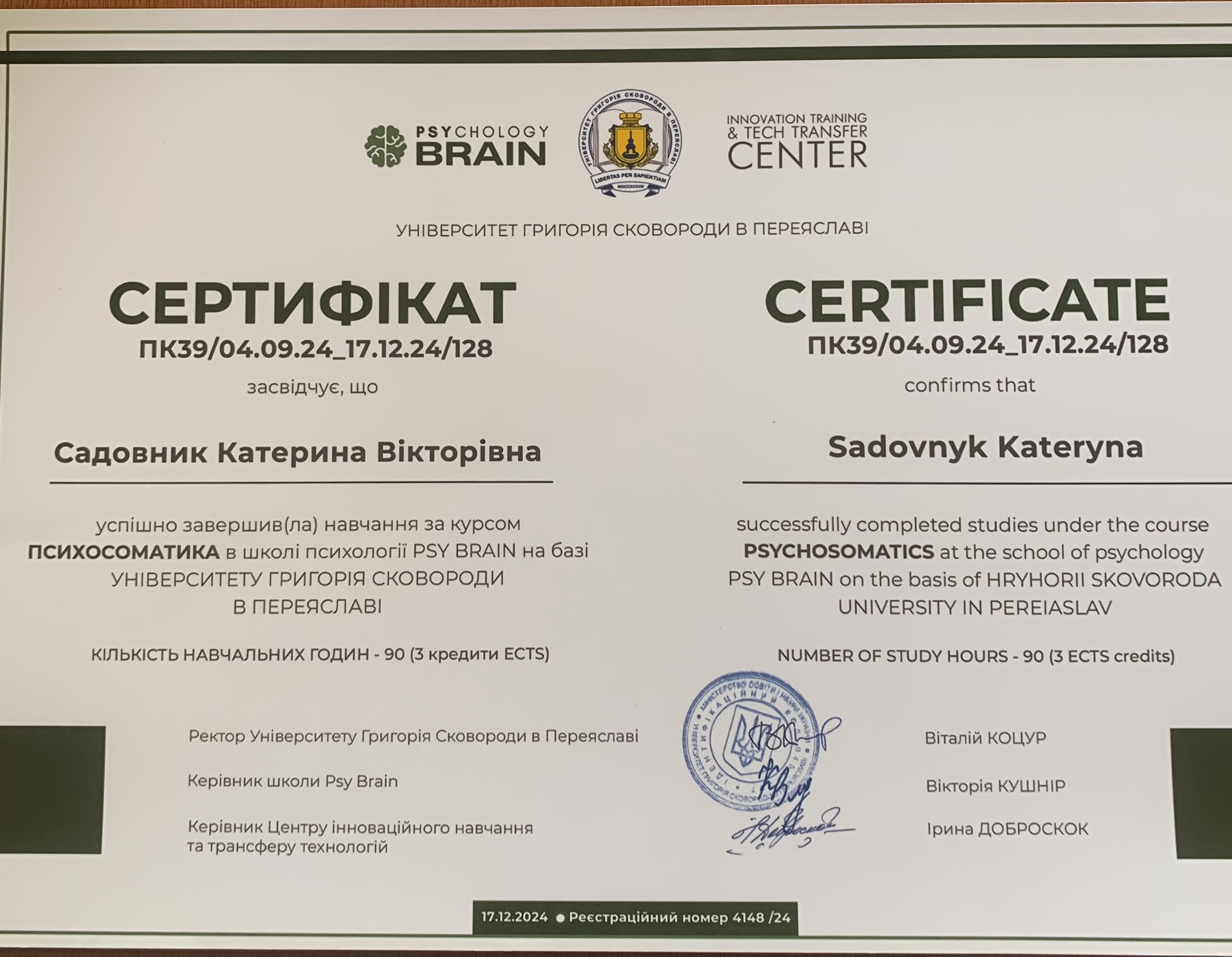 Я Катерина Садовник. Лікар, клінічний психолог, психосоматолог, гіпнотерапевт. Психологія моє покликання, отримую задоволення від роботи і надихаюся результатами моїх клієнтів. Маю знання, життєвий досвід, маю емпатію, люблю людей і життя. У мене прекрасна сім'я, троє дорослих дітей, одружена 34 роки. Я допомагаю людям справлятися з проблемами, знайти першопричину, змінити життя на краще, налагодити відносини з оточуючими, але перш за все з собою. Я знаю, що в наших силах бути щасливими, здоровими і жити в гармонії з собою і навколишнім світом.