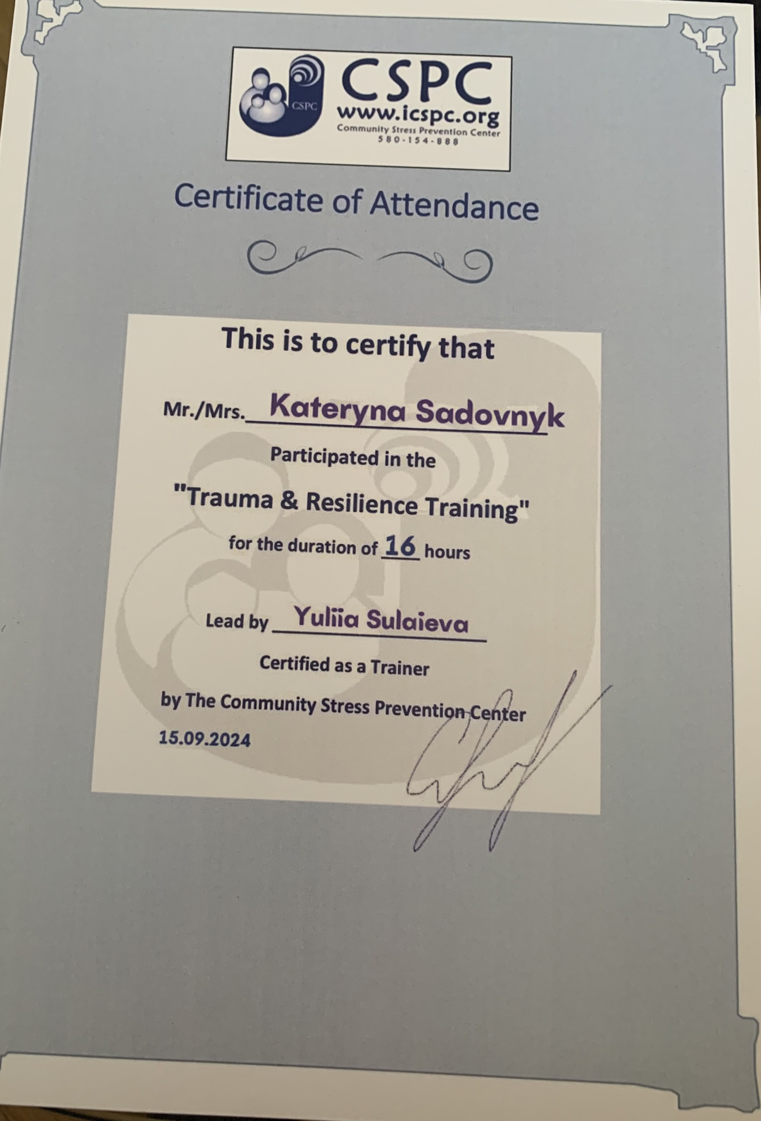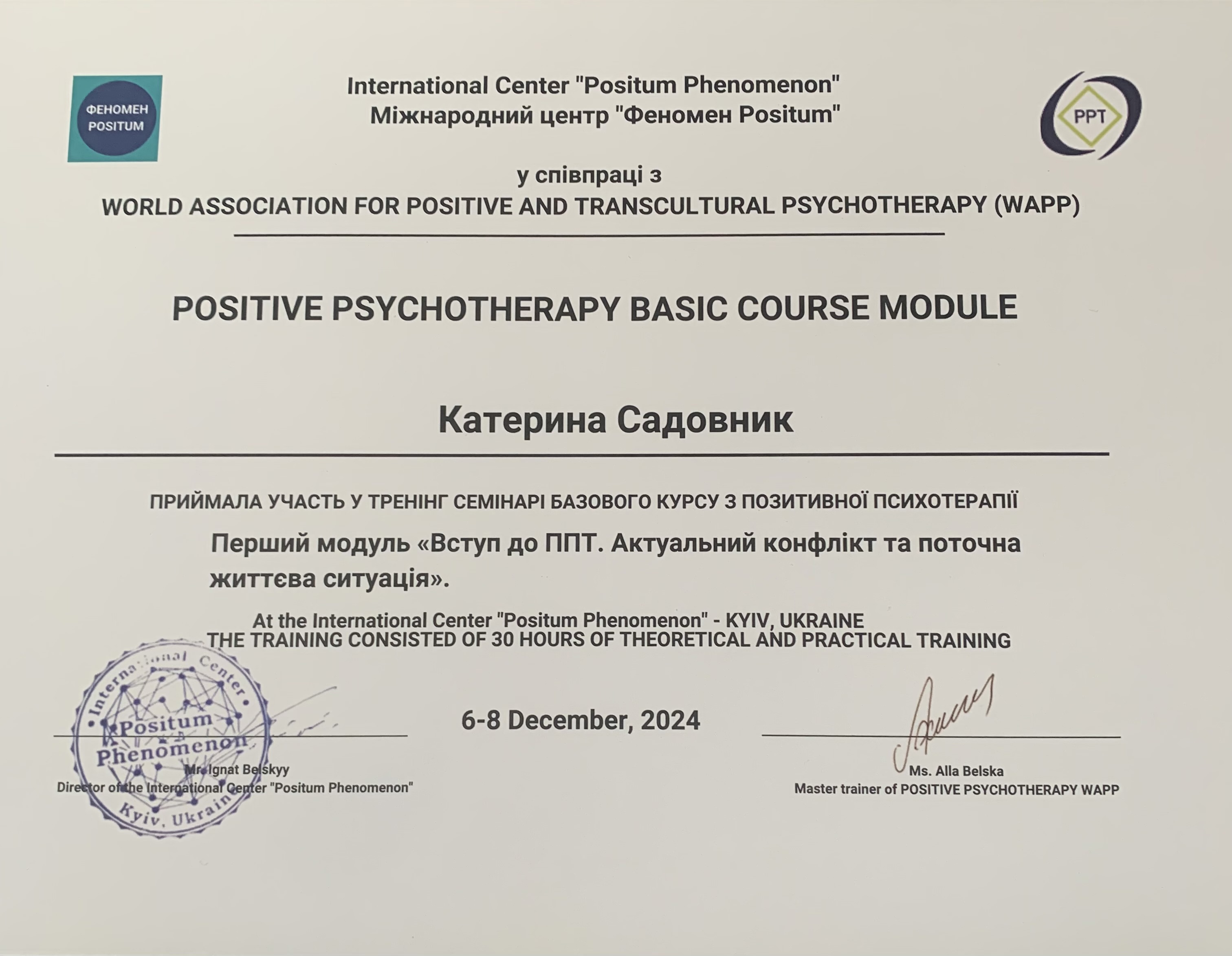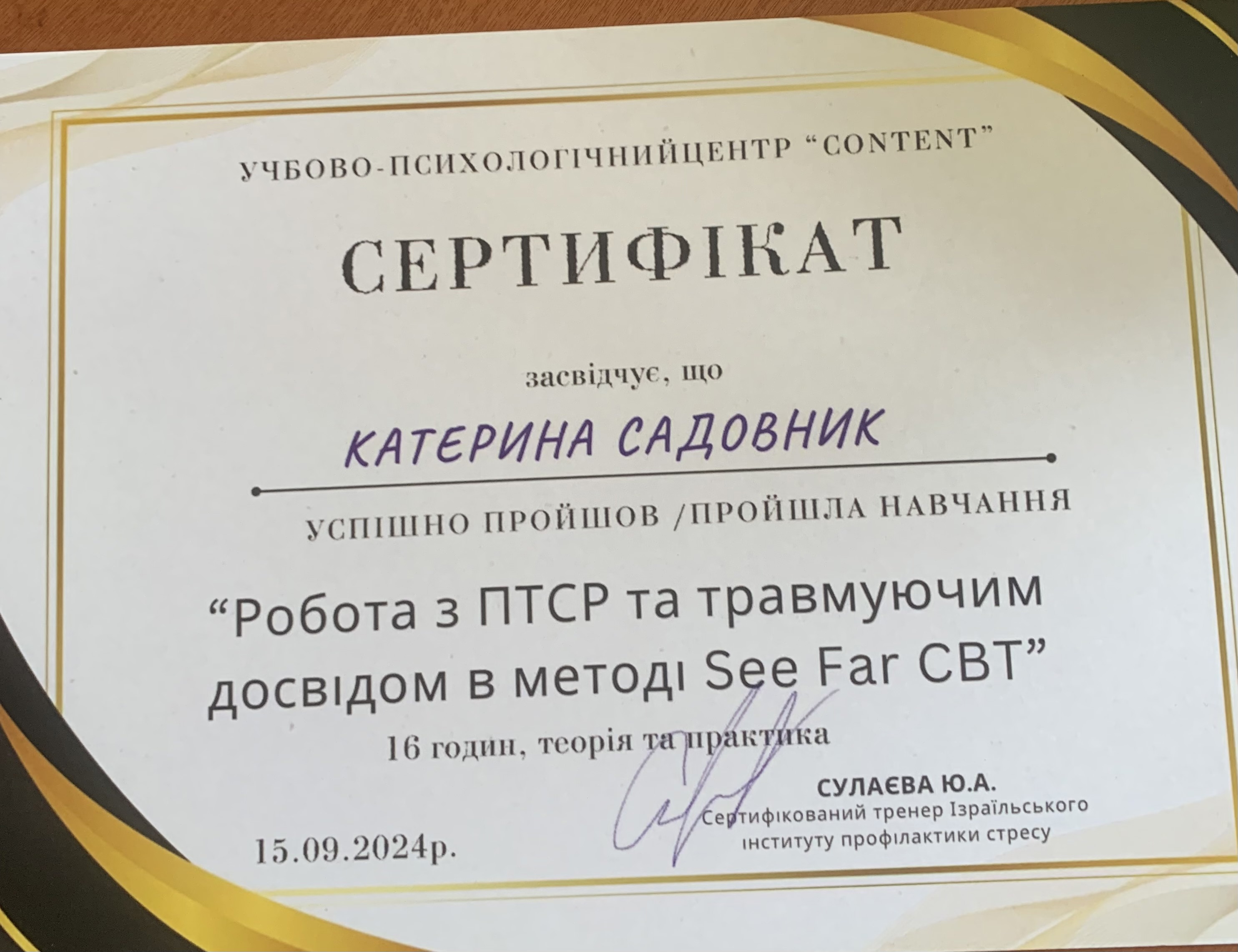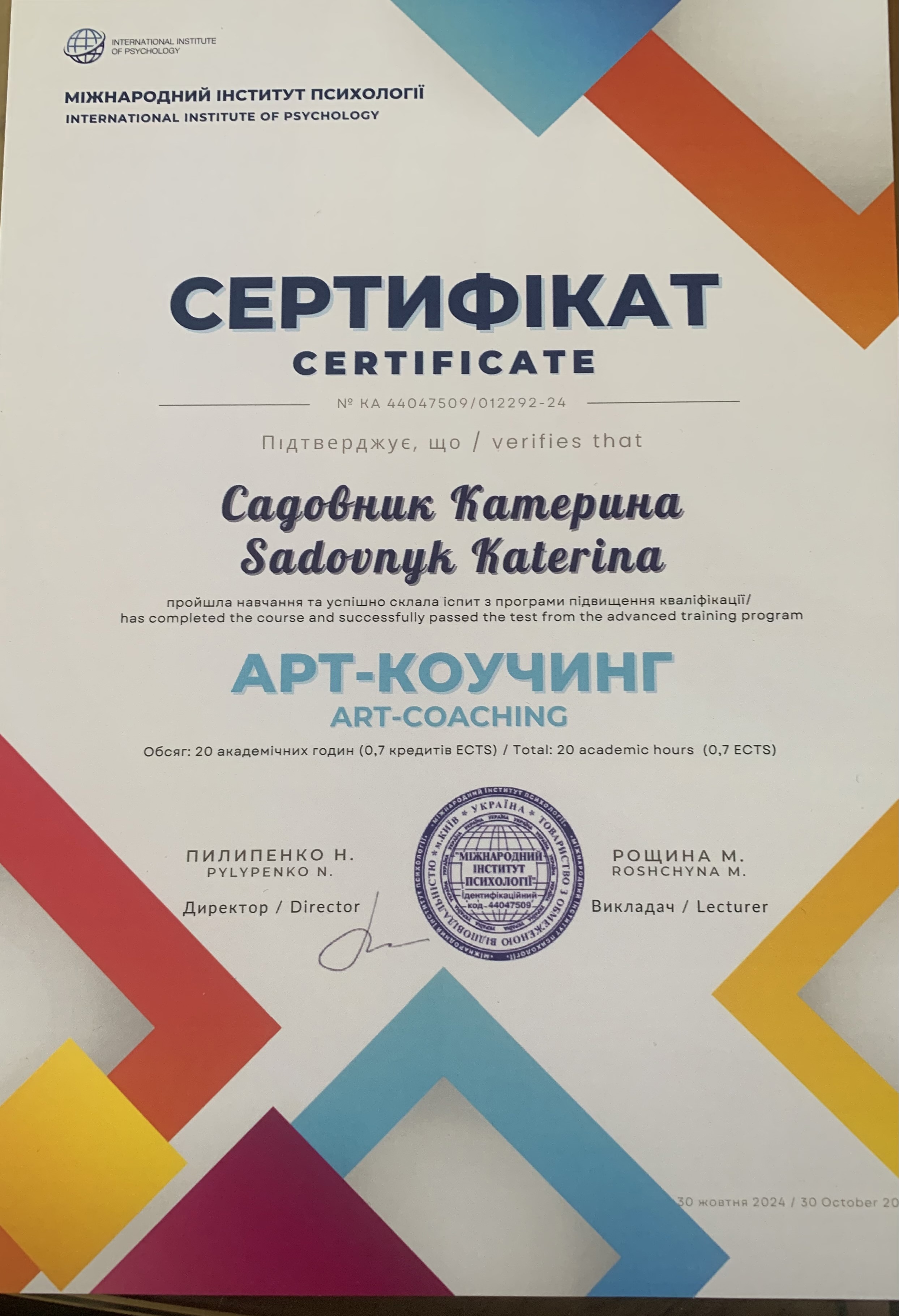 У житті кожної людини бувають складні ситуації і не завжди людина може впоратися з ними!!! Так було і зі мною. Я впоралася. Після терапії я краще розумію себе і своє оточення, свої почуття і потреби. Я навчилася по-іншому дивитися на різні життєві ситуації і ставитися до них спокійно, керувати своїми емоціями, почуттями, що допомогло мені вибудувати гармонійні стосунки в сім'ї і моєму оточенні. Моє життя стало більш усвідомленим і продуктивним. Знайшла внутрішній спокій.