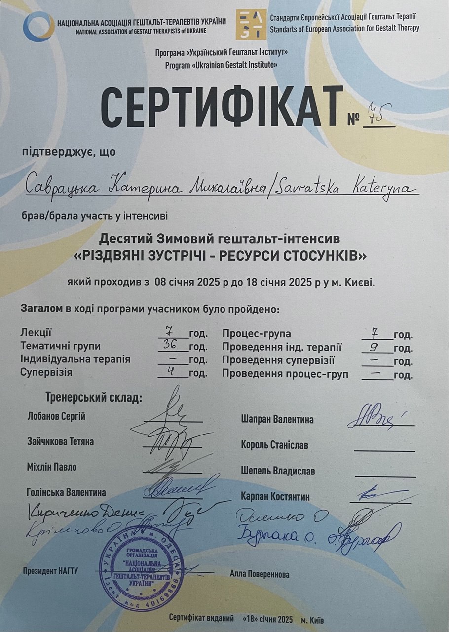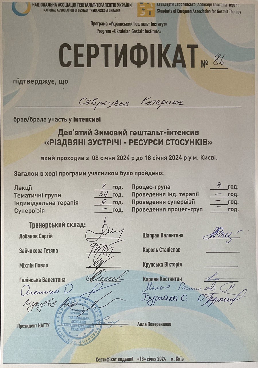 Проходила курсы повышения квалификации в Институте последипломного образования по направлению Основы травмотерапии.