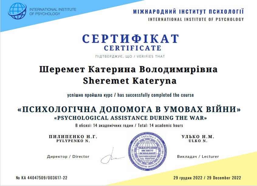 2021 – 2022, Школа психологической практики Анны Дердюк, Киев; квалификация: психолог-консультант.