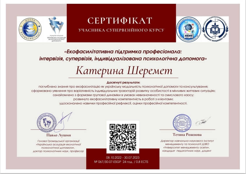 С февраля 2024 г. – членство в ОО "Украинская ассоциация экологической психологической помощи"
