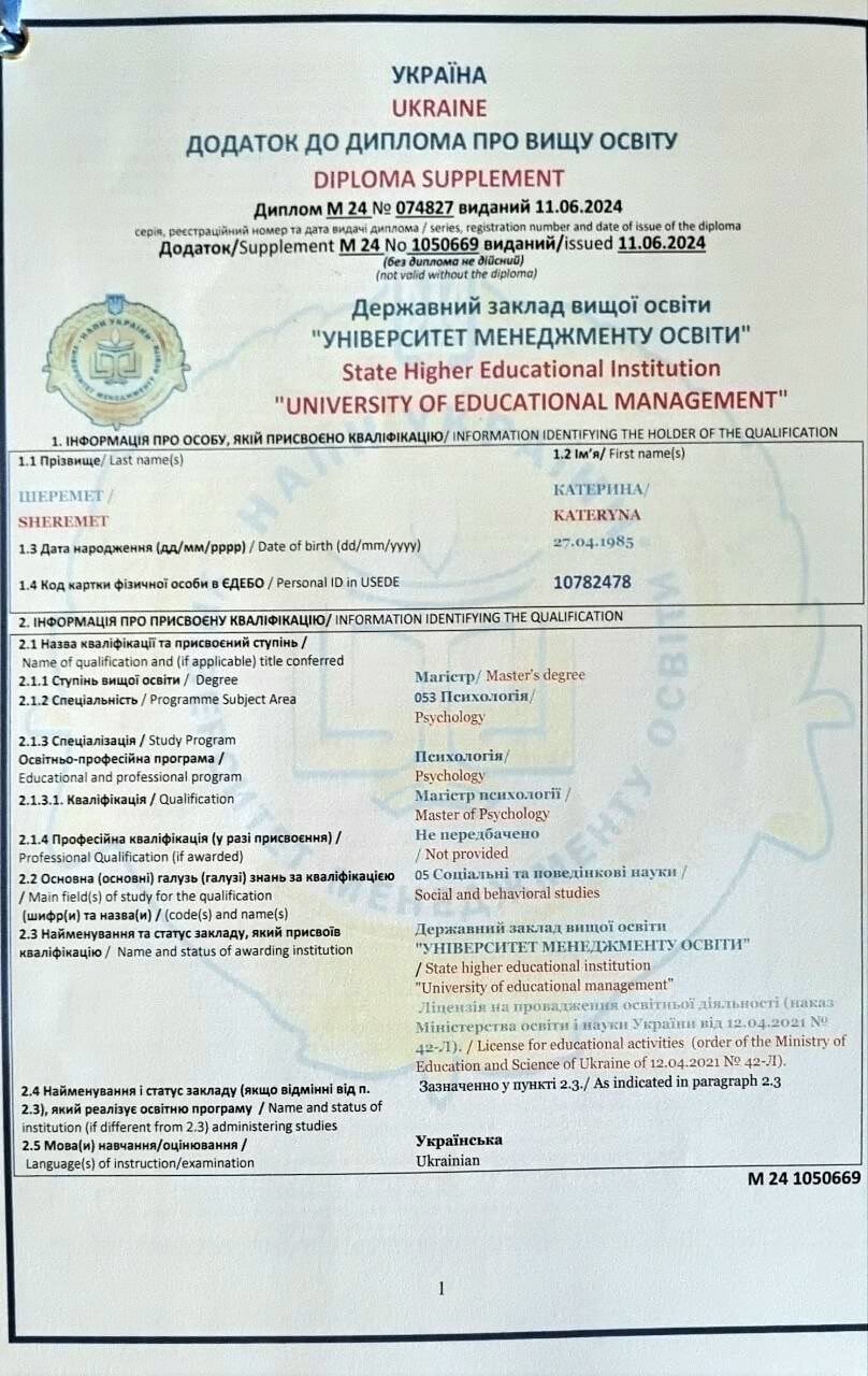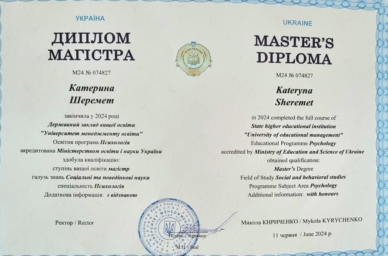 Сейчас учусь в ГЗПО "Университет менеджмента образования", на магистратуре, по специальности "053 Психология" (2022 – 2024).